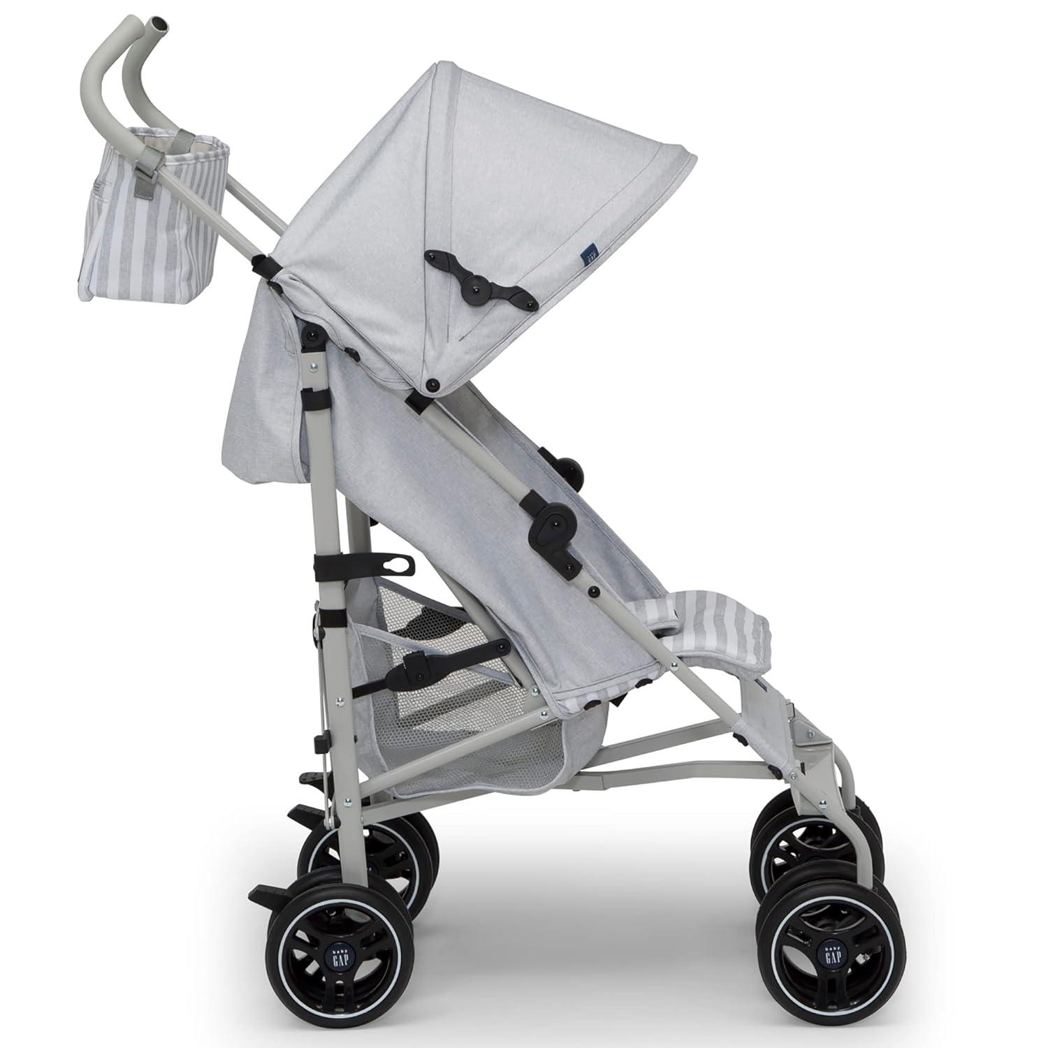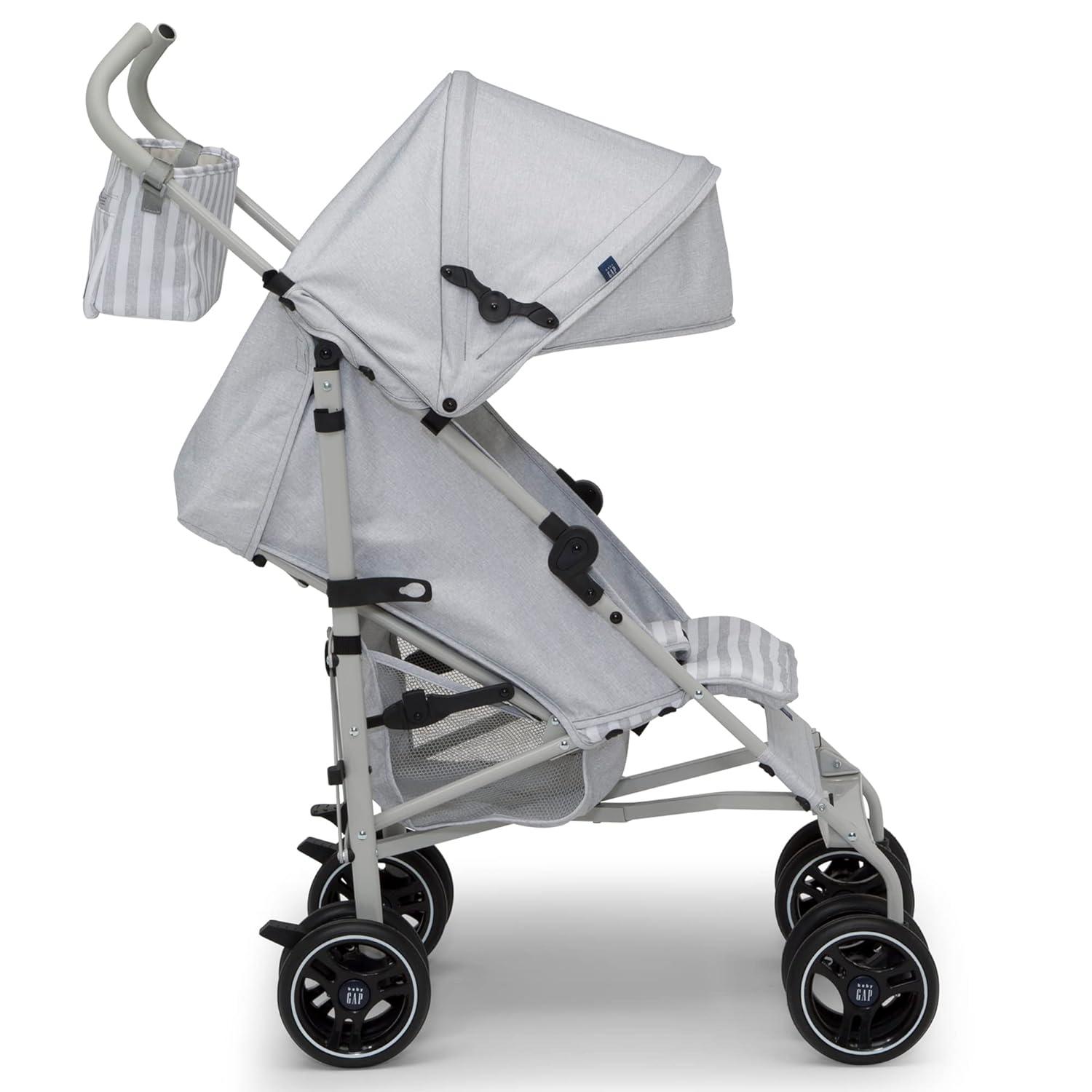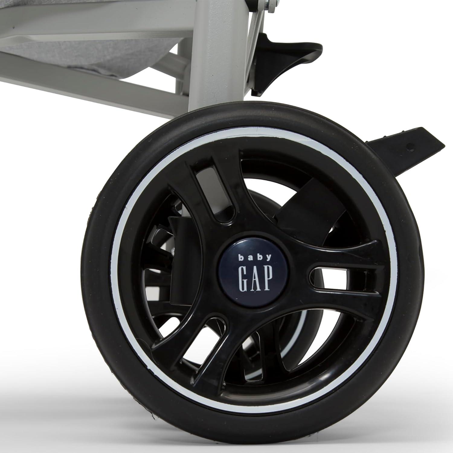 Introducing the babyGap Classic Stroller: The most responsibly made lightweight stroller. Designed for the future in every possible way, all the soft fabrics on the stroller are made from recycled water bottles. Plastic drinking bottles are sorted, cleaned and shredded into flakes that become the yarn the seat fabric is made from. A great choice for your child and the planet, this everyday stroller is outfitted with front wheels that features precision technology for outstanding control and effortless push, making it easier than ever to glide, turn and maneuver any surface. Incredibly cozy, the stroller has an extra-large extendable canopy with sun visor, reclining seat and tons of storage. The extra-large storage basket and removable parent organizer ensure there’s always enough room for all your baby’s on-the-go essentials. Ideal for travel or everyday use, the stroller’s durable steel frame only weighs 14.5 pounds and the compact fold, auto lock and carry handle make it easy to transport. Uniquely babyGap, the stroller has the easily recognized babyGap logo and iconic Brannan Bear on the wheels, canopy, calf rest, parent organizer and safety harness for an elevated look. This stroller is recommended for infants 9 months up to 50 pounds.