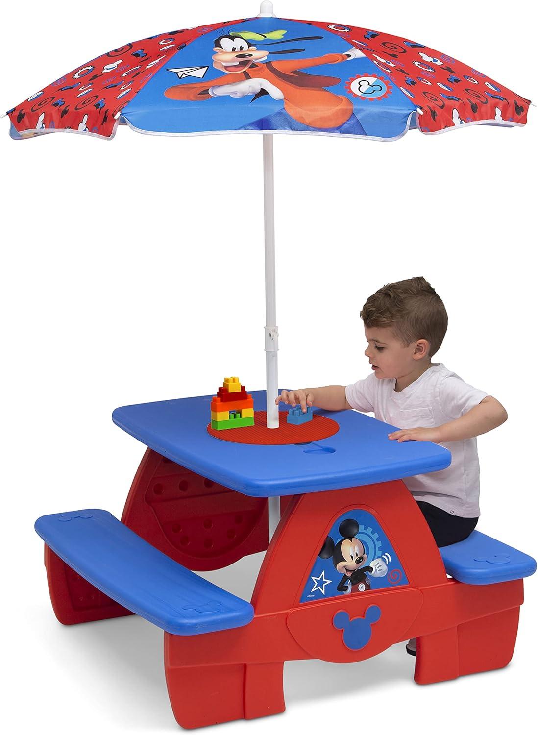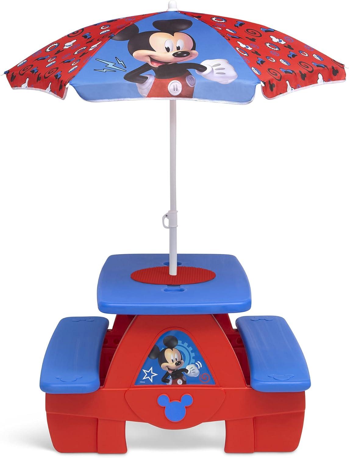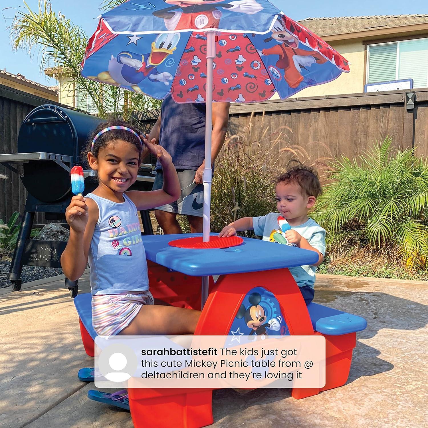 Delta Children 4 Seat Activity Picnic Table with Umbrella and Lego Compatible Tabletop, PAW Patrol(Mickey Mouse)