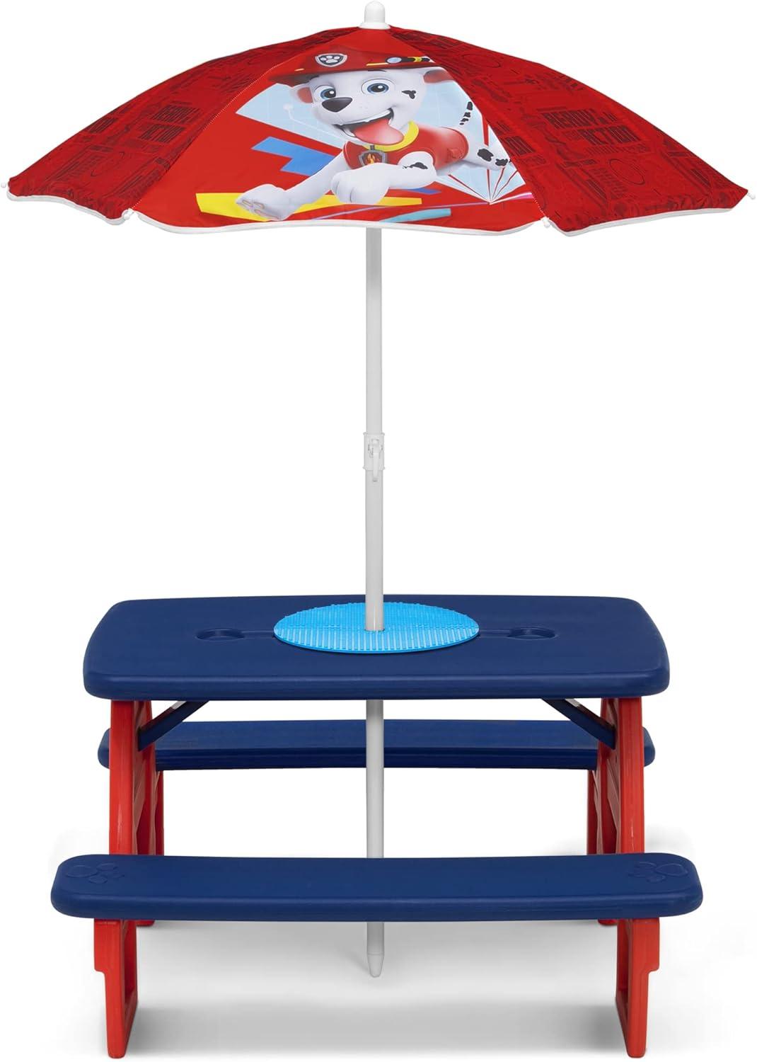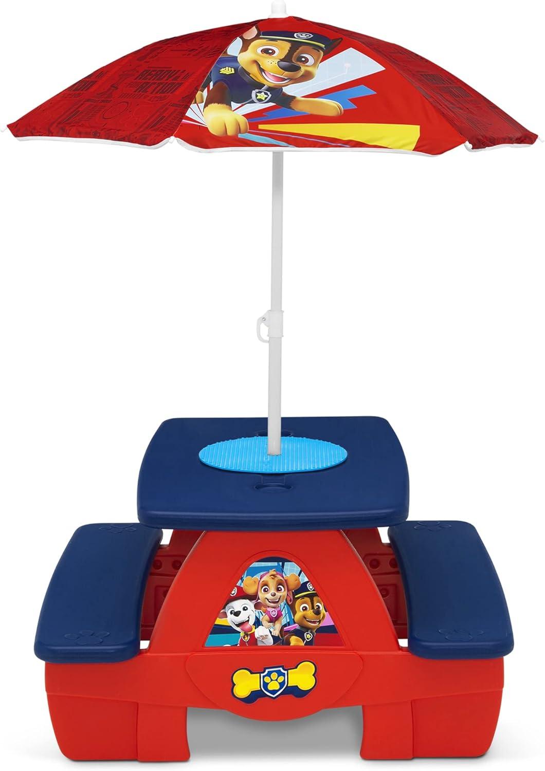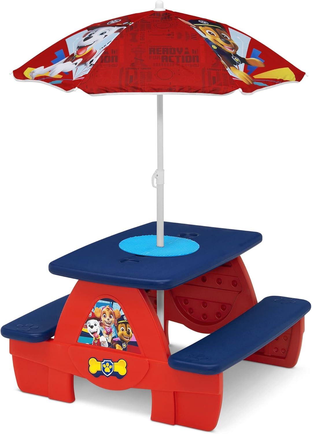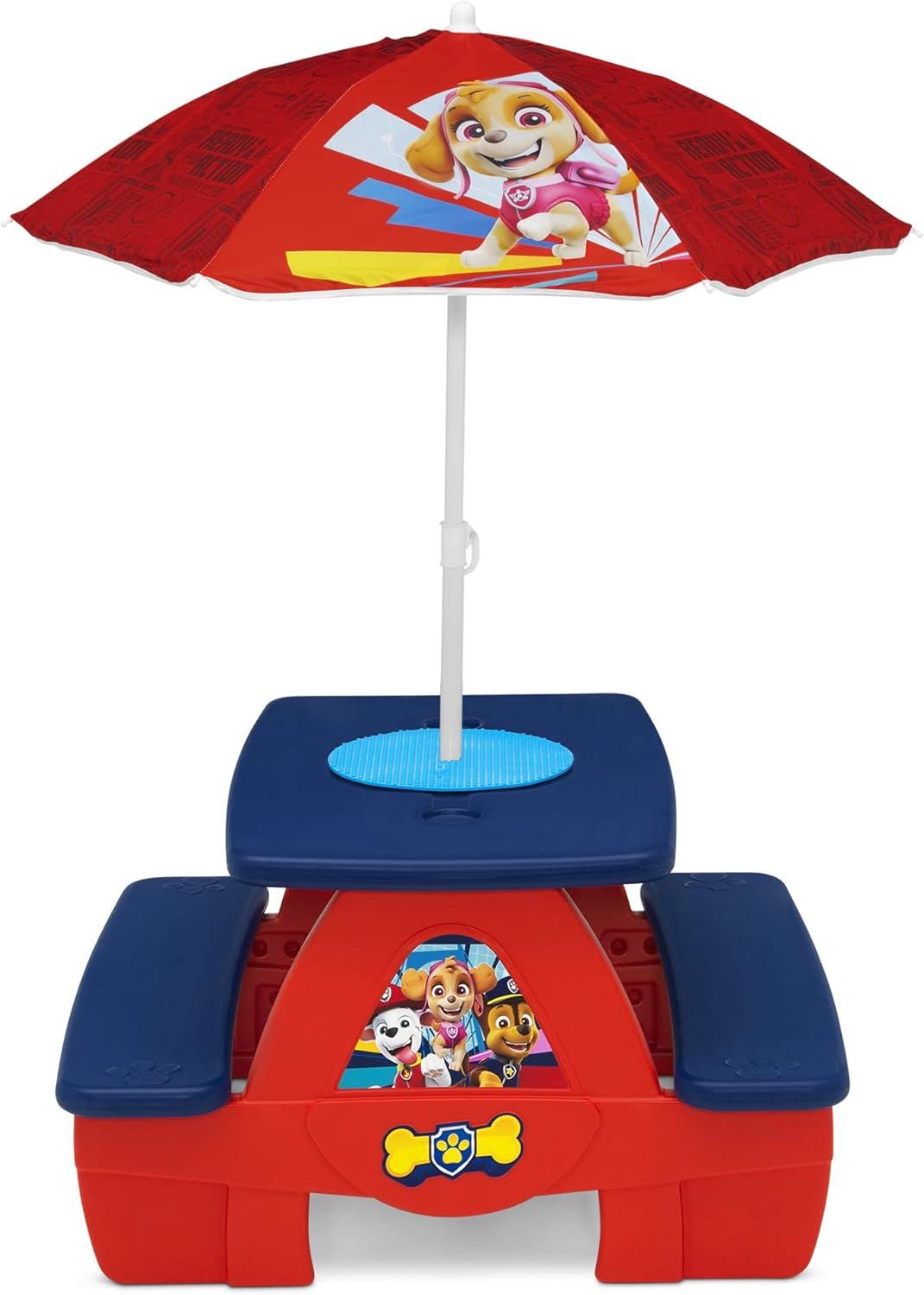 Be prepared for backyard barbecues and playdates with the PAW Patrol 4 Seat Activity Picnic Table with Umbrella and Lego Compatible Tabletop by Delta Children. Made from weather-resistant plastic, this durable picnic table sits four kids comfortably, and can be used outdoors or indoors for eating, playing, art activities or games–there are so many ways to use this sturdy picnic table! Designed to boast and encourage your child’s imagination the table features a removable building block board that is compatible with LEGO blocks (LEGO blocks not included). Colorful graphics of Chase, Marshall and Skye and three-dimensional paw prints add playful style that little ones will love while the included umbrella provides much needed shade on sunny days. Easy to assemble, the table snaps together in minutes, so you’ll be ready for fun in no time! About PAW Patrol: From Marshall the firedog to Chase the police pup to Skye, who flies high in her copter, each pup brings unique personality and skill to the team, modeling the importance of teamwork and good citizenship. They all have special pup packs on their backs to help them handle anything – from rescuing kittens to saving a train from a rockslide! No matter how big the adventure, the PAW Patrol always has time for a game, A laugh, and an ear scratch from Ryder.