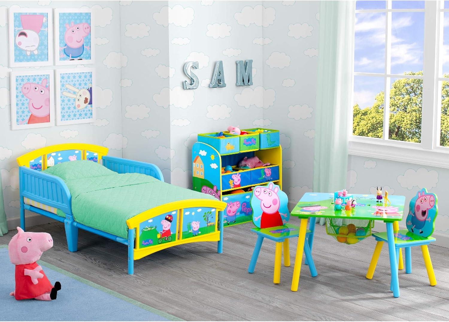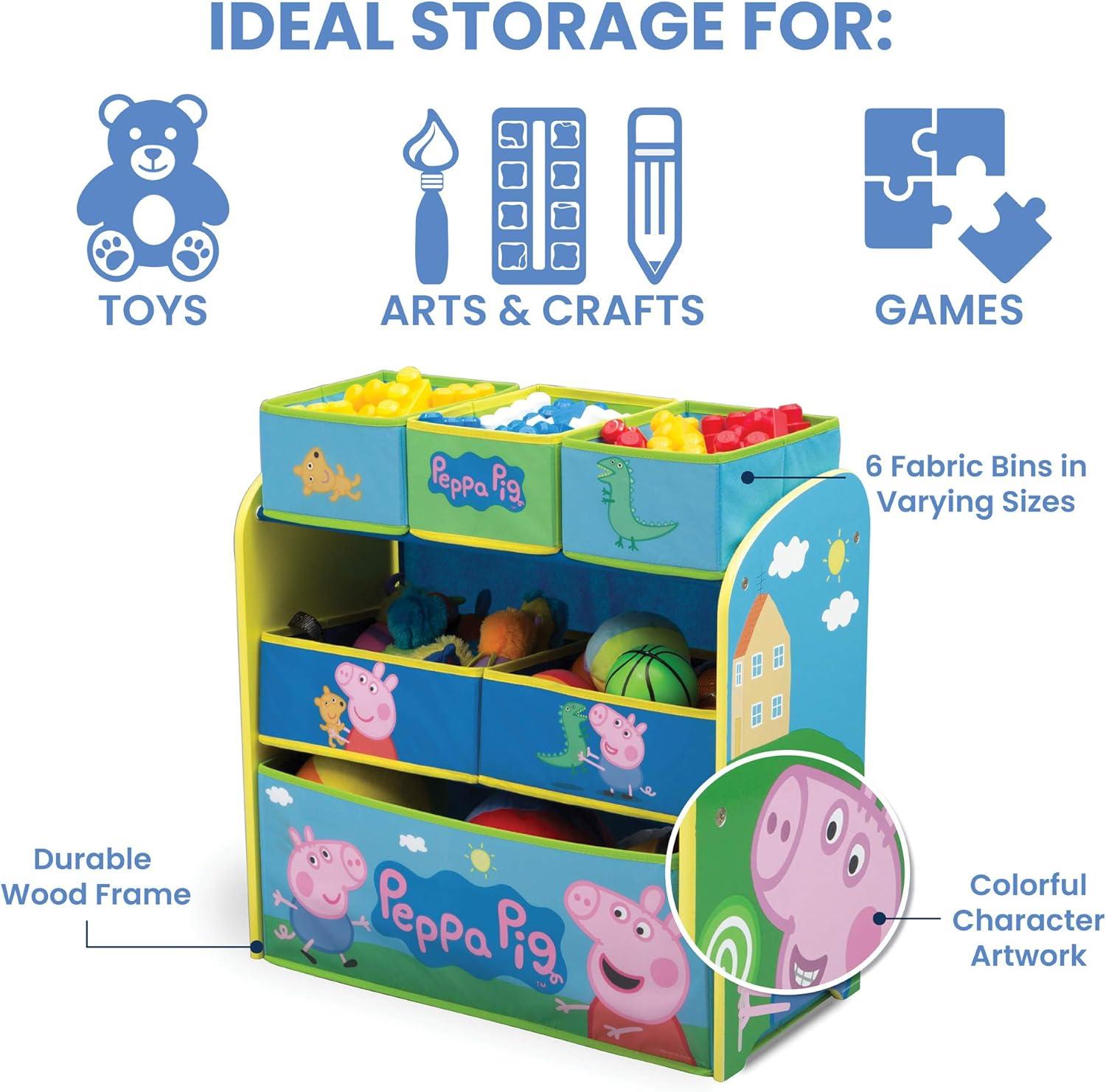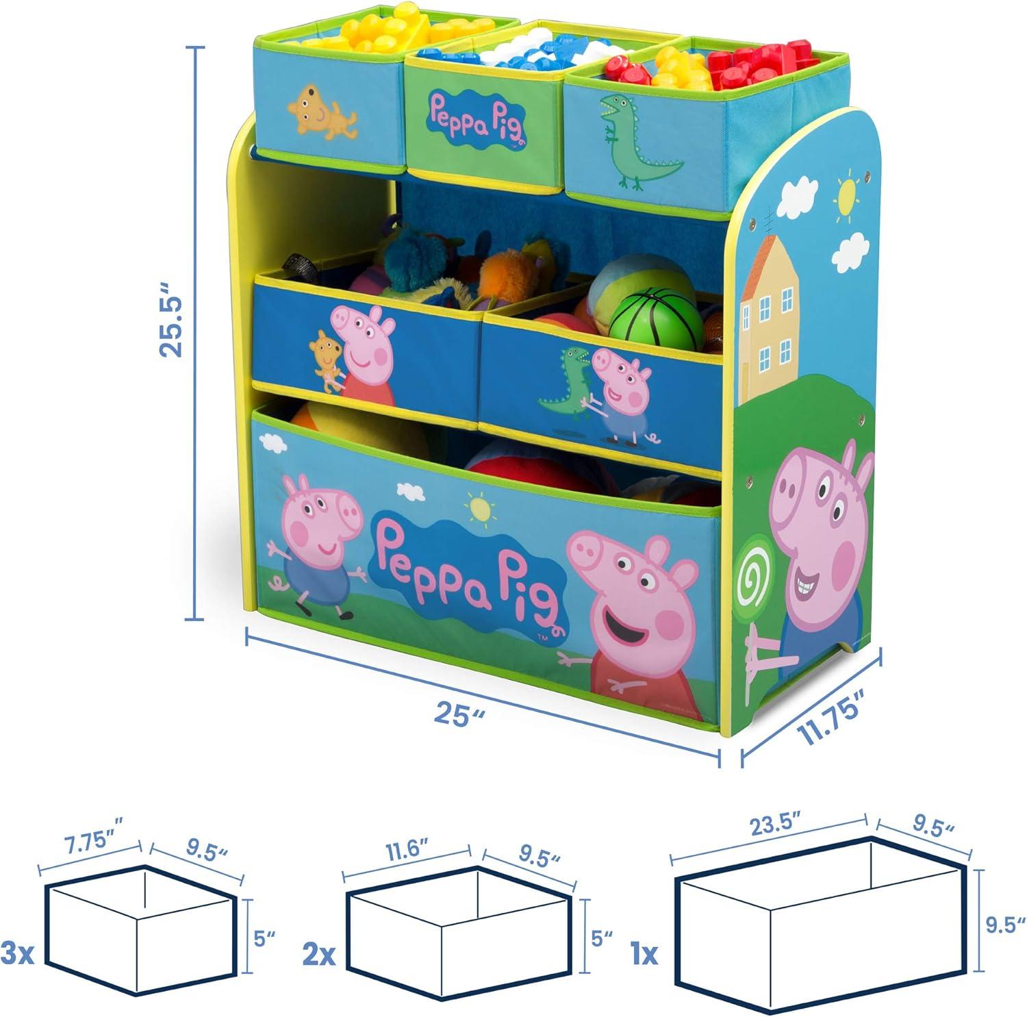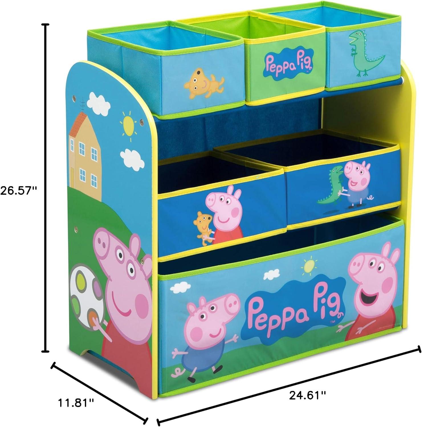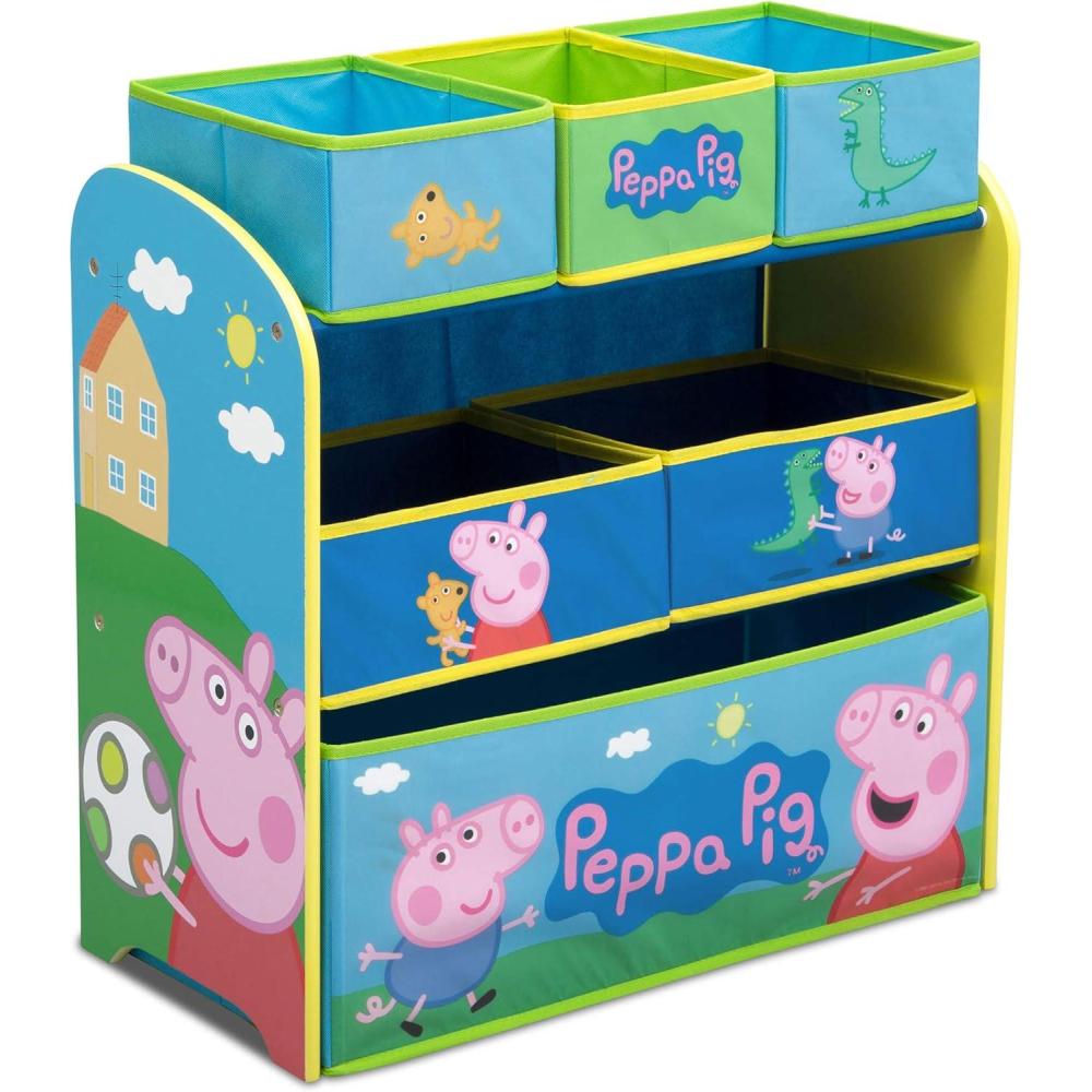 Don't let your playroom become a sty-the Peppa Pig Multi-Bin Toy Organizer from Delta Children will help make cleaning up fun and easy. Covered in colorful graphics of Peppa, Mummy Pig, Daddy Pig and George, this practical storage solution is supported by a sturdy frame and features six uniquely sized fabric bins to fit toys of all shapes and sizes. About Peppa Pig: Peppa is a lovable, cheeky little pig that lives with Mummy, Daddy, and little brother George. Peppa's favorite things include her family, friends and fun learning. Her adventures always end happily with loud snorts of laughter. To complete your child's room, explore Delta Children's complete collection of Peppa Pig furniture based on the beloved show.