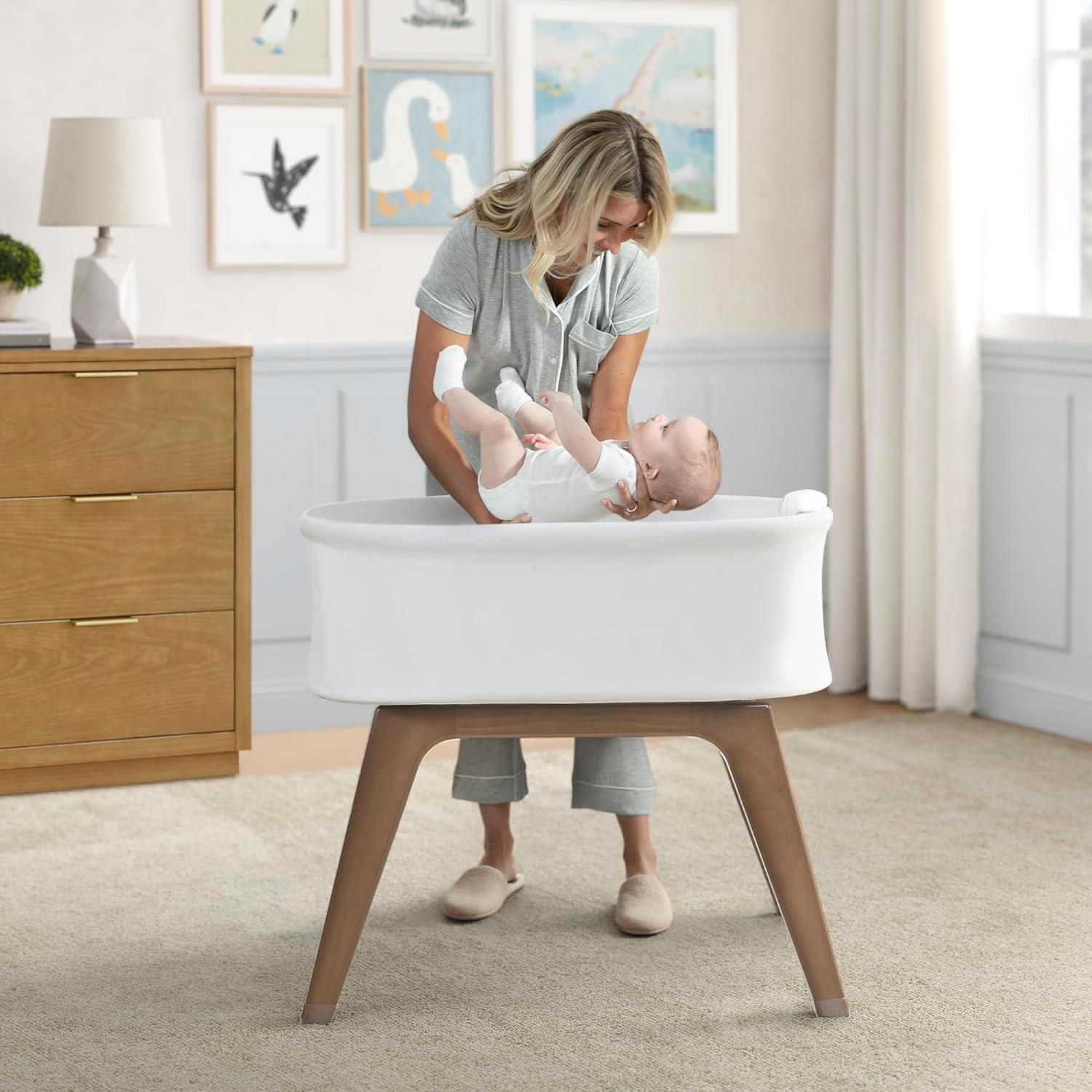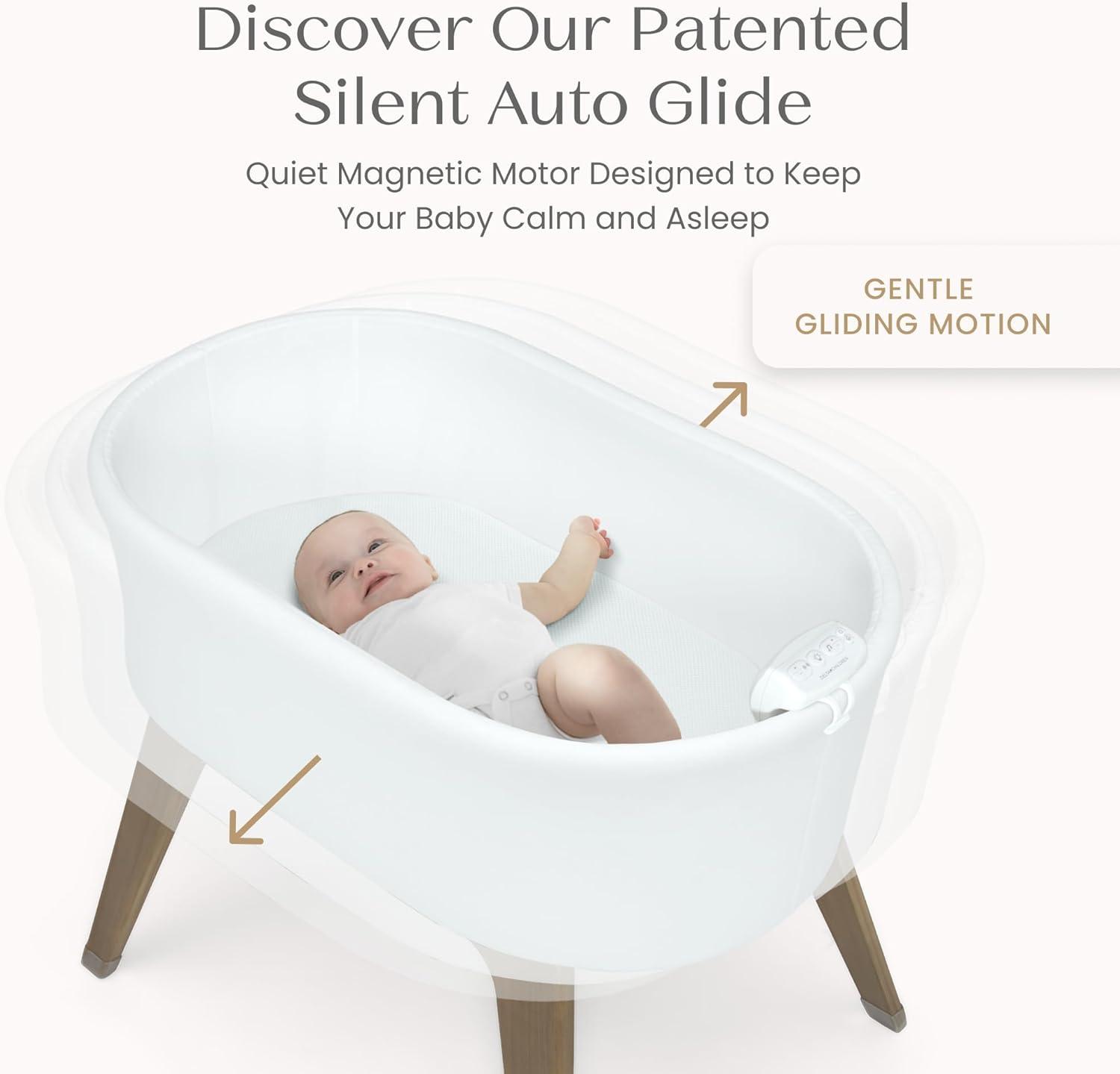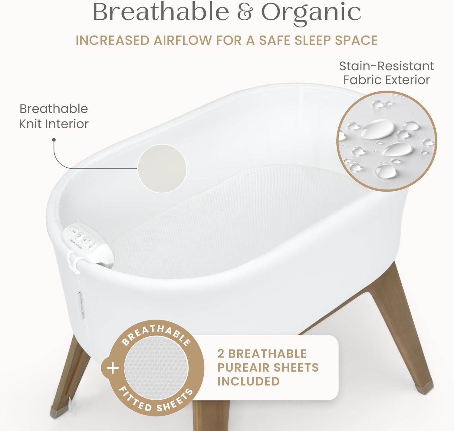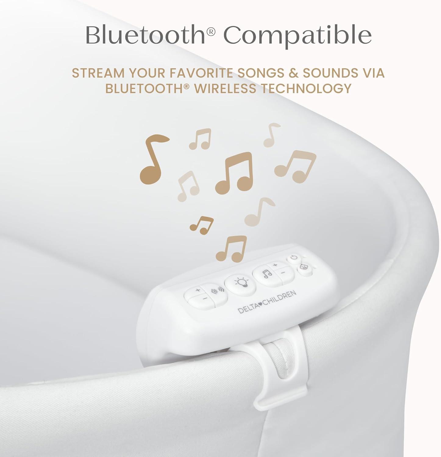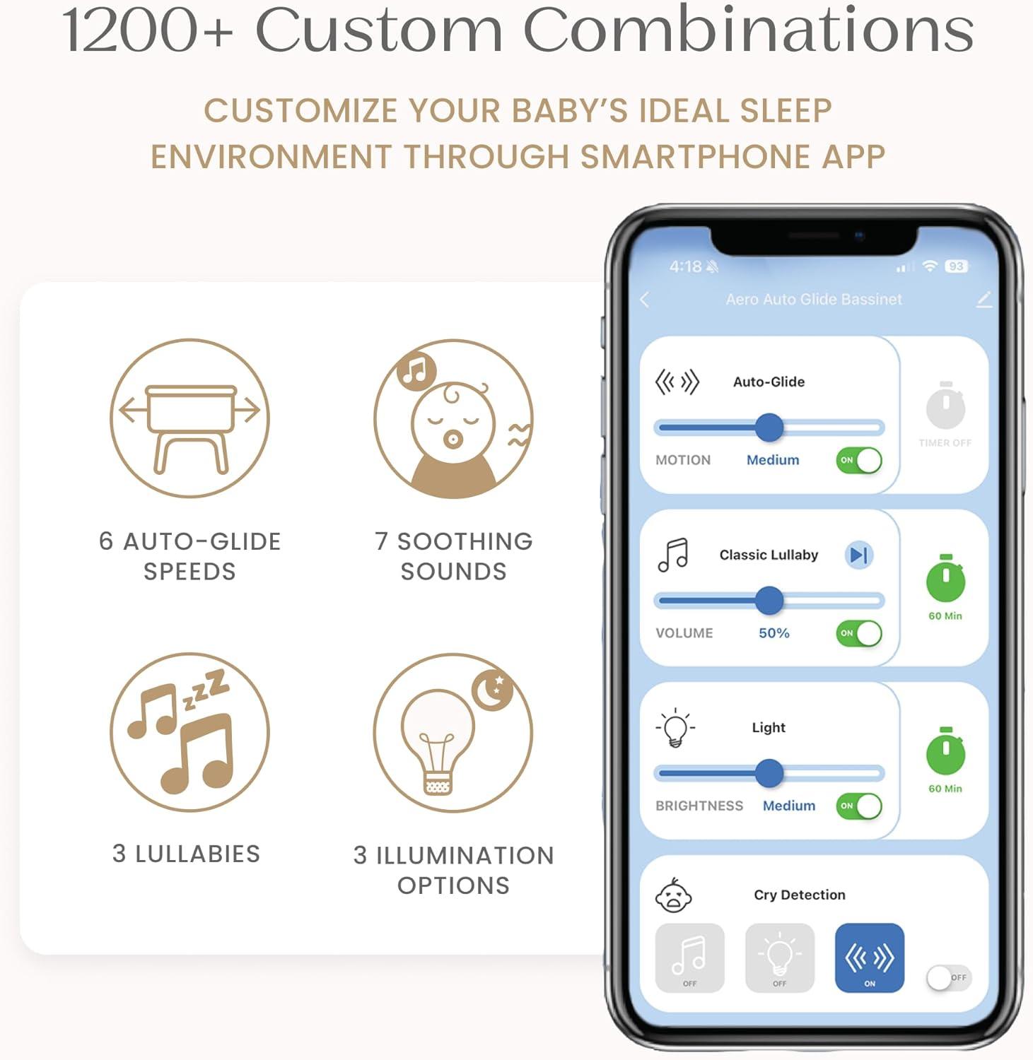 The Delta Children Aero Smart Auto Glide Bassinet hears your baby's cries and automatically responds with advanced cry detection technology that activates a soothing side-to-side gliding motion, lullabies or sounds, and calming amber light that supports healthy sleep patterns and prevents overstimulation. Customize your baby’s ideal sleep environment with over 1,200 setting combinations that you can control directly in the Delta Children Connect App. Parents can also stream any song via Bluetooth wireless technology. The patent-pending magnetic auto-glide feature offers the quietest and most reliable glide motion on the market, beating out the competition that still uses nosey motors. A breathable knit interior, stain-resistant, 100% organic, GOTS Certified fabric exterior, included PureAir Fitted Sheets and water-resistant mattress pad help create a safe and serene space for your baby. Its sleek aesthetic and FSC-certified wood legs that help support healthy forests and ecosystems, seamlessly fits with your home's decor. This bassinet is recommended for babies 0-5 months. Max weight 30 lbs. Stop use at 5 months or once your infant begins to push up on their hands and knees, whichever comes first.