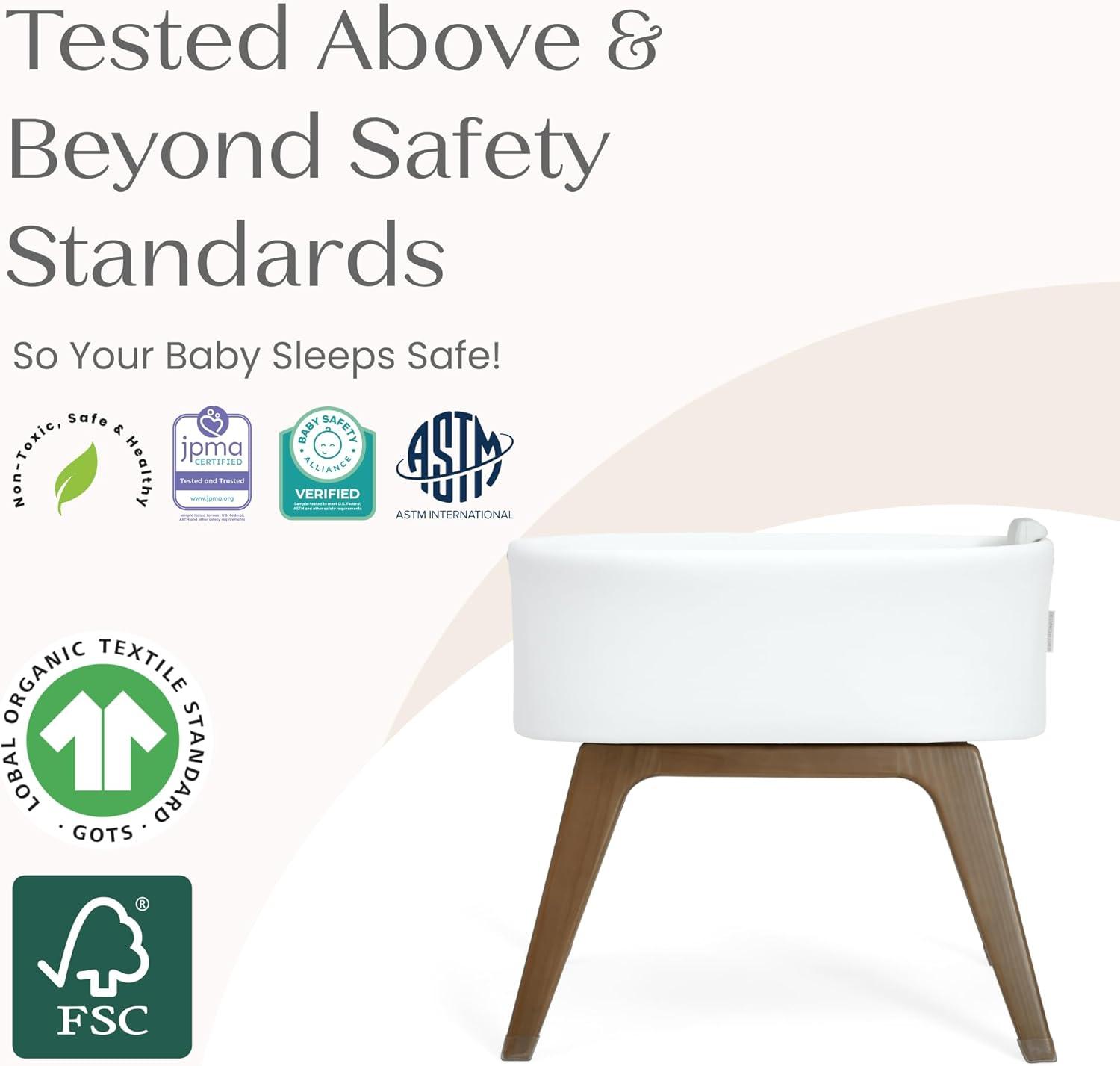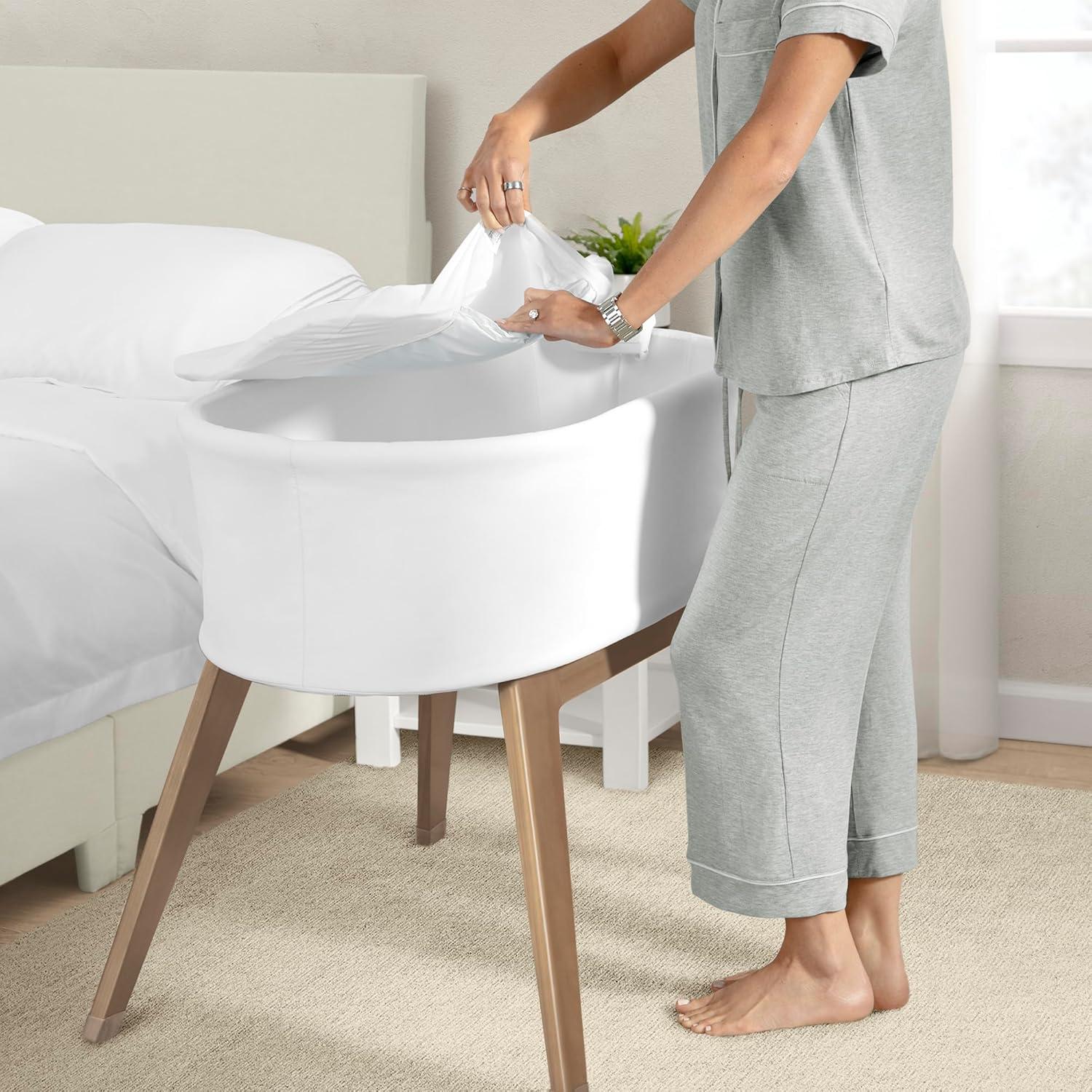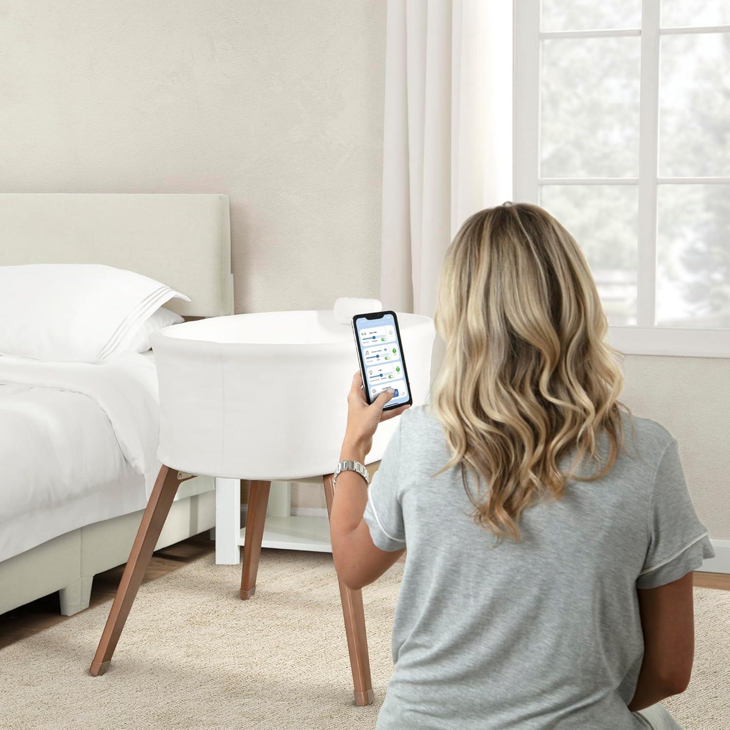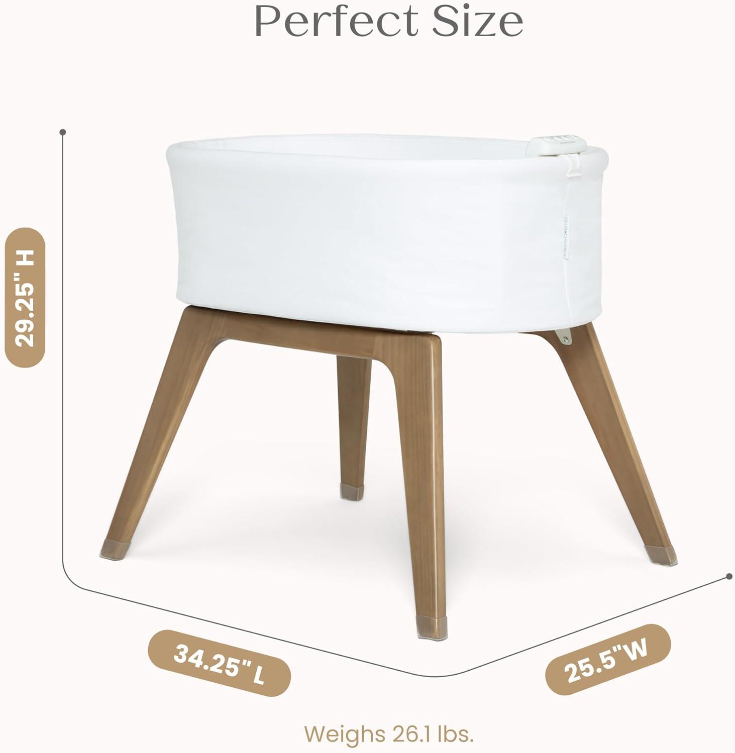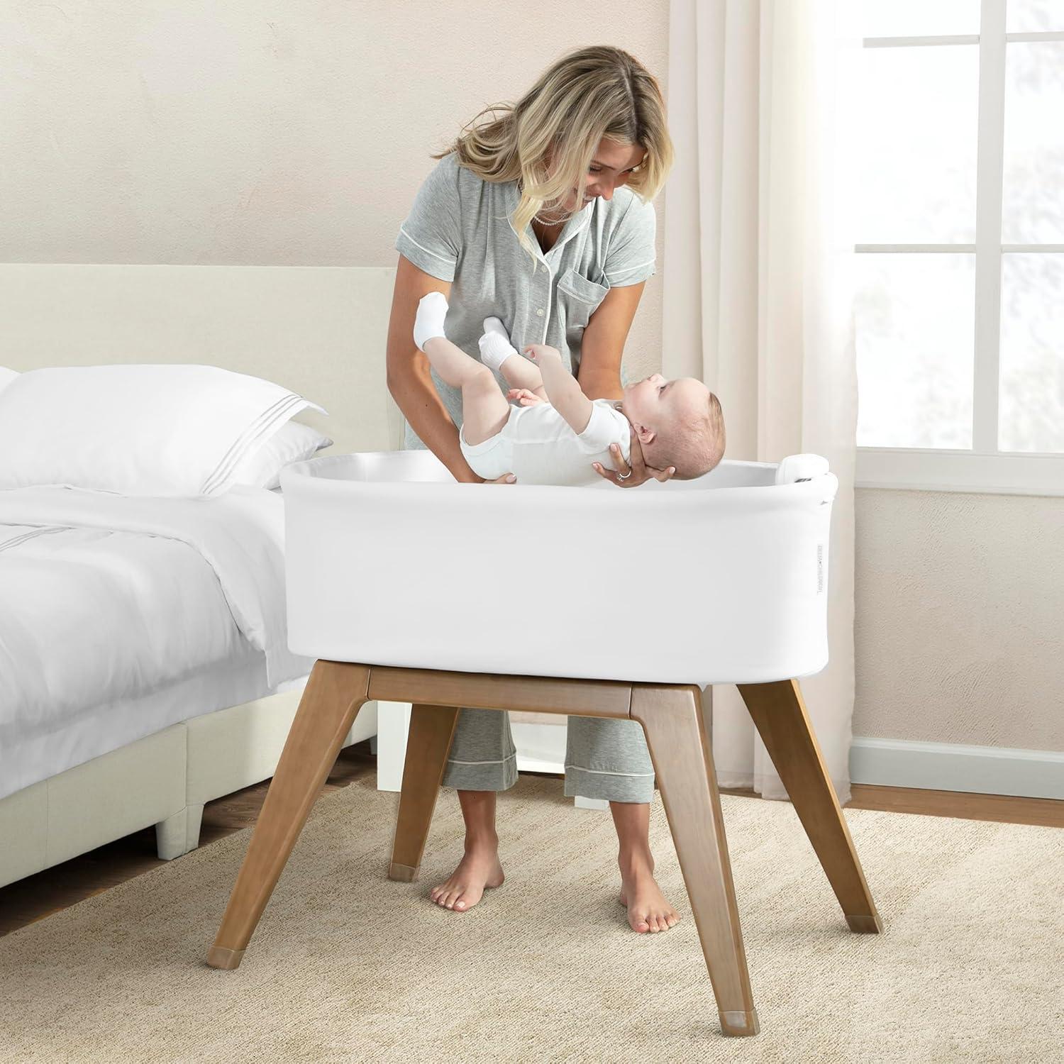 The Delta Children Aero Smart Auto Glide Bassinet hears your baby's cries and automatically responds with advanced cry detection technology that activates a soothing side-to-side gliding motion, lullabies or sounds, and calming amber light that supports healthy sleep patterns and prevents overstimulation. Customize your baby’s ideal sleep environment with over 1,200 setting combinations that you can control directly in the Delta Children Connect App. Parents can also stream any song via Bluetooth wireless technology. The patent-pending magnetic auto-glide feature offers the quietest and most reliable glide motion on the market, beating out the competition that still uses nosey motors. A breathable knit interior, stain-resistant, 100% organic, GOTS Certified fabric exterior, included PureAir Fitted Sheets and water-resistant mattress pad help create a safe and serene space for your baby. Its sleek aesthetic and FSC-certified wood legs that help support healthy forests and ecosystems, seamlessly fits with your home's decor. This bassinet is recommended for babies 0-5 months. Max weight 30 lbs. Stop use at 5 months or once your infant begins to push up on their hands and knees, whichever comes first.