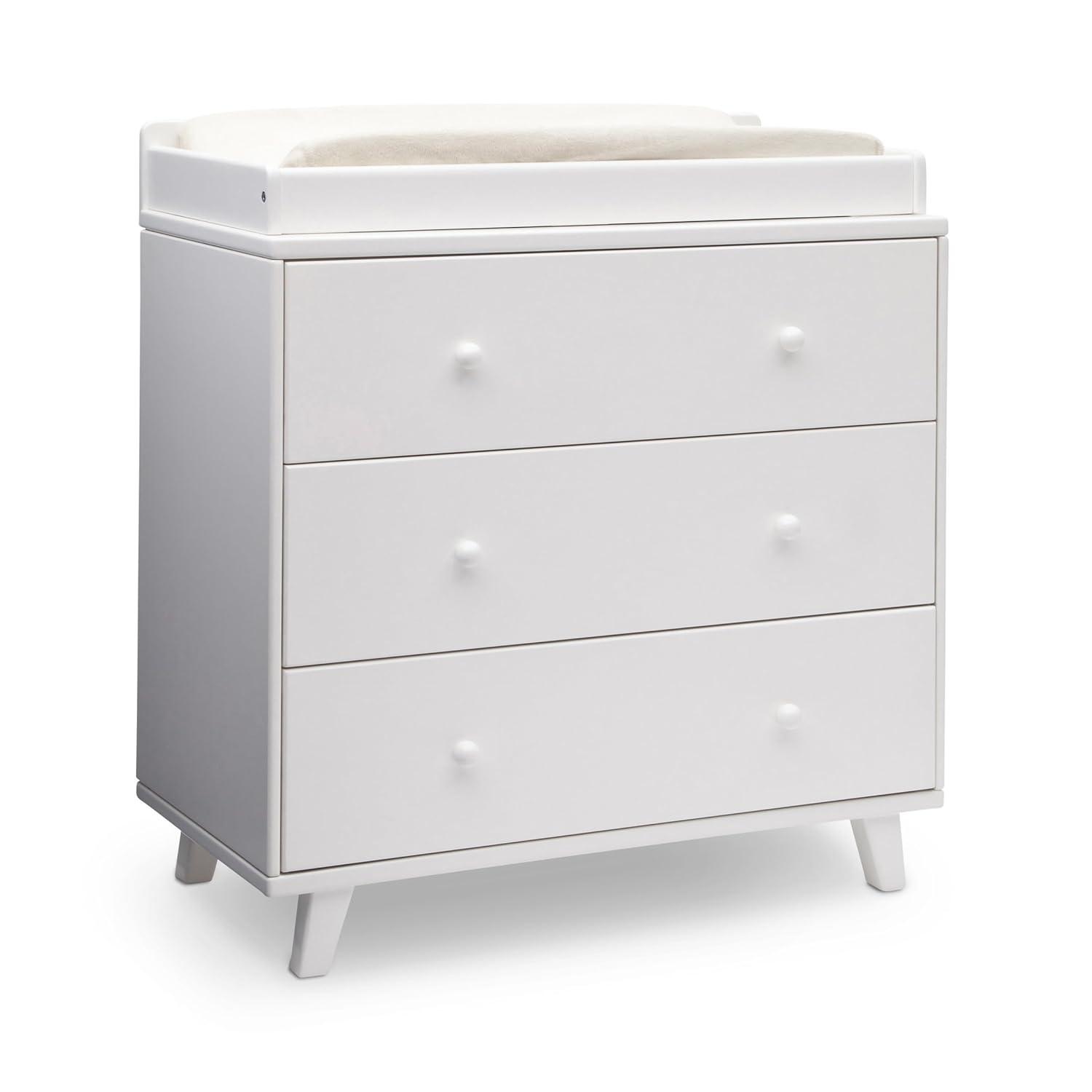 A modern heirloom, the Ava 3 Drawer Dresser with Changing Top from Delta Children features clean, crisp lines and three spacious drawers with plenty of storage for your growing baby. Topped with a removable changing top, the dresser does double duty; so once your baby outgrows the need for a changing table, just detach the top. Plus, its legs match Delta's Ava 3-in-1 Crib, pair them together to create a cohesive nursery, or mix it with existing furniture for a more eclectic look