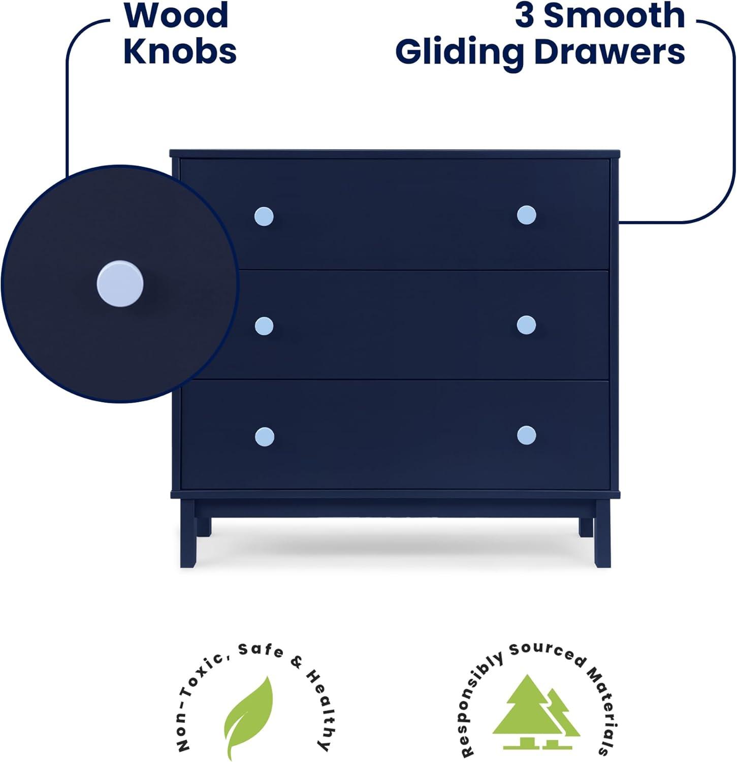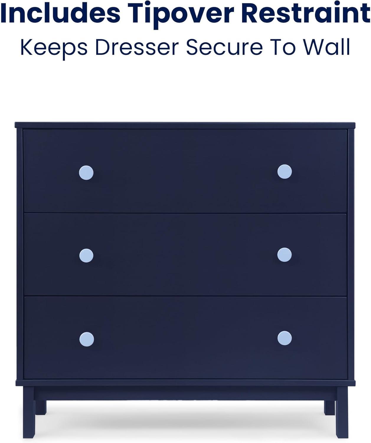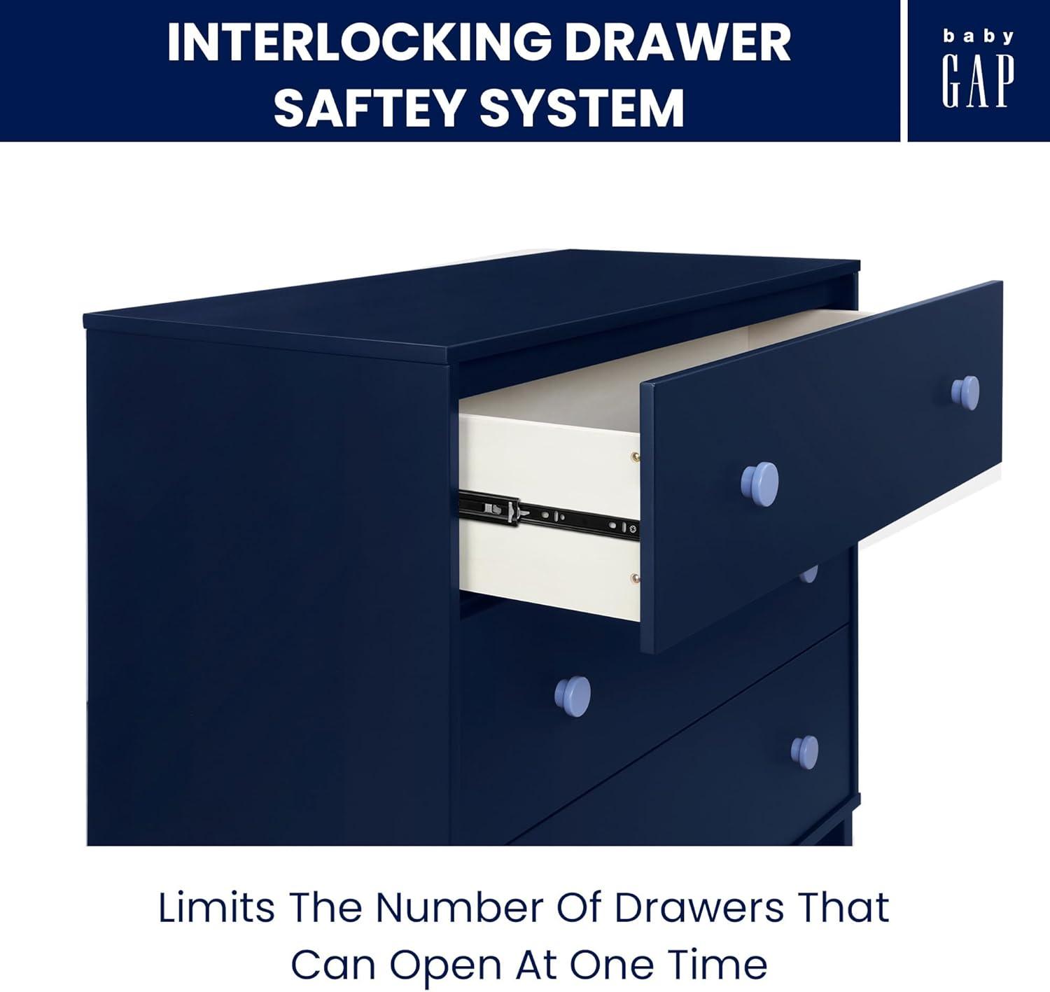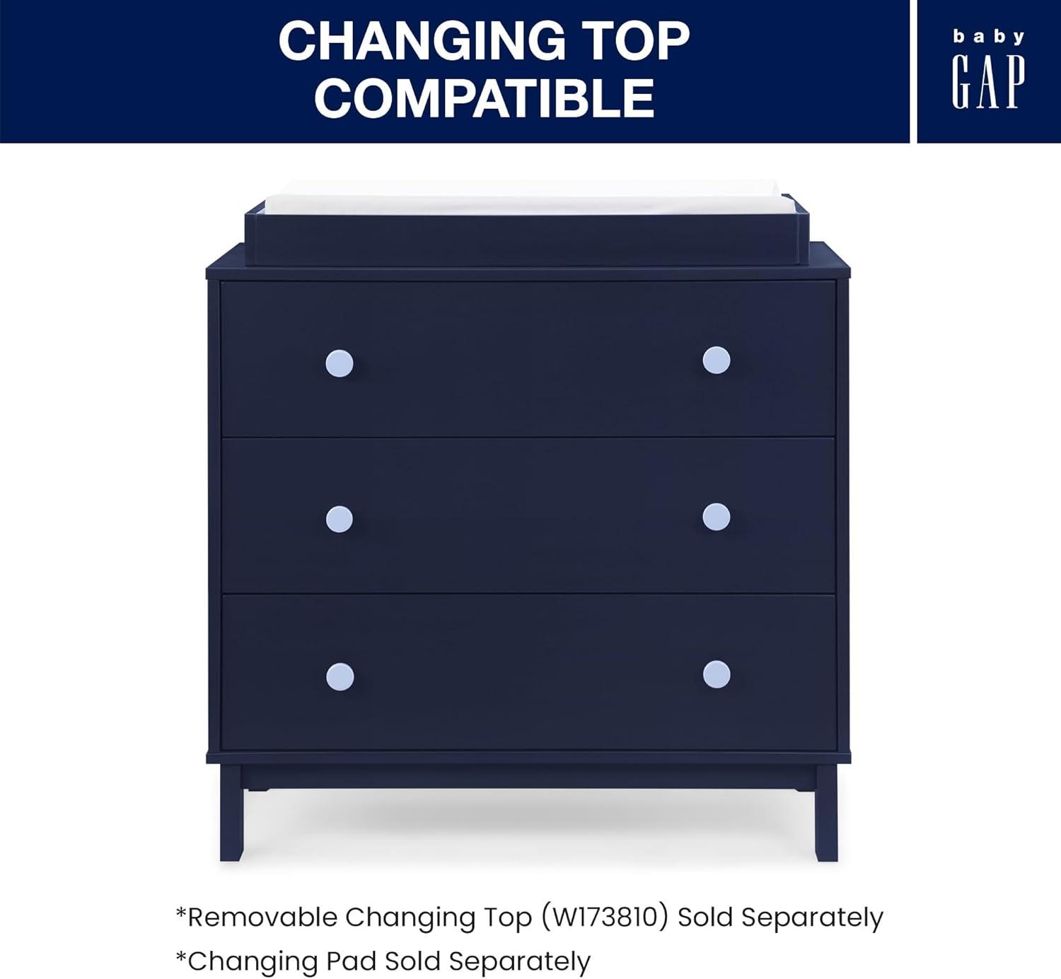 In a goes-with-anything finish with easy-grab knobs, the babyGap by Delta Children Legacy 3 Drawer Dresser with Interlocking Drawers is a great addition to any nursery or kids’ bedroom. Crafted of sturdy, sustainable materials like New Zealand pine to give it plenty of longevity, this versatile dresser has three spacious drawers for plenty of storage. For your child’s safety, this dresser is outfitted with an interlocking drawer system that limits the number of drawers that can be opened at one time. Available in Bianca White, Navy/Light Blue, Gray/Dark Gray and Blush/Dark Pink. Easily mix, match, and layer with other items from the babyGap Furniture and Bedding Collection. Pair with the coordinating Changing Top #W173810 to convert the dresser into a convenient changing table (Changing Top and changing pad sold separately).