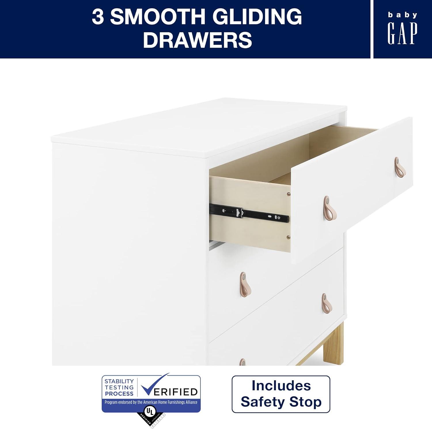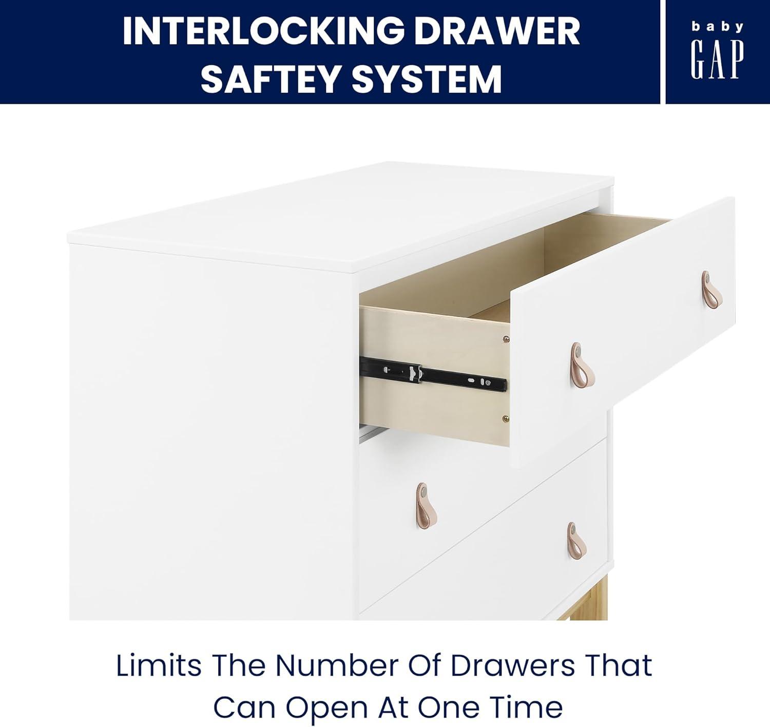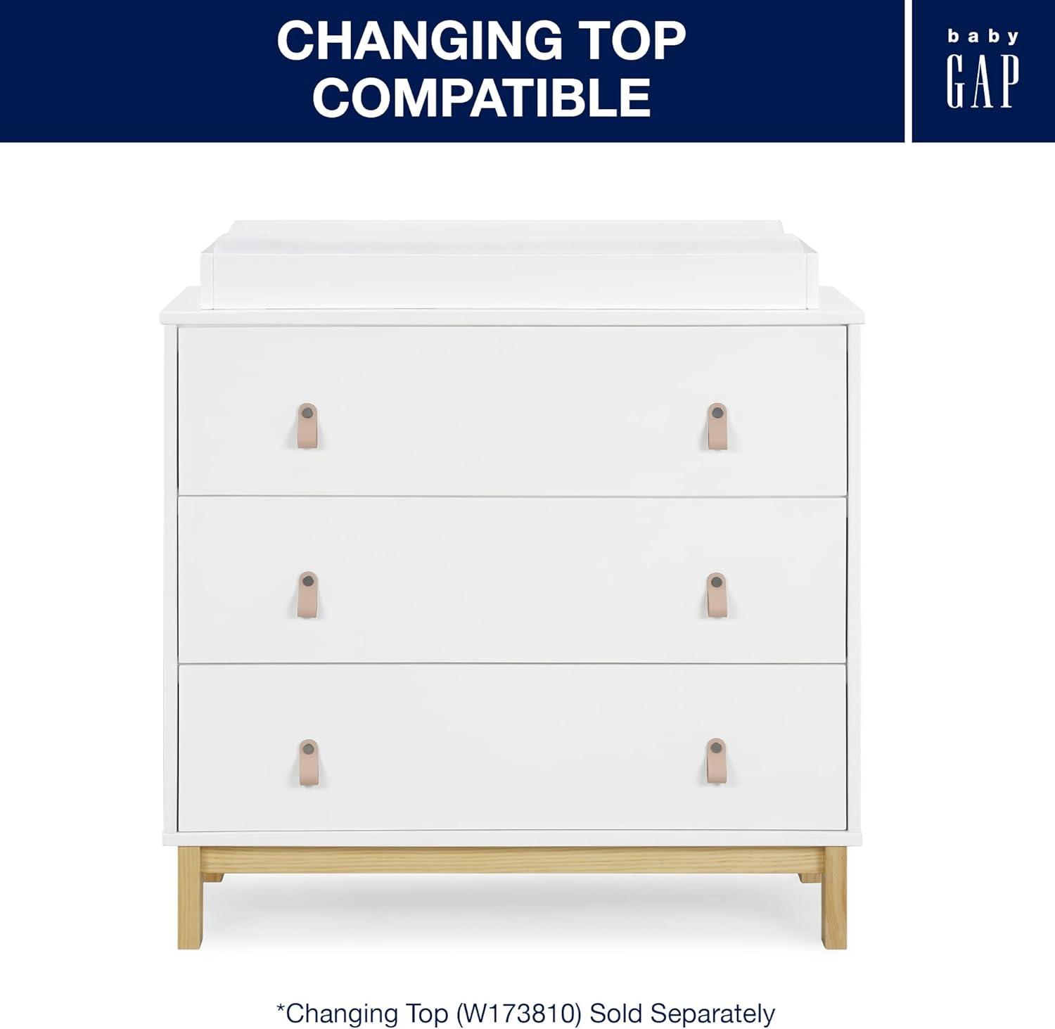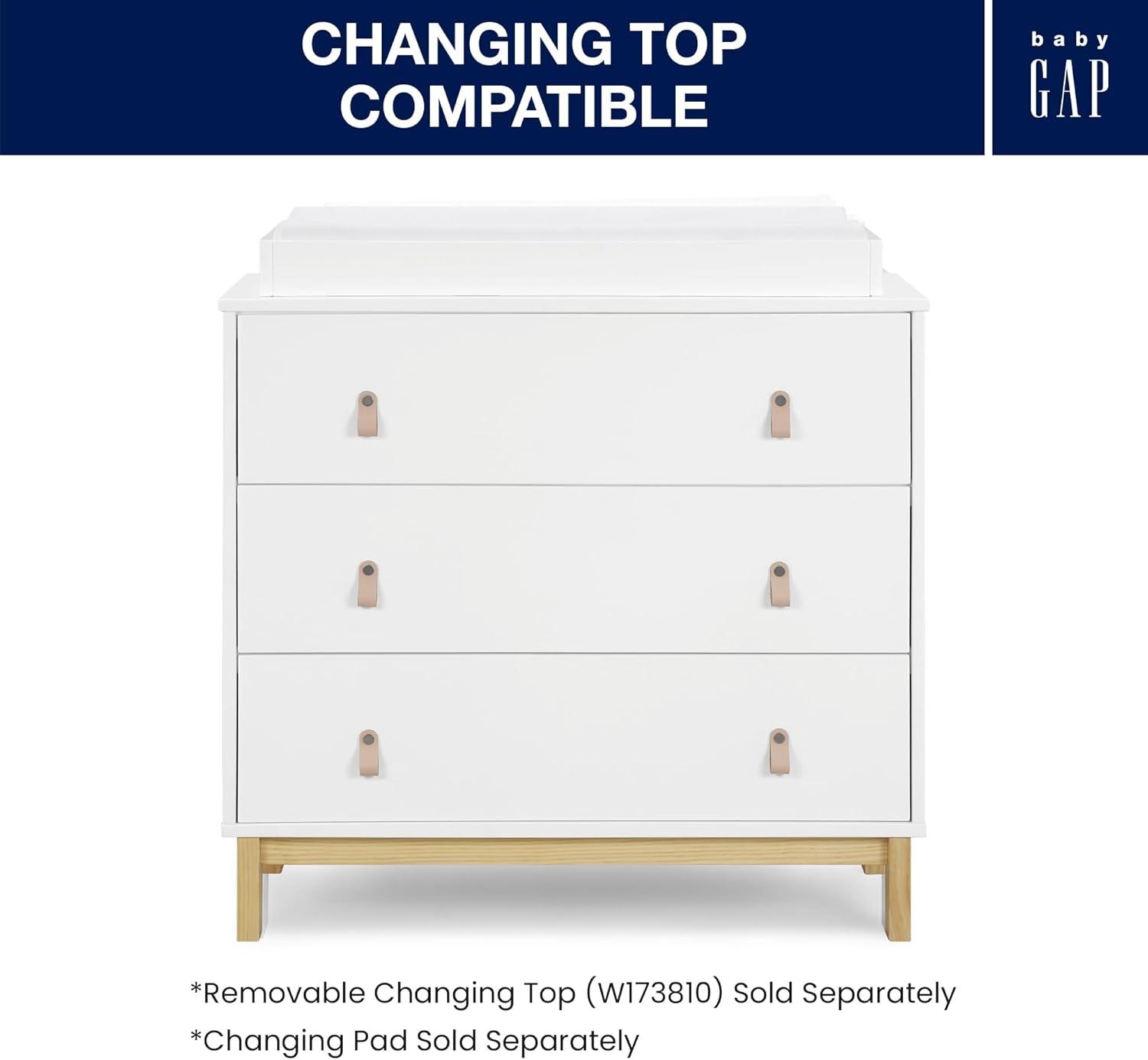 The babyGap by Delta Children Legacy 3 Drawer Dresser with Leather Pulls and Interlocking Drawers is a great addition to any nursery or kids’ bedroom. Crafted of sturdy, sustainable materials like New Zealand pine to give it plenty of longevity, this versatile dresser has three spacious drawers for plenty of storage and leather drawer pulls for a bit of fun. For your child’s safety, this dresser is outfitted with an interlocking drawer system that limits the number of drawers that can be opened at one time. Available in Bianca White/Natural, Navy/Natural and Ebony/Natural. Easily mix, match, and layer with other items from the babyGap Furniture and Bedding Collection. Pair with the coordinating Changing Top #W173810 to convert the dresser into a convenient changing table (Changing Top and changing pad sold separately).