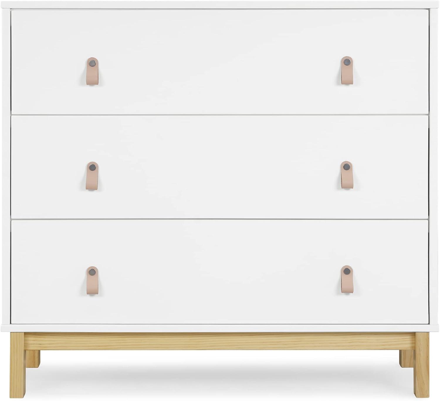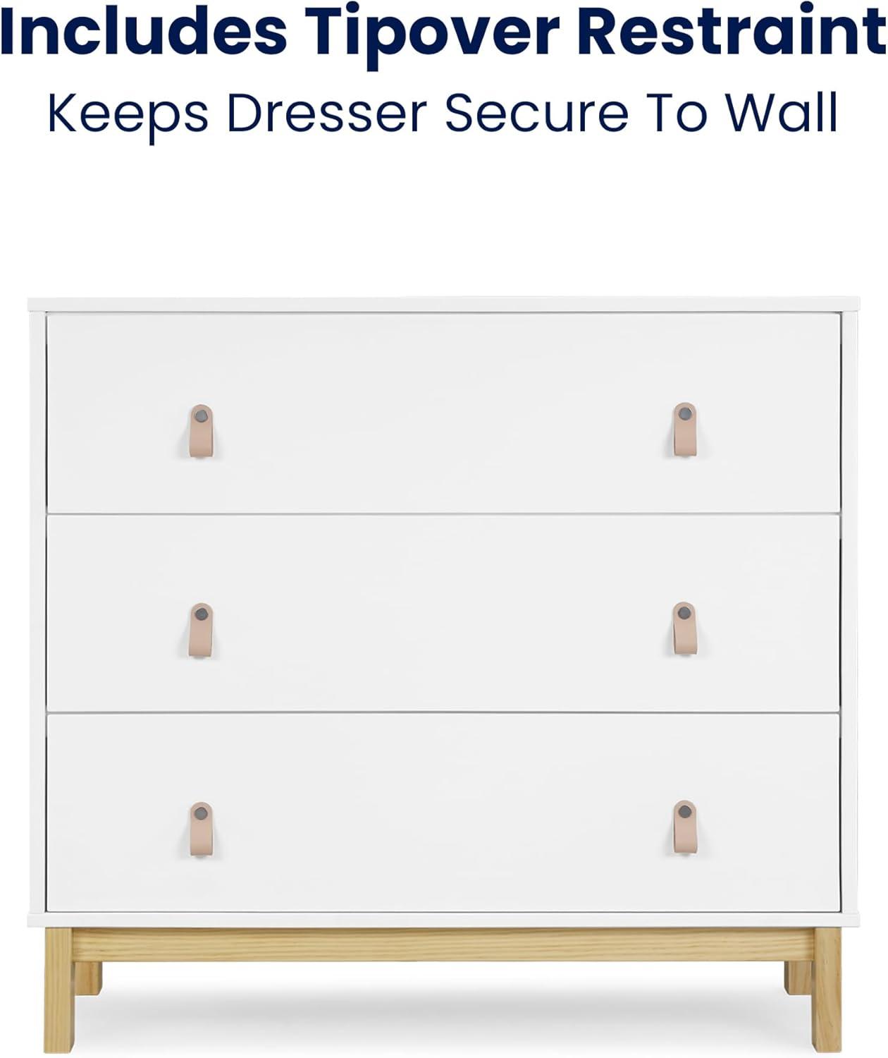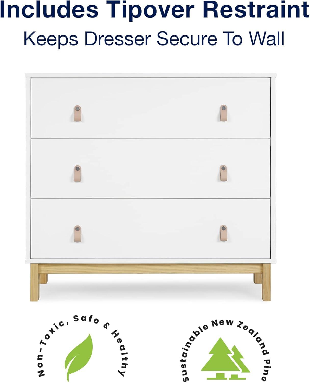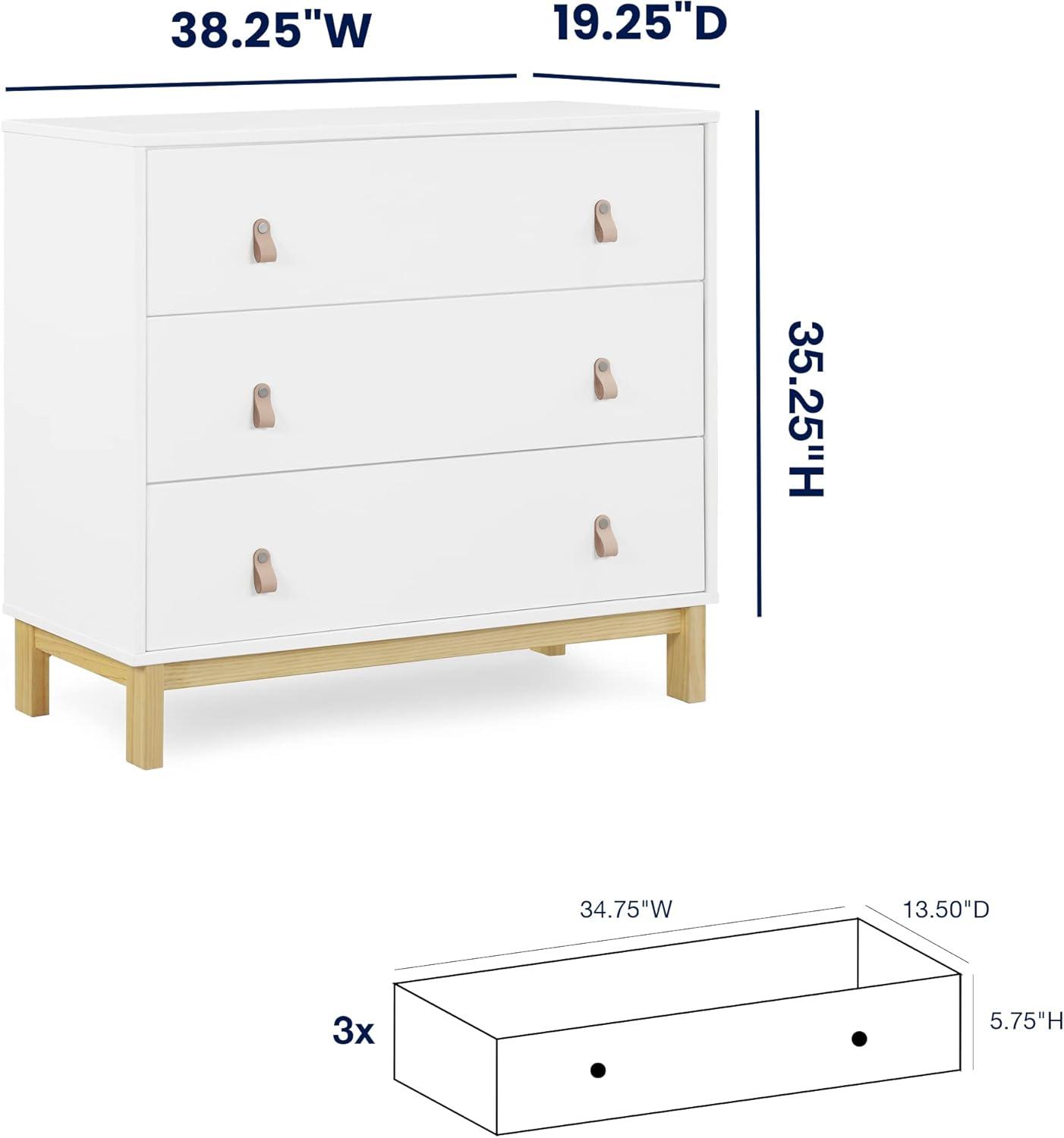 The babyGap by Delta Children Legacy 3 Drawer Dresser with Leather Pulls and Interlocking Drawers is a great addition to any nursery or kids’ bedroom. Crafted of sturdy, sustainable materials like New Zealand pine to give it plenty of longevity, this versatile dresser has three spacious drawers for plenty of storage and leather drawer pulls for a bit of fun. For your child’s safety, this dresser is outfitted with an interlocking drawer system that limits the number of drawers that can be opened at one time. Available in Bianca White/Natural, Navy/Natural and Ebony/Natural. Easily mix, match, and layer with other items from the babyGap Furniture and Bedding Collection. Pair with the coordinating Changing Top #W173810 to convert the dresser into a convenient changing table (Changing Top and changing pad sold separately).