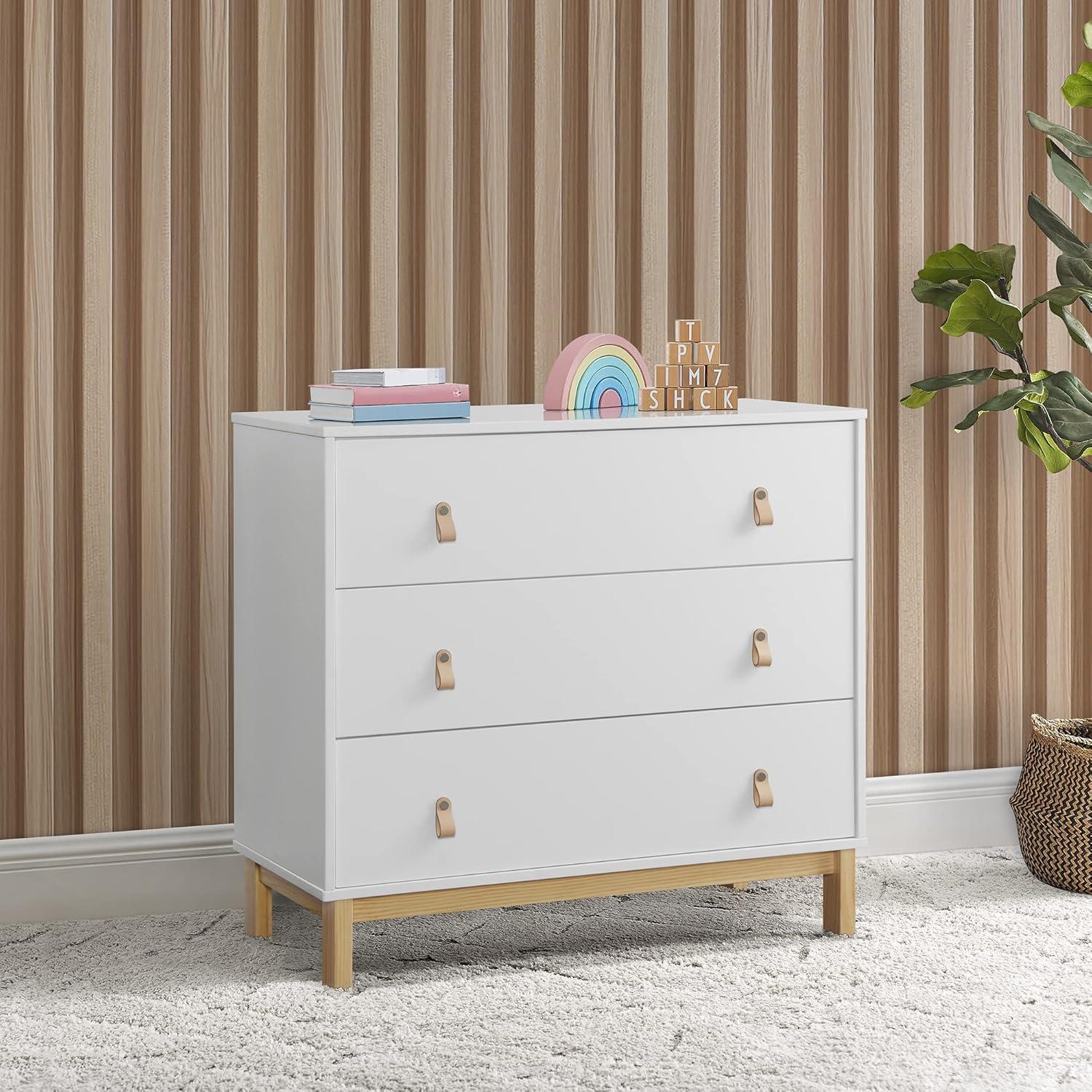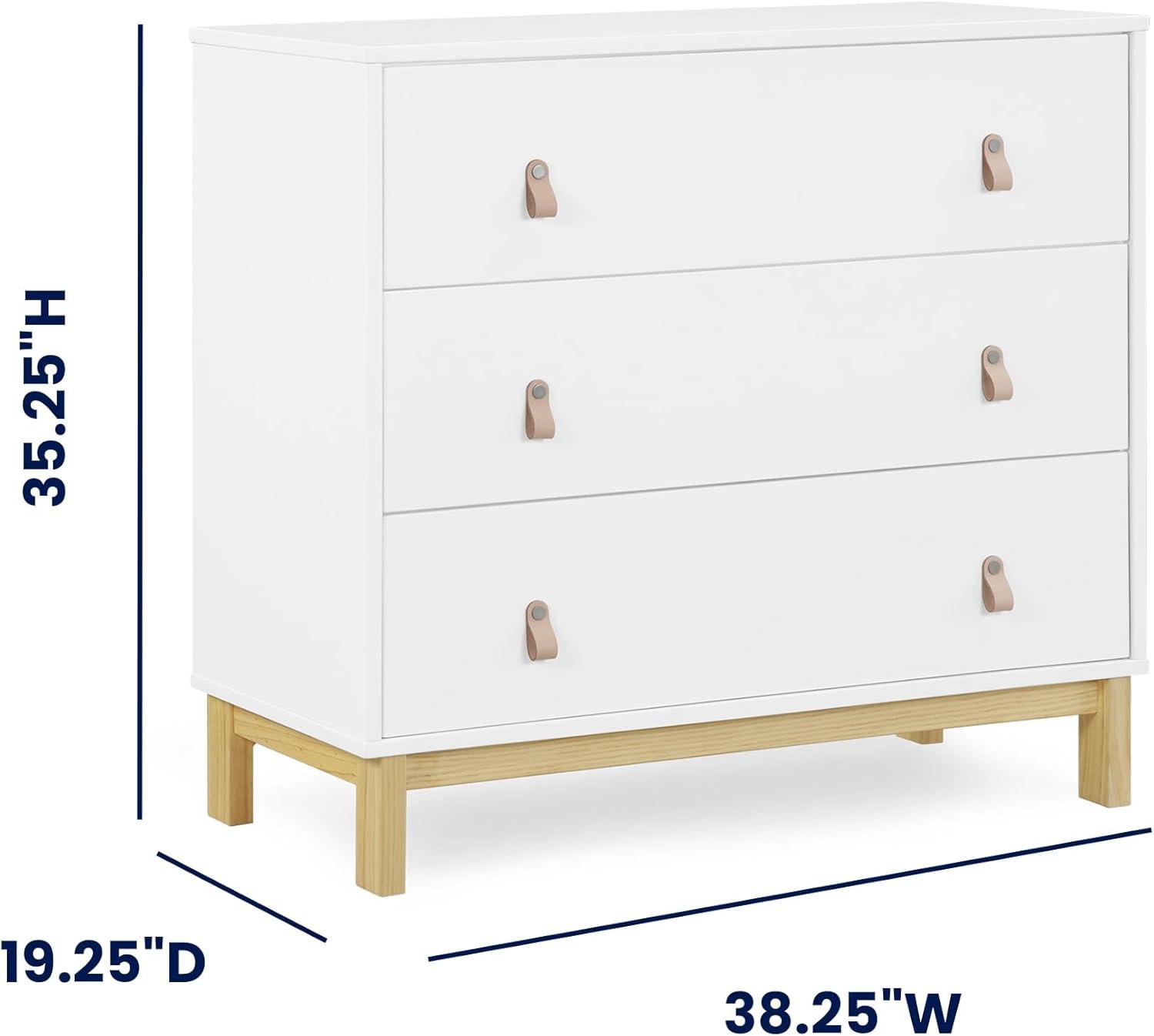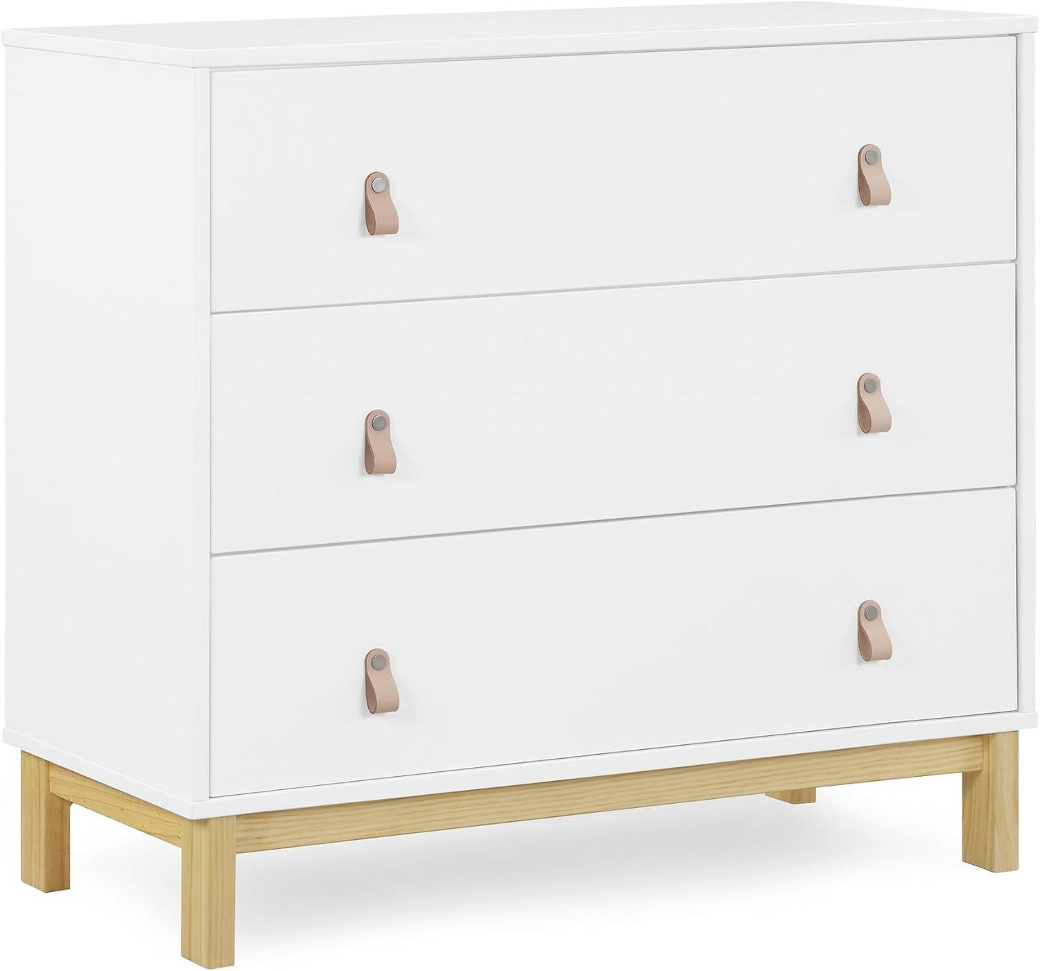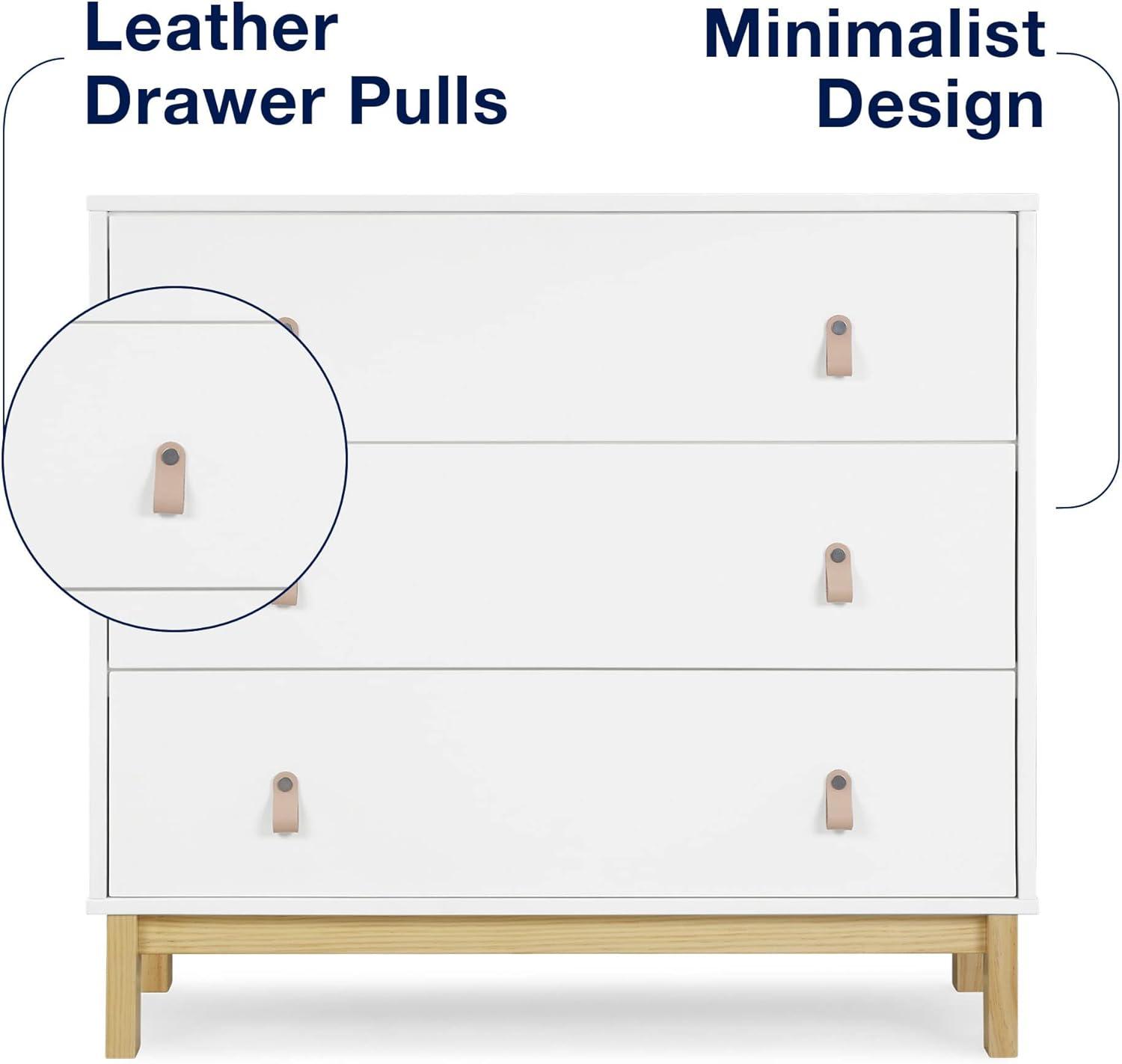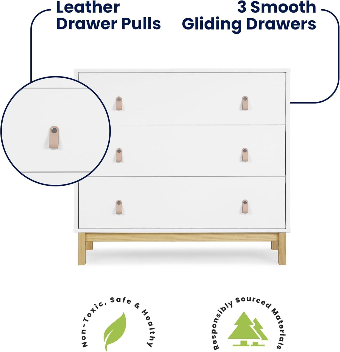 The babyGap by Delta Children Legacy 3 Drawer Dresser with Leather Pulls and Interlocking Drawers is a great addition to any nursery or kids’ bedroom. Crafted of sturdy, sustainable materials like New Zealand pine to give it plenty of longevity, this versatile dresser has three spacious drawers for plenty of storage and leather drawer pulls for a bit of fun. For your child’s safety, this dresser is outfitted with an interlocking drawer system that limits the number of drawers that can be opened at one time. Available in Bianca White/Natural, Navy/Natural and Ebony/Natural. Easily mix, match, and layer with other items from the babyGap Furniture and Bedding Collection. Pair with the coordinating Changing Top #W173810 to convert the dresser into a convenient changing table (Changing Top and changing pad sold separately).