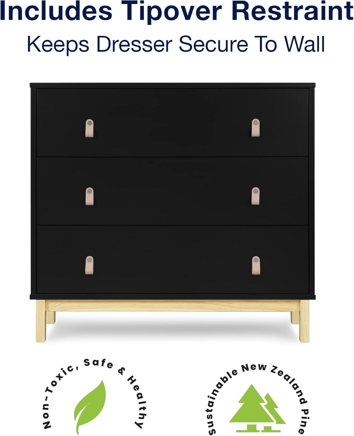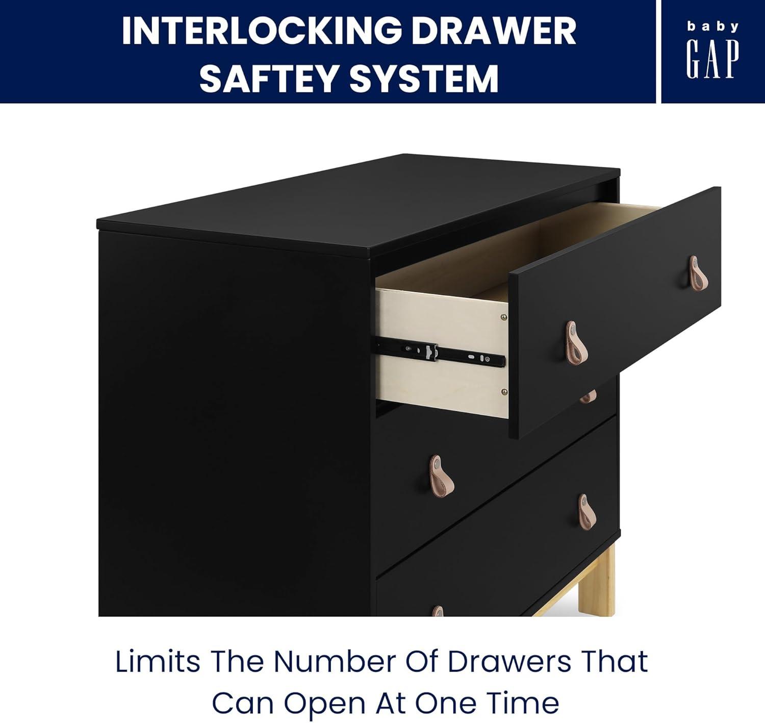 The babyGap by Delta Children Legacy 3 Drawer Dresser with Leather Pulls and Interlocking Drawers is a great addition to any nursery or kids’ bedroom. Crafted of sturdy, sustainable materials like New Zealand pine to give it plenty of longevity, this versatile dresser has three spacious drawers for plenty of storage and leather drawer pulls for a bit of fun. For your child’s safety, this dresser is outfitted with an interlocking drawer system that limits the number of drawers that can be opened at one time. Available in Bianca White/Natural, Navy/Natural and Ebony/Natural. Easily mix, match, and layer with other items from the babyGap Furniture and Bedding Collection. Pair with the coordinating Changing Top #W173810 to convert the dresser into a convenient changing table (Changing Top and changing pad sold separately).