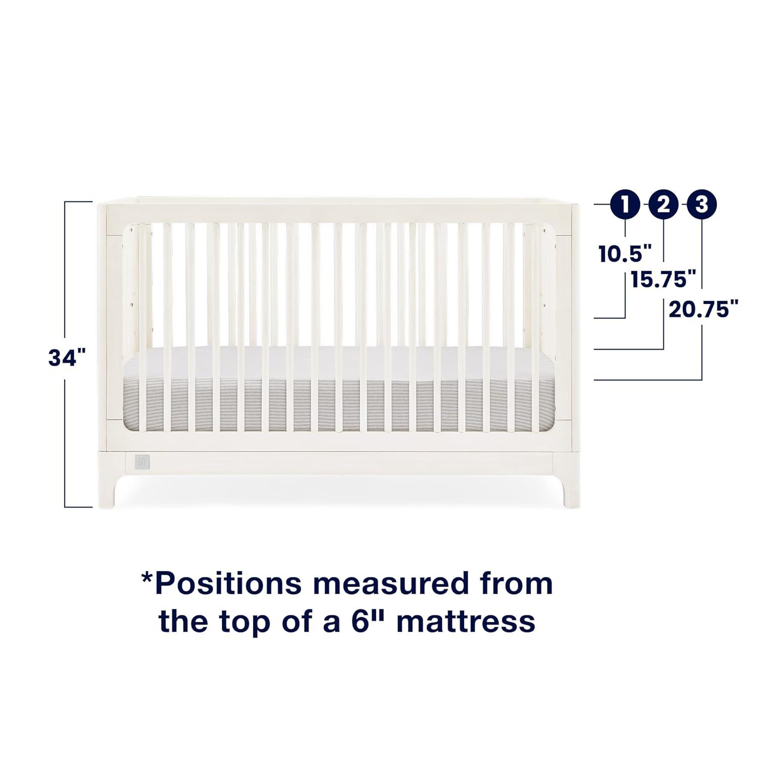 ADJUSTABLE HEIGHT: Adjustable height mattress support with 3 convenient positions to grow with your baby | Access Rail to Floor: 34.25″; Access Rail to top mattress support position: 16.5″; Access Rail to bottom mattress support position: 26.5″