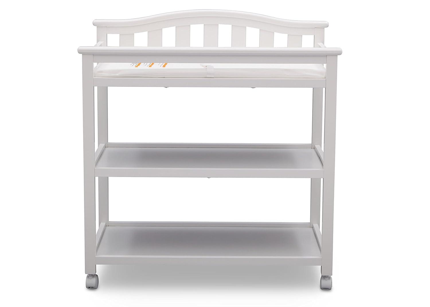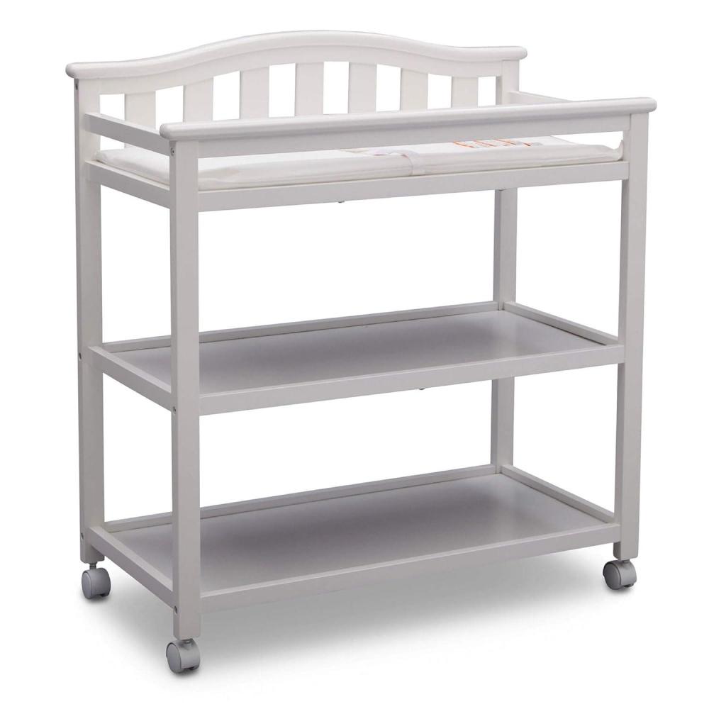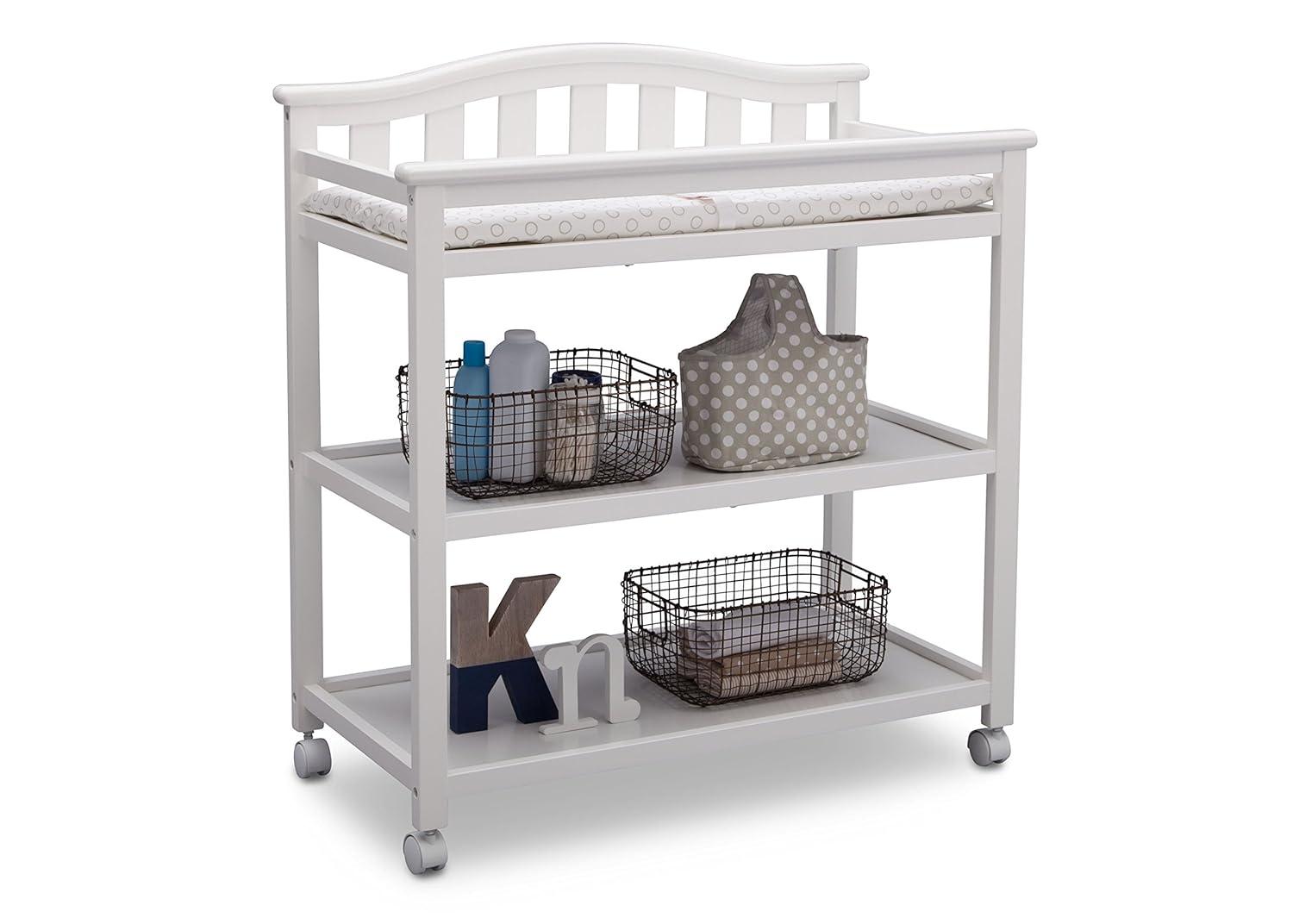 The Bell Top Changing Table with Casters from Delta Children grants you the freedom to easily change and dress your baby. A convenient changing station, this versatile table has a bell-shaped back with slated detailing and a streamlined profile that effortlessly pairs with any item. Outfitted with two fixed shelves to conveniently store your child's essential items, the Bell Top Changing Table also features four casters on the bottom, so you can roll the unit from one end of the room to the other. For your baby's safety, the included changing pad with safety strap keeps your little one secure-even when they won't stay still. Delta Children was founded around the idea of making safe, high-quality nursery furniture affordable for all families. That's why all Delta Children changing tables are JPMA certified, and are rigorously tested to meet or exceed all industry safety standards.