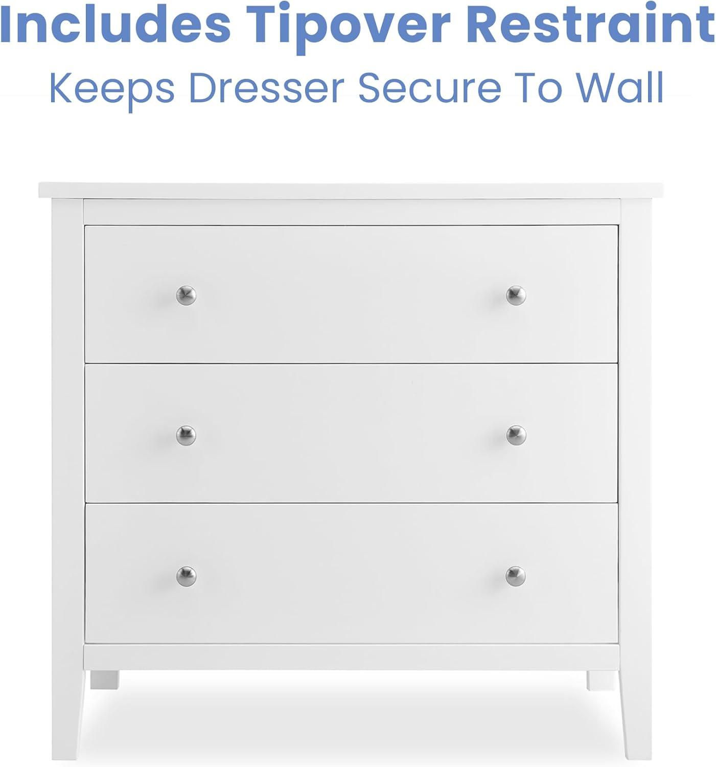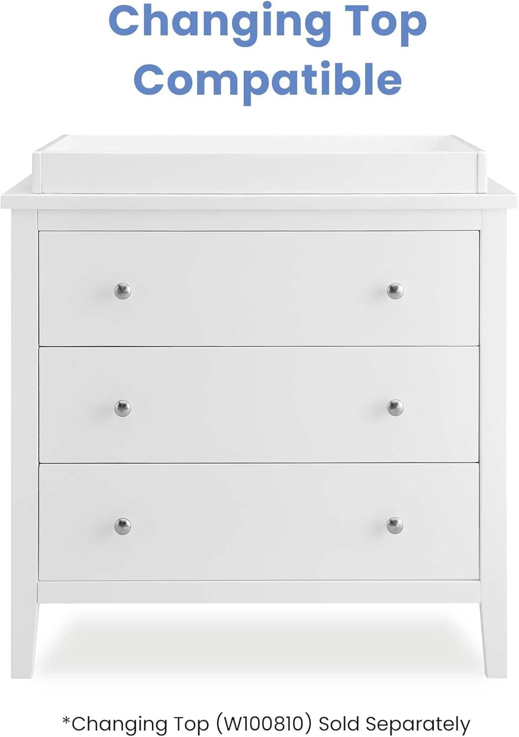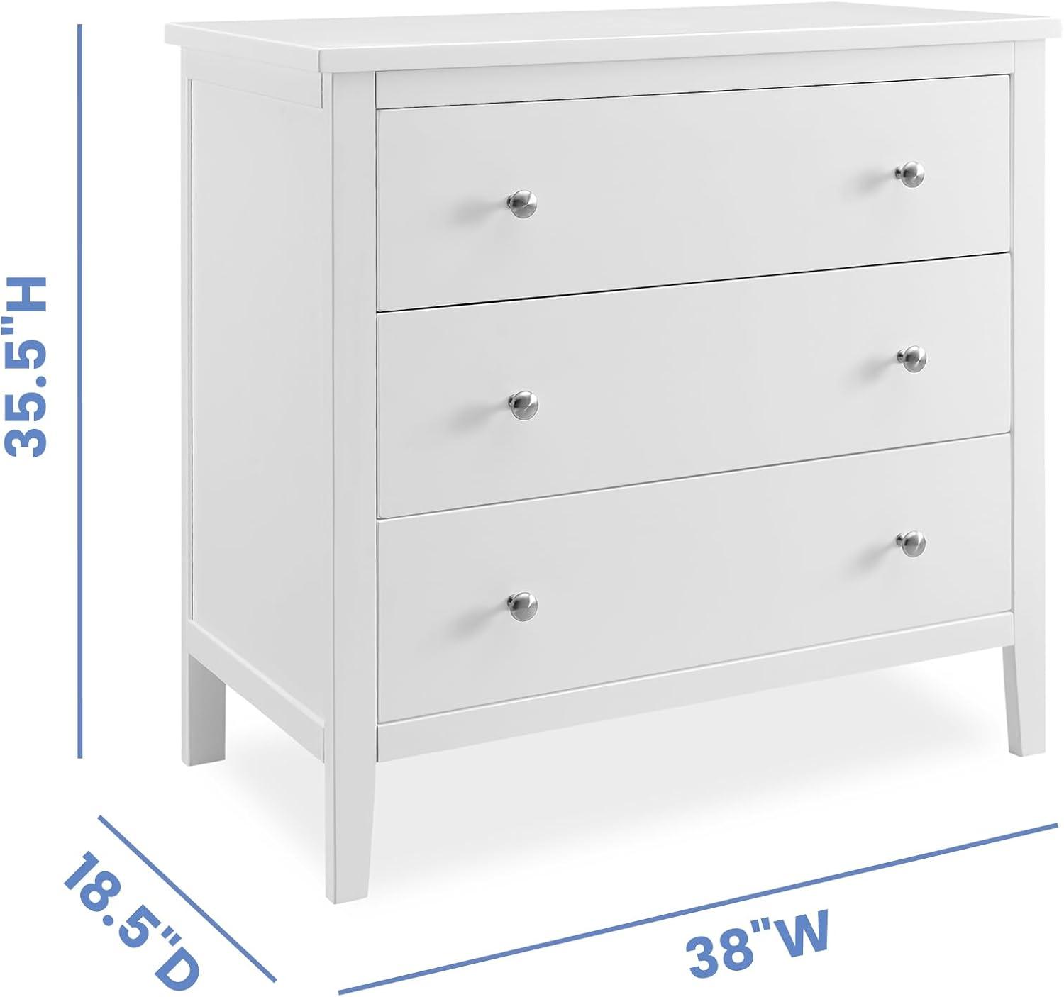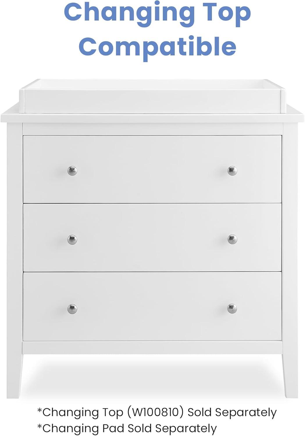Bring your dream nursery to life with the Campbell 3 Drawer Dresser by Delta Children. Clean lines, playful round knobs and tapered legs define this beautiful dresser. This dresser also has a smooth metal glide system with safety stops that prevent drawers from pulling out, so it is easy and safe for kids to manage on their own. Pair this dresser with other pieces in the Campbell Nursery Collection for a coordinated look, as well as the coordinating Changing Top #W100810 (sold separately) to transform this dresser into a convenient changing table.