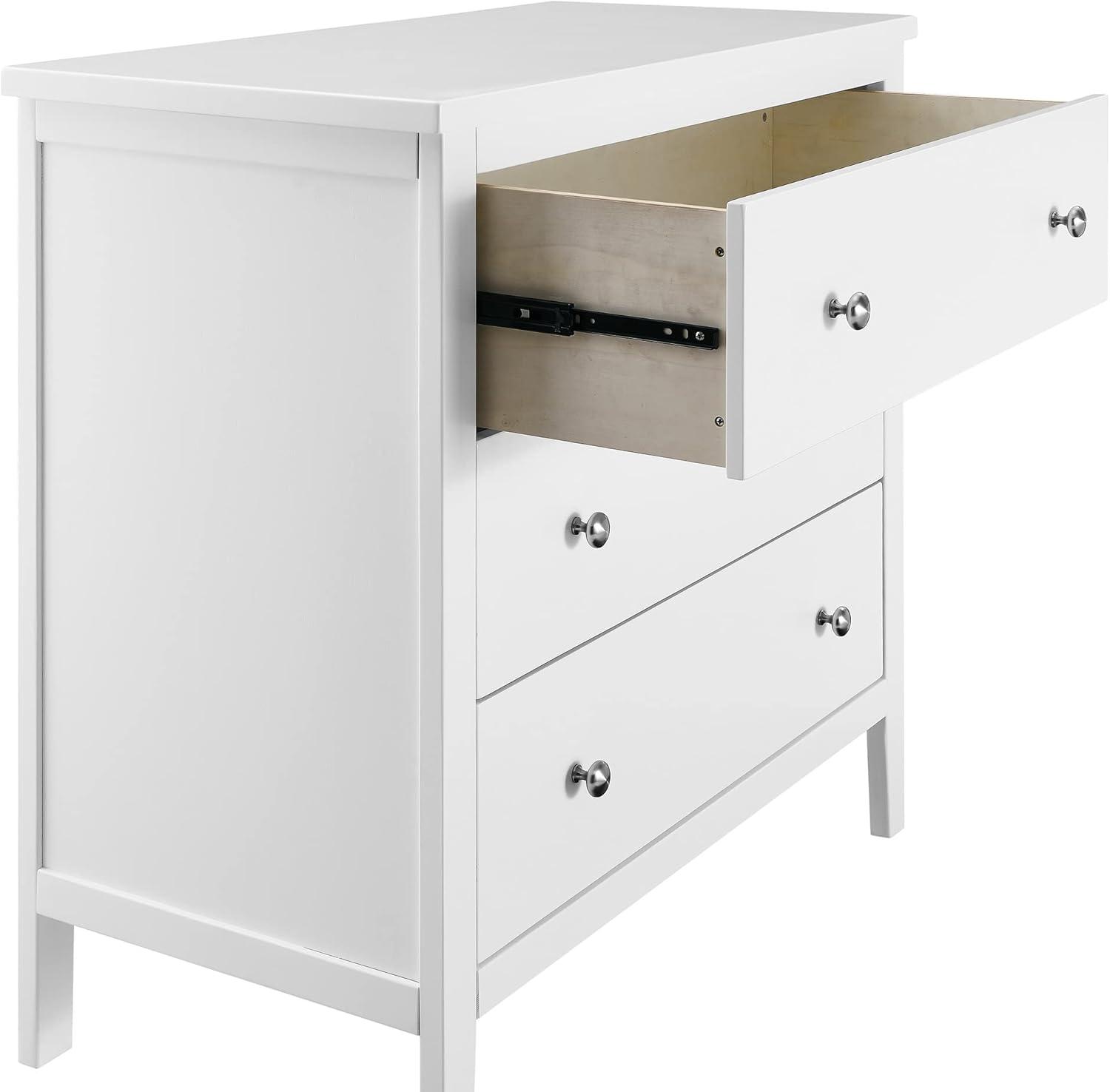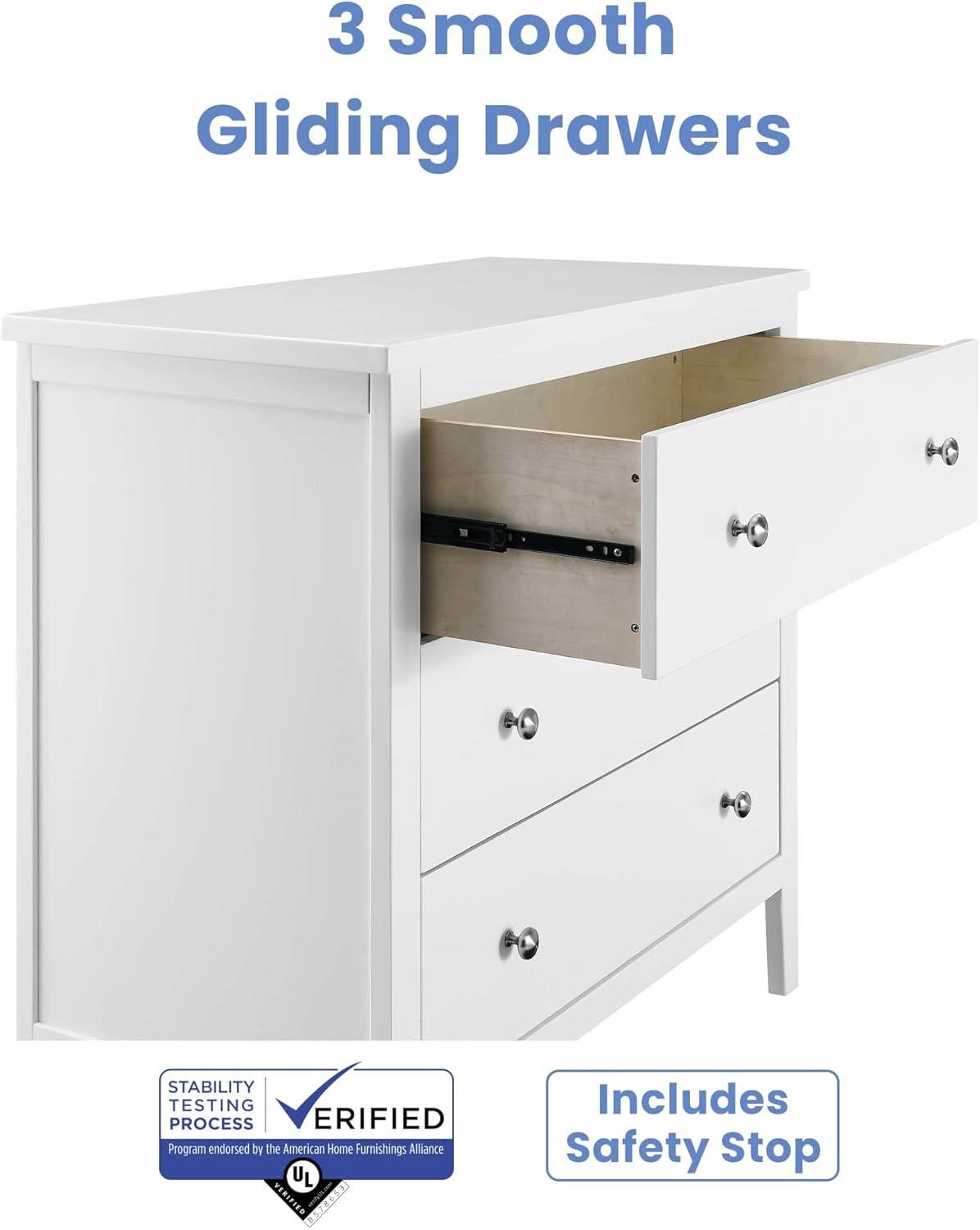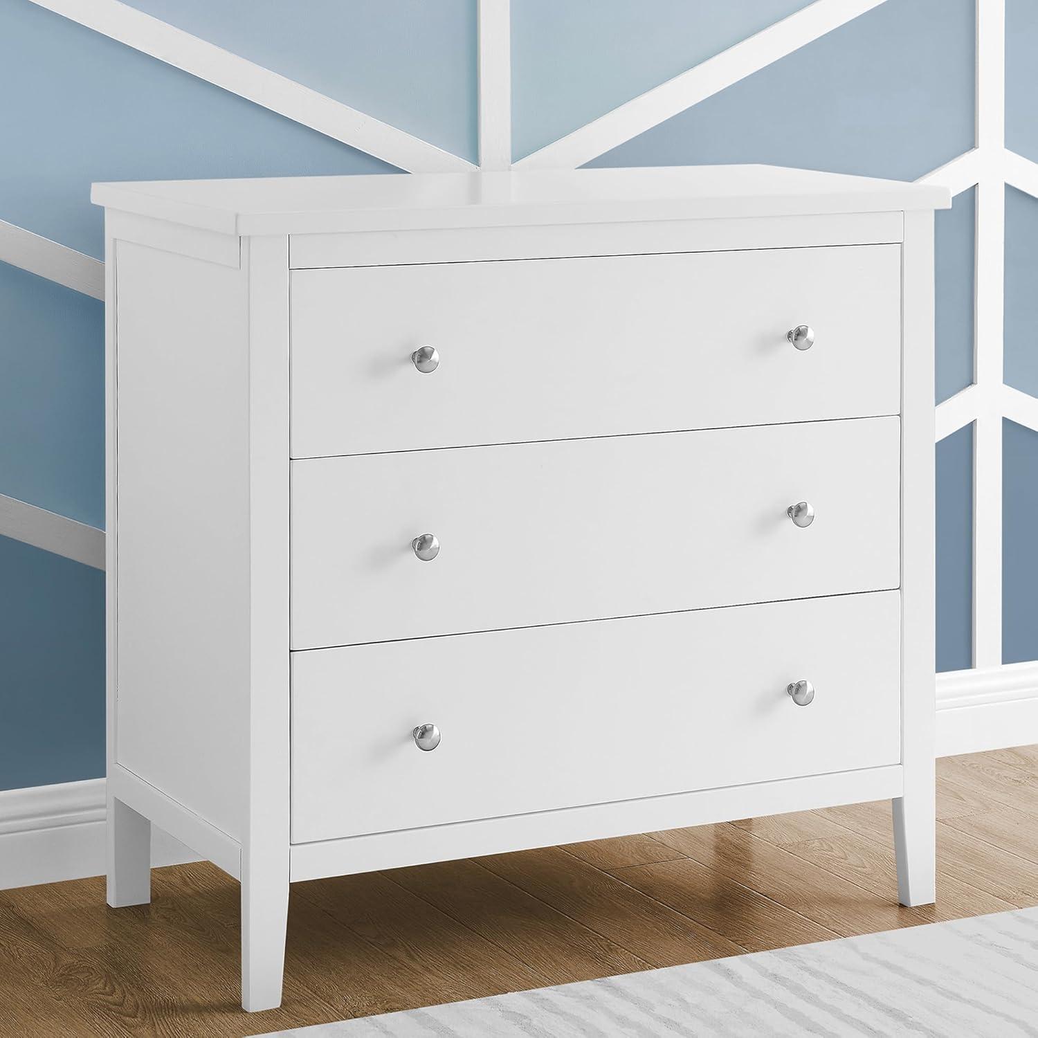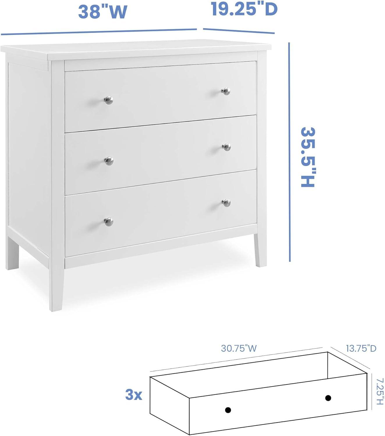 Bring your dream nursery to life with the Campbell 3 Drawer Dresser by Delta Children. Clean lines, playful round knobs and tapered legs define this beautiful dresser. This dresser also has a smooth metal glide system with safety stops that prevent drawers from pulling out, so it is easy and safe for kids to manage on their own. Pair this dresser with other pieces in the Campbell Nursery Collection for a coordinated look, as well as the coordinating Changing Top #W100810 (sold separately) to transform this dresser into a convenient changing table.