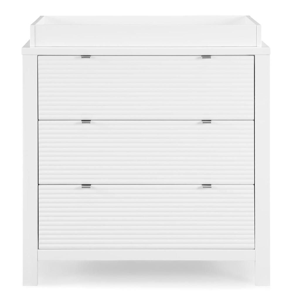 Complete their bedroom with the Cassie 3 Drawer Dresser with Changing Top by Delta Children With three roomy drawers and a modern design that features fluted drawer fonts capped with chrome pulls, there's room for everything. This spacious storage piece serves as a sturdy changing table too, with the included changing topper (changing pad sold separately). When your child grows, just remove the topper, it easily transitions into a stand-alone dresser. This dresser also features a durable construction made from sustainable woods like New Zealand pine and interlocking drawers that only allow one drawer to be opened at any time for your child’s safety. Available in Bianca White, Midnight Gray and Lilac. Pair this dresser with the Cassie 4-in-1 Convertible Crib to complete your space.