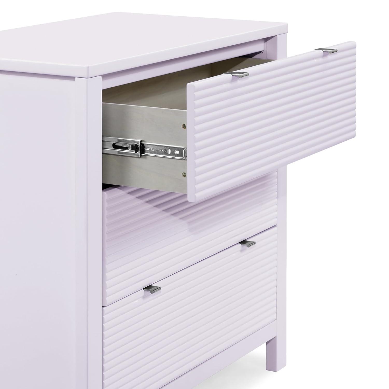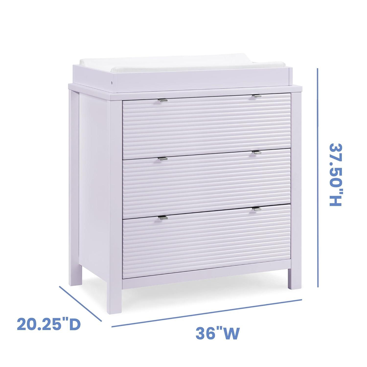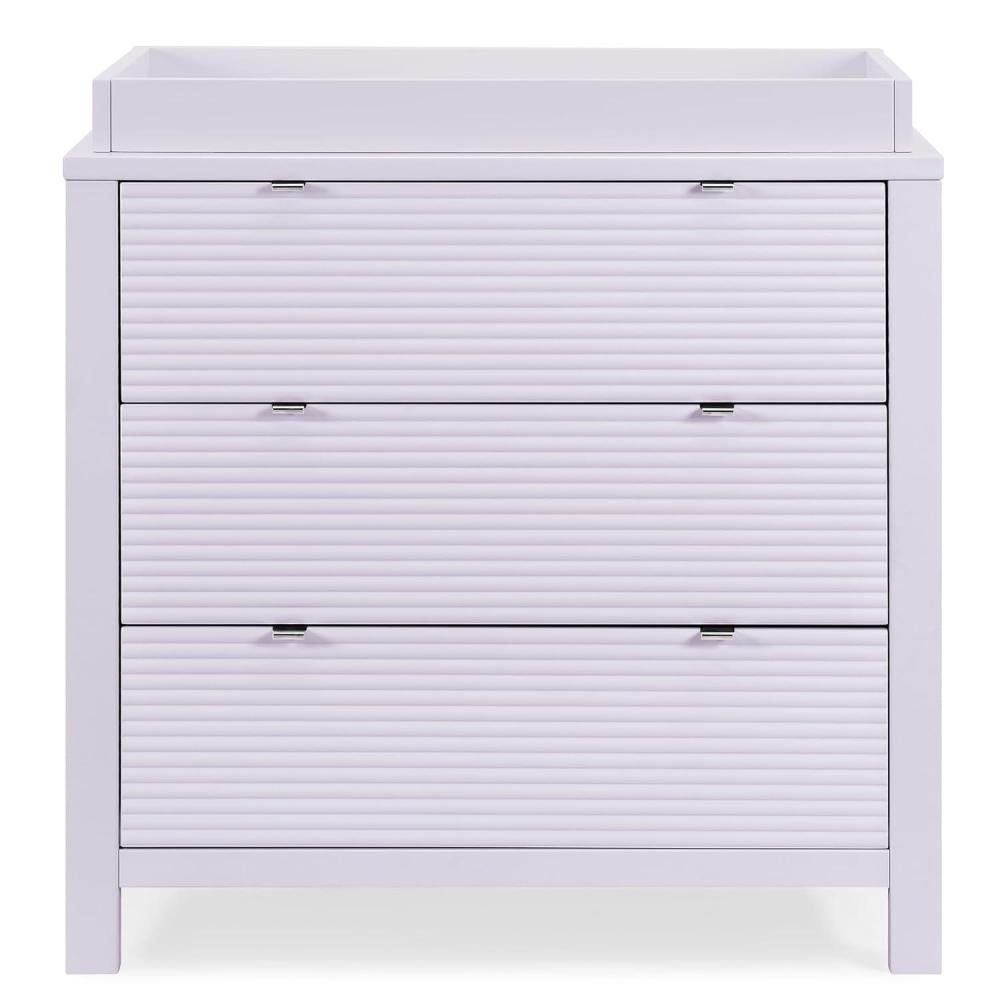 Complete their bedroom with the Cassie 3 Drawer Dresser with Changing Top by Delta Children With three roomy drawers and a modern design that features fluted drawer fonts capped with chrome pulls, there's room for everything. This spacious storage piece serves as a sturdy changing table too, with the included changing topper (changing pad sold separately). When your child grows, just remove the topper, it easily transitions into a stand-alone dresser. This dresser also features a durable construction made from sustainable woods like New Zealand pine and interlocking drawers that only allow one drawer to be opened at any time for your child’s safety. Available in Bianca White, Midnight Gray and Lilac. Pair this dresser with the Cassie 4-in-1 Convertible Crib to complete your space.