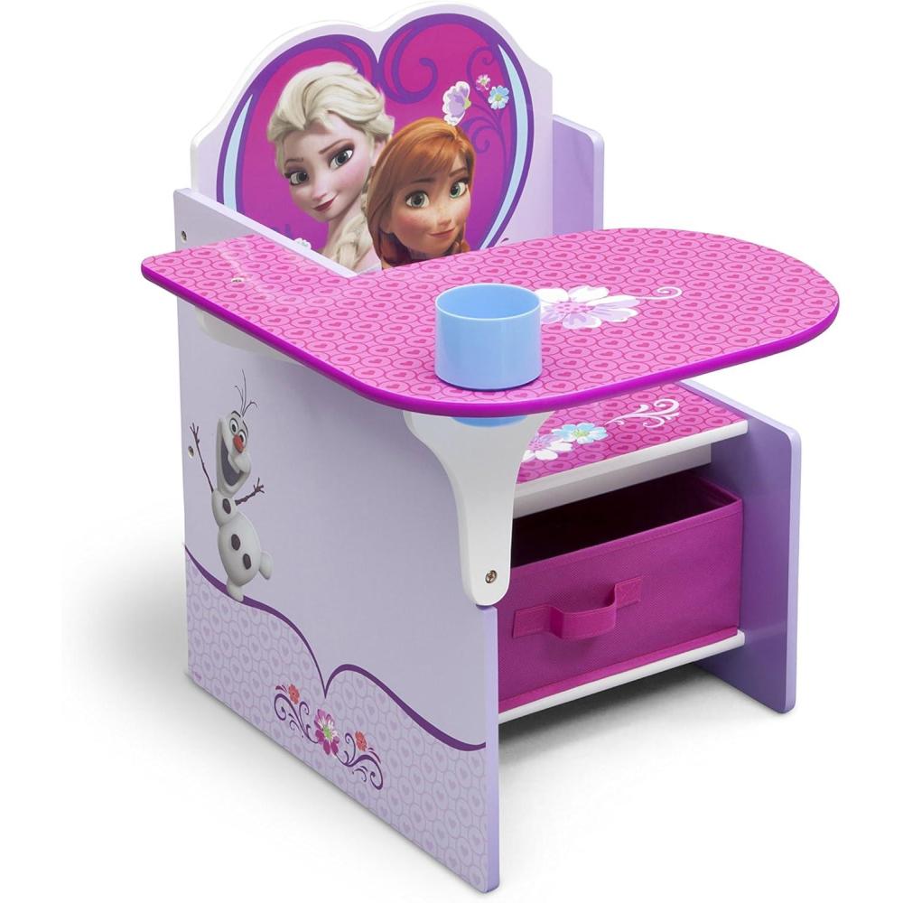 Your little one will feel every bit the cool queen with this Disney Frozen Chair Desk with Storage Bin from Delta Children! Boasting colorful graphics of Arendelle's most glamorous sisters, Anna and Elsa, this desk with a loveable heart-shaped back also features a built-in cup holder and a storage bin underneath.