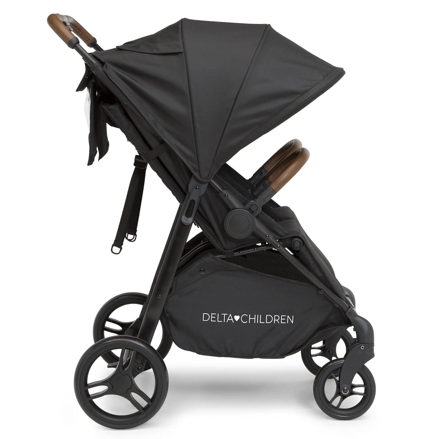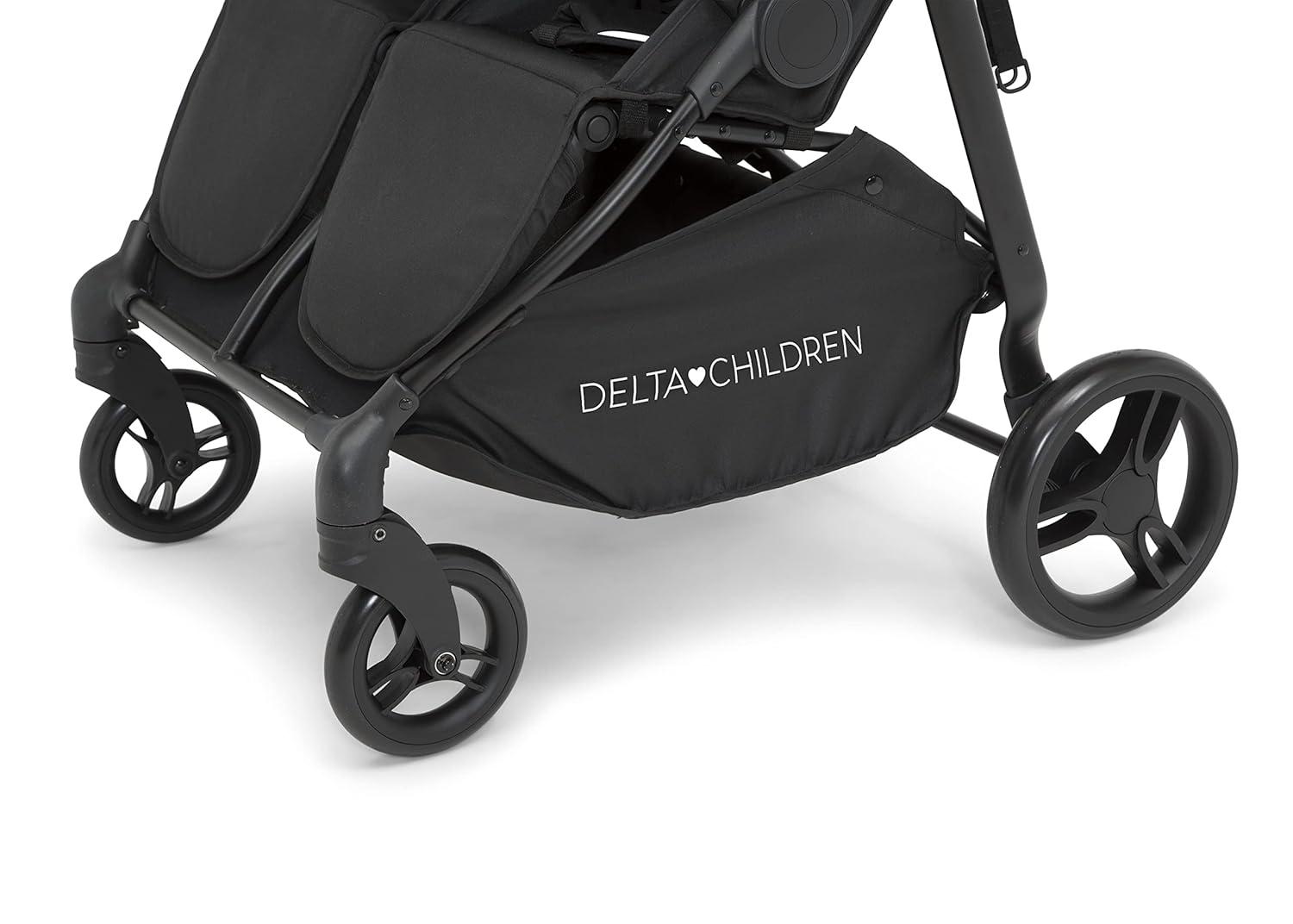 Siblings, twins or friends can ride side by side comfortably with the Delta Children Cruzer Double Stroller. Featuring front swivel wheels for 360-degree maneuverability and one-step back brake for ultra-smooth rides, this double stroller will not weigh you down thanks to its lightweight frame and puncture-proof airless tires that will never go flat. The stroller’s two front-facing seats feature multi-position recline, adjustable footrests and two extendable canopies with peek-a-boo windows for ultimate comfort. Two detachable storage pockets on the back and extra-large storage baskets under the seats ensure you have plenty space for all your travel necessities. The compact, flat fold with auto latch lock provide ultimate convenience. Designed with a soft, faux leather handlebar and child bar, the modern design of this everyday stroller is easy to navigate, transport, and store. Stroller features two 5-point safety harness and reflective shoulder pads. Each seat supports kids from 6 months, up to 35 lbs. (70 lbs. total). Product dimensions are 35.5 L x 28.7 W x 42.1 H inches. It weighs 29.8 lbs.