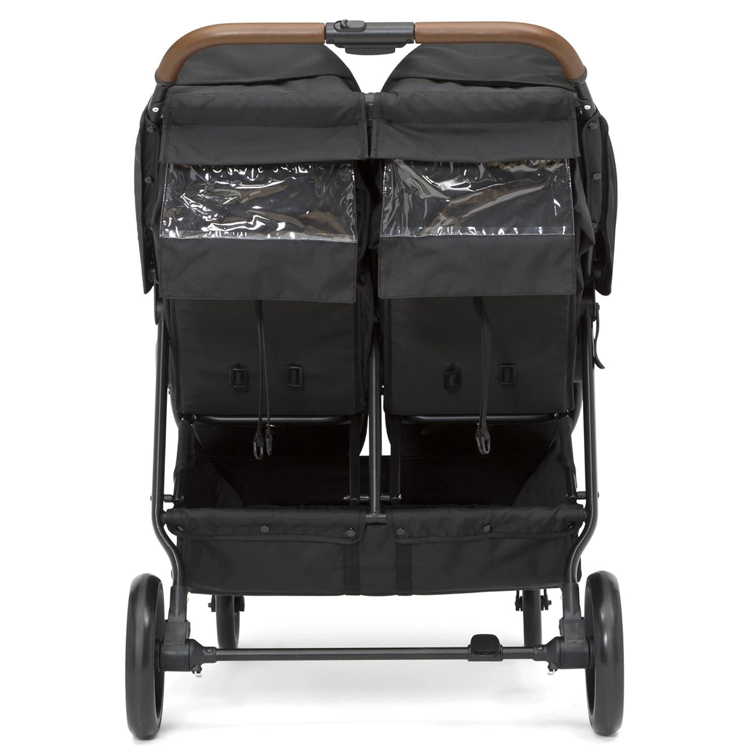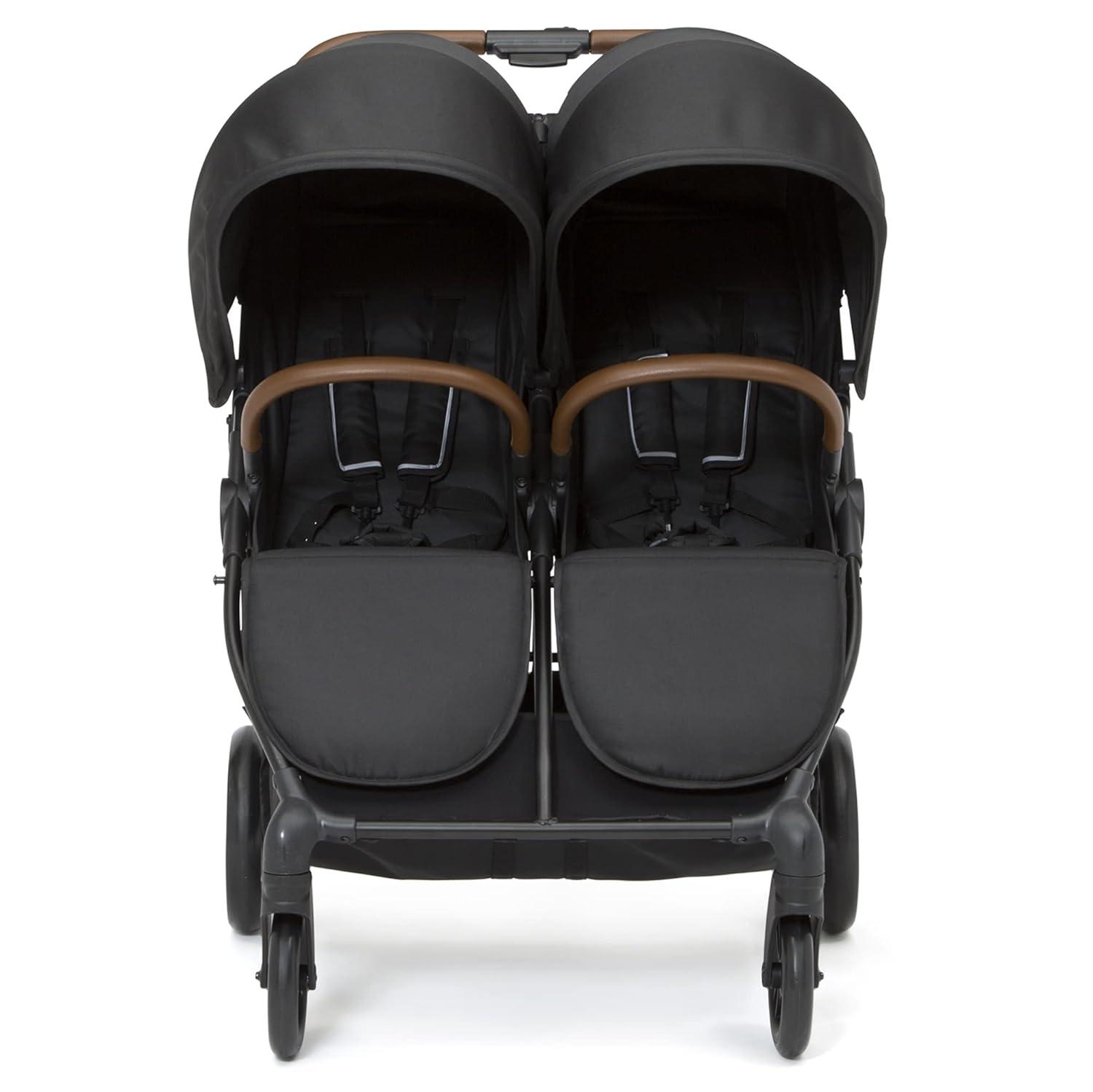 RIDE SIDE BY SIDE: Kids will comfortably ride side by side in this versatile double stroller | Stroller has 2 extendable canopies w/ peek-a-boo windows, adjustable footrests and multi-position recline | Faux leather handlebar/child bar adds a stylish touch