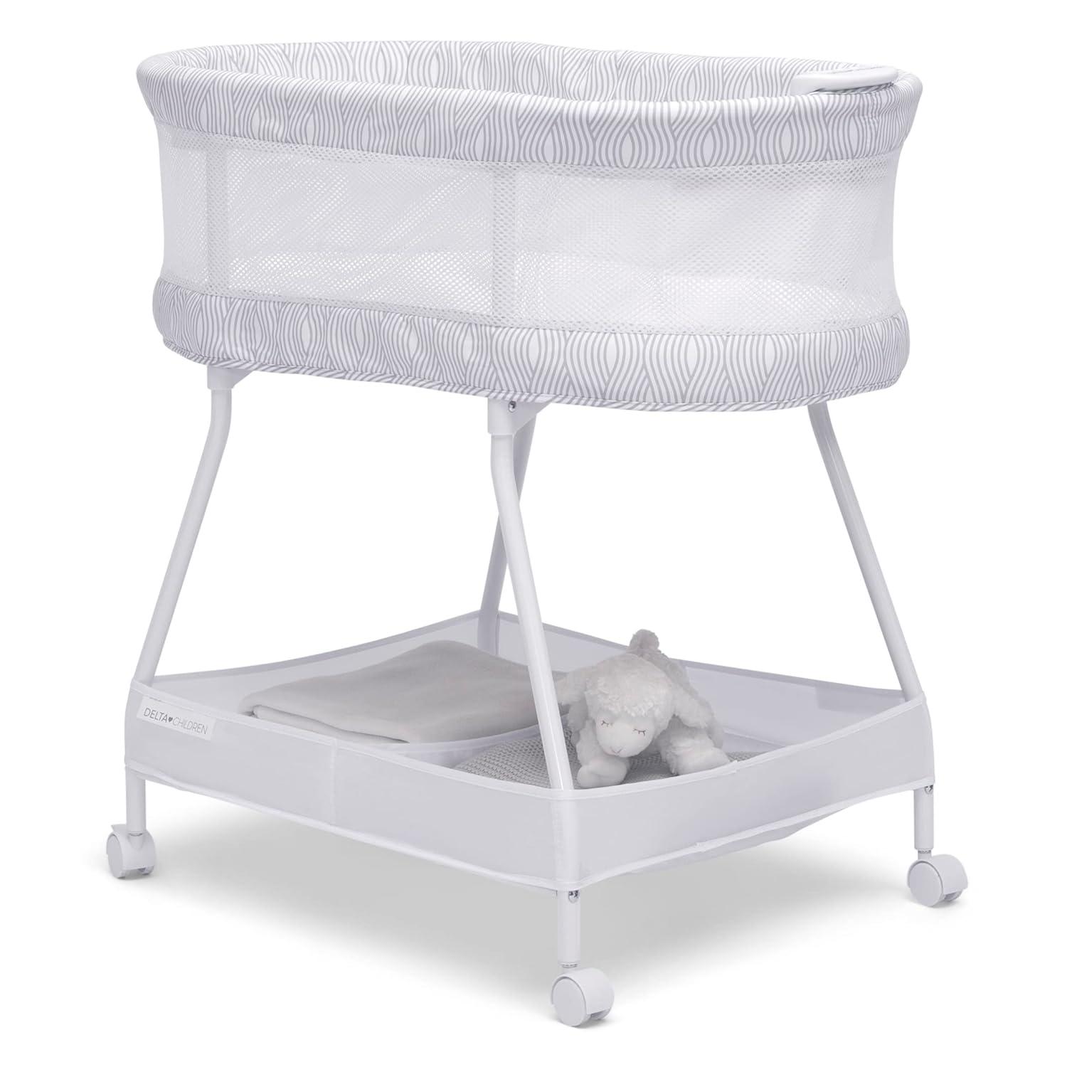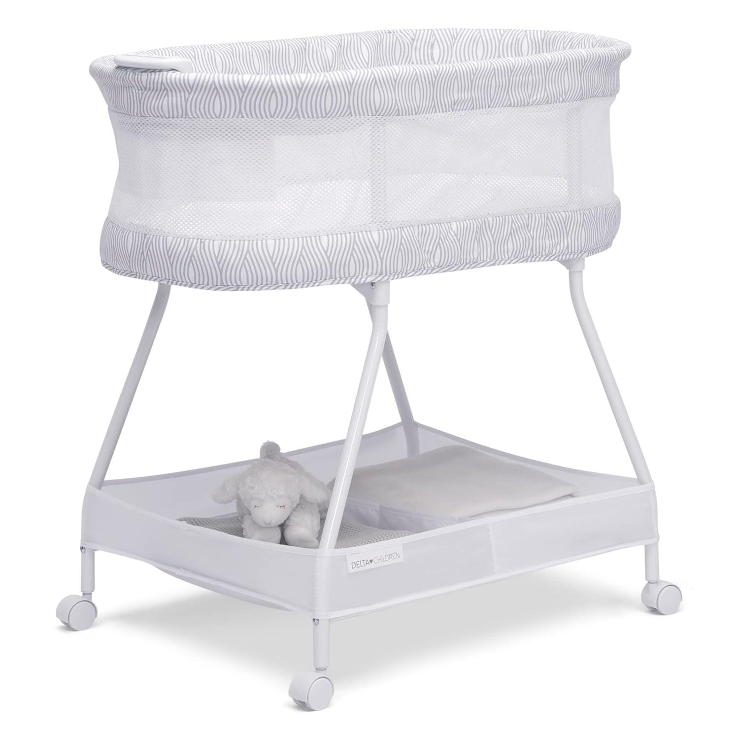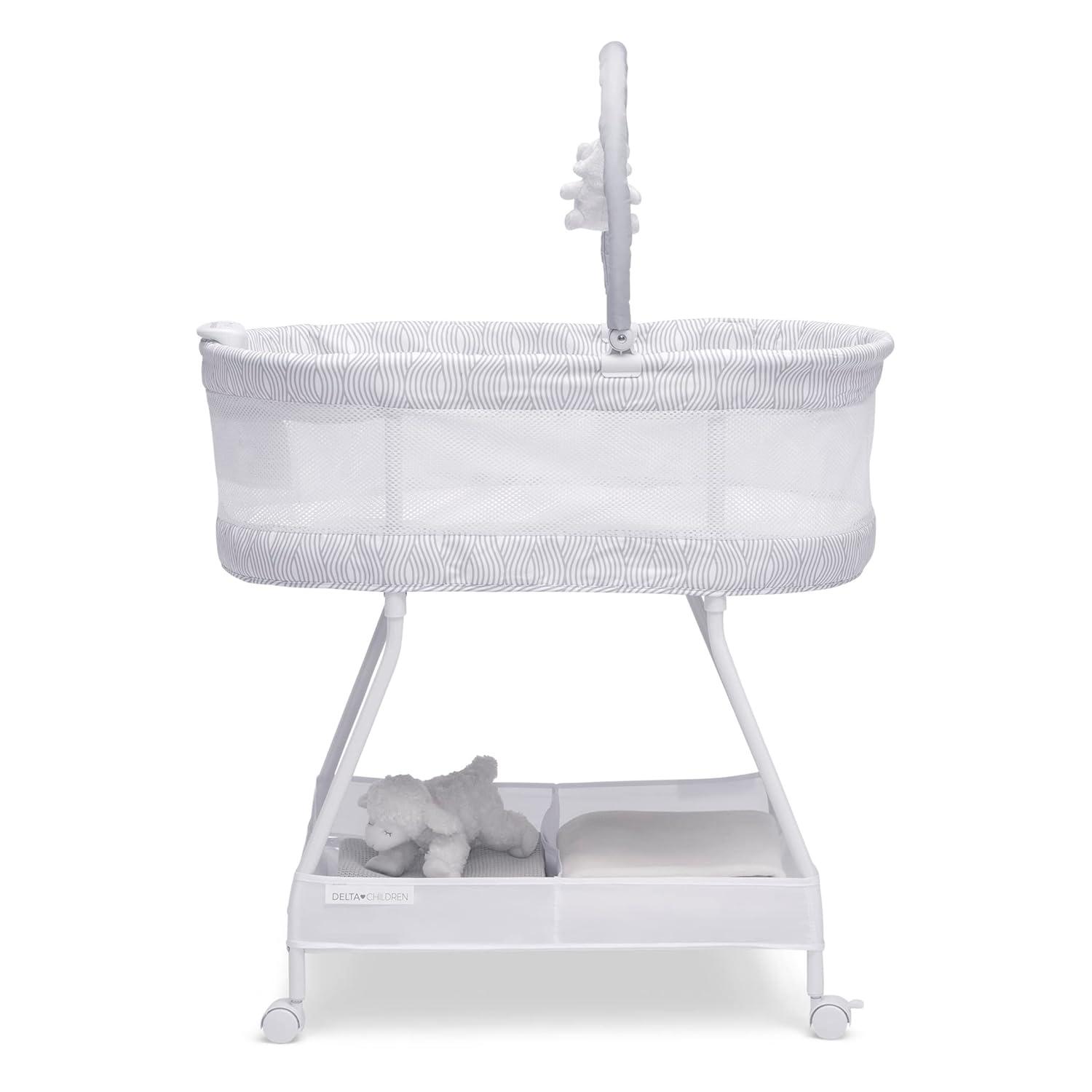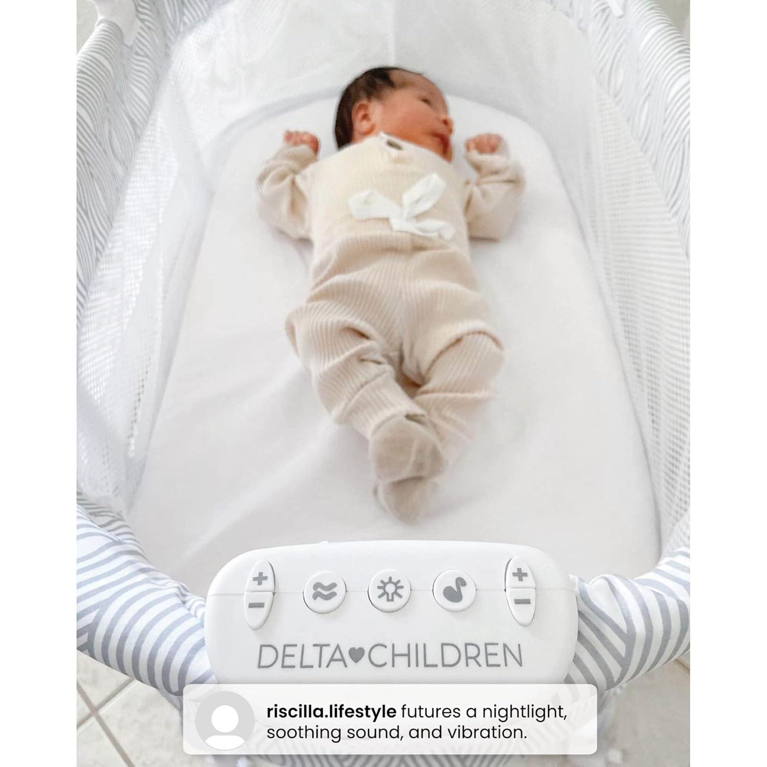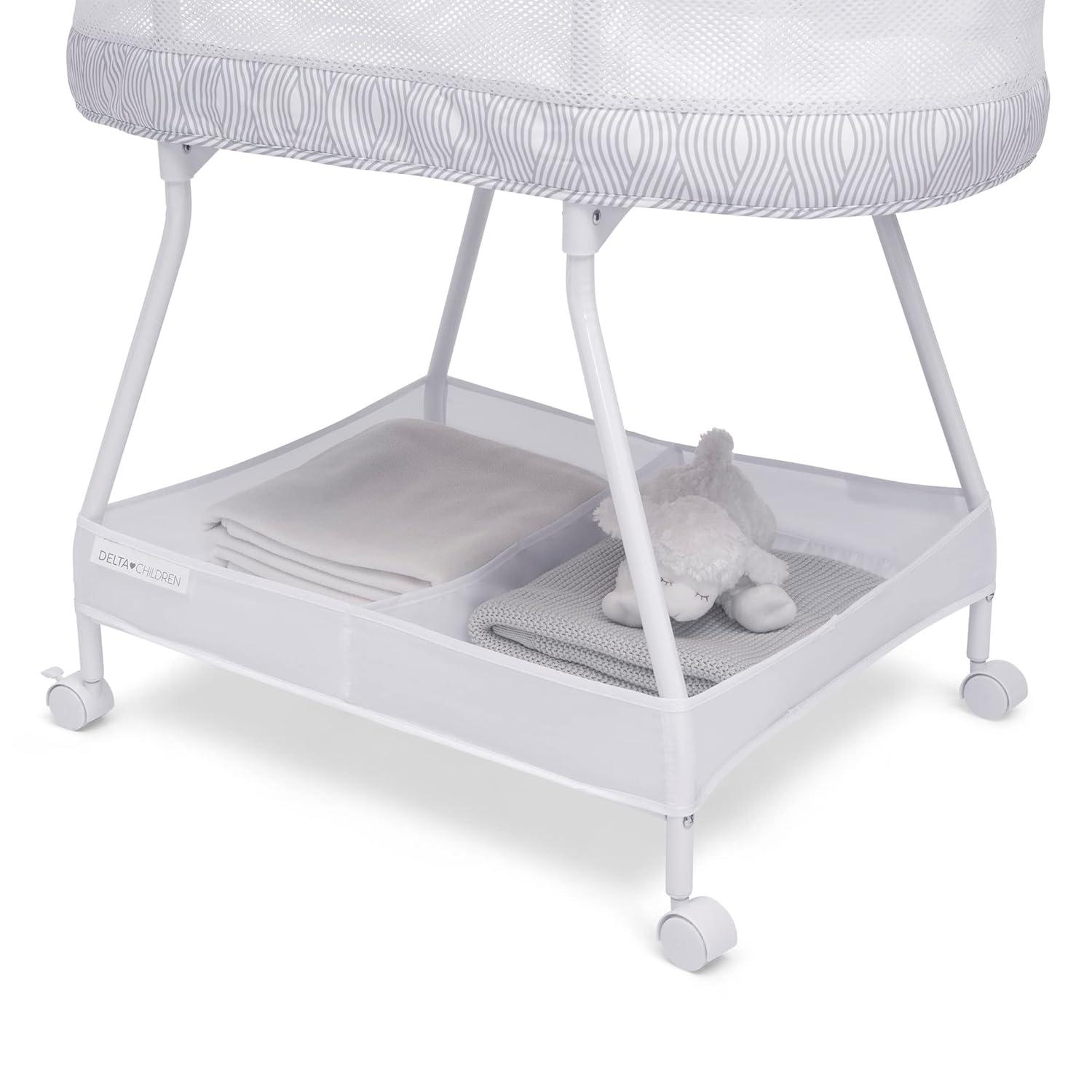 The Curve Bassinet by Delta Children is designed to help your little one fall asleep faster and stay asleep. This must-have bassinet features a control panel at the front with vibration, nightlight and soothing sounds to lull your newborn to sleep while mesh sides provide open airflow for breathability and a clear view of your baby. For your convenience, the adjustable toy bar provides entertainment if your baby wakes, lockable wheels make it easy to move around the house, and the easy-to-reach storage basket keeps changing essentials within reach. The Curve Bassinet by Delta Children is the easiest way stay safely connected and close to your baby during their first few months, and the modern wave print on the trim looks great in your master bedroom while room sharing or in your baby’s nursery. This bassinet is recommended for babies 0-5 months or up to 30lbs. Stop use at 5 months or once your infant begins to push up on their hands and knees, whichever comes first.