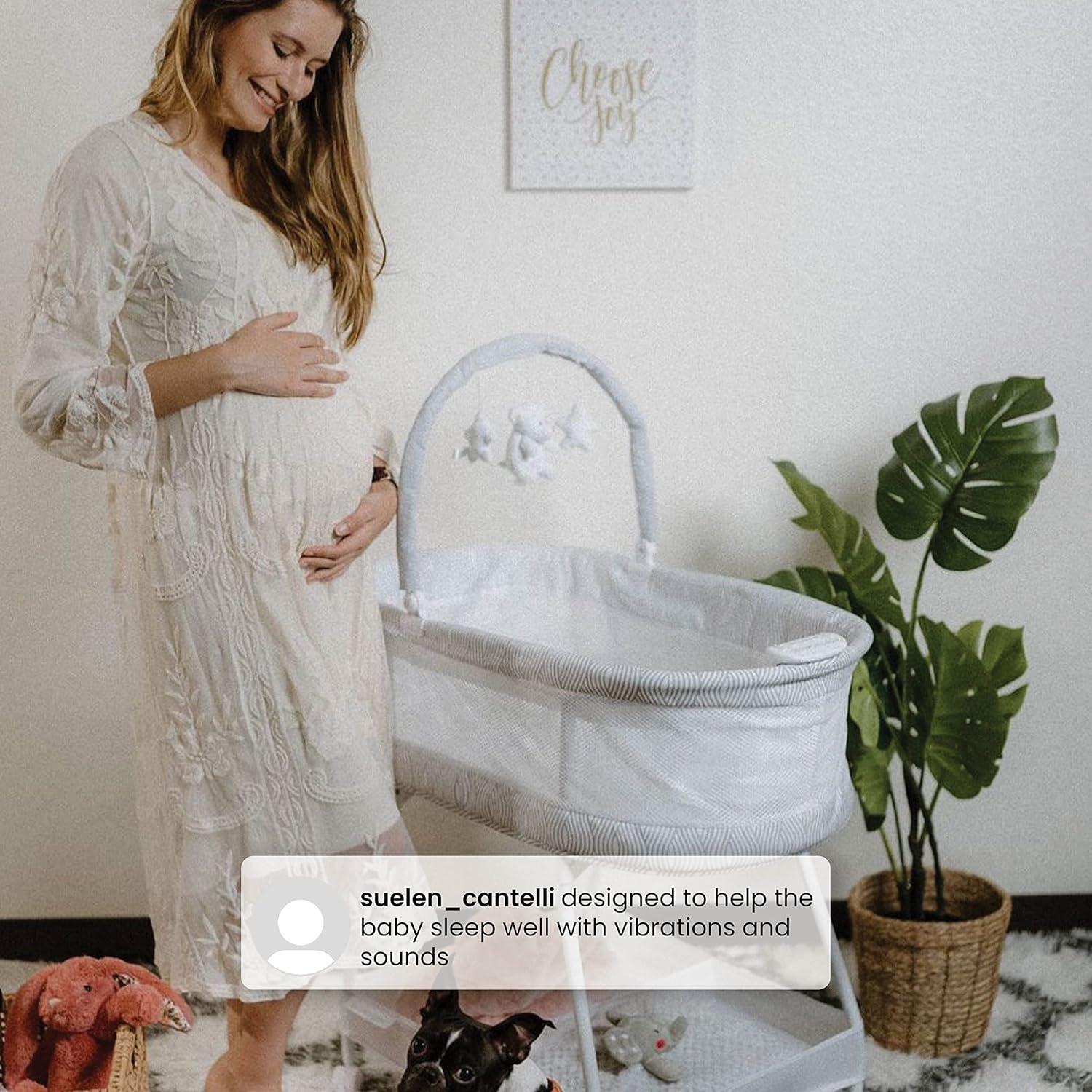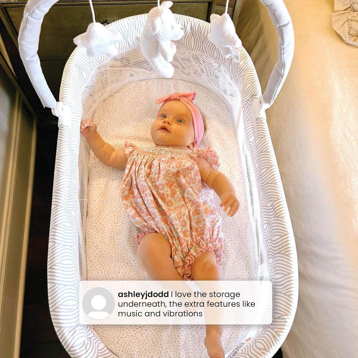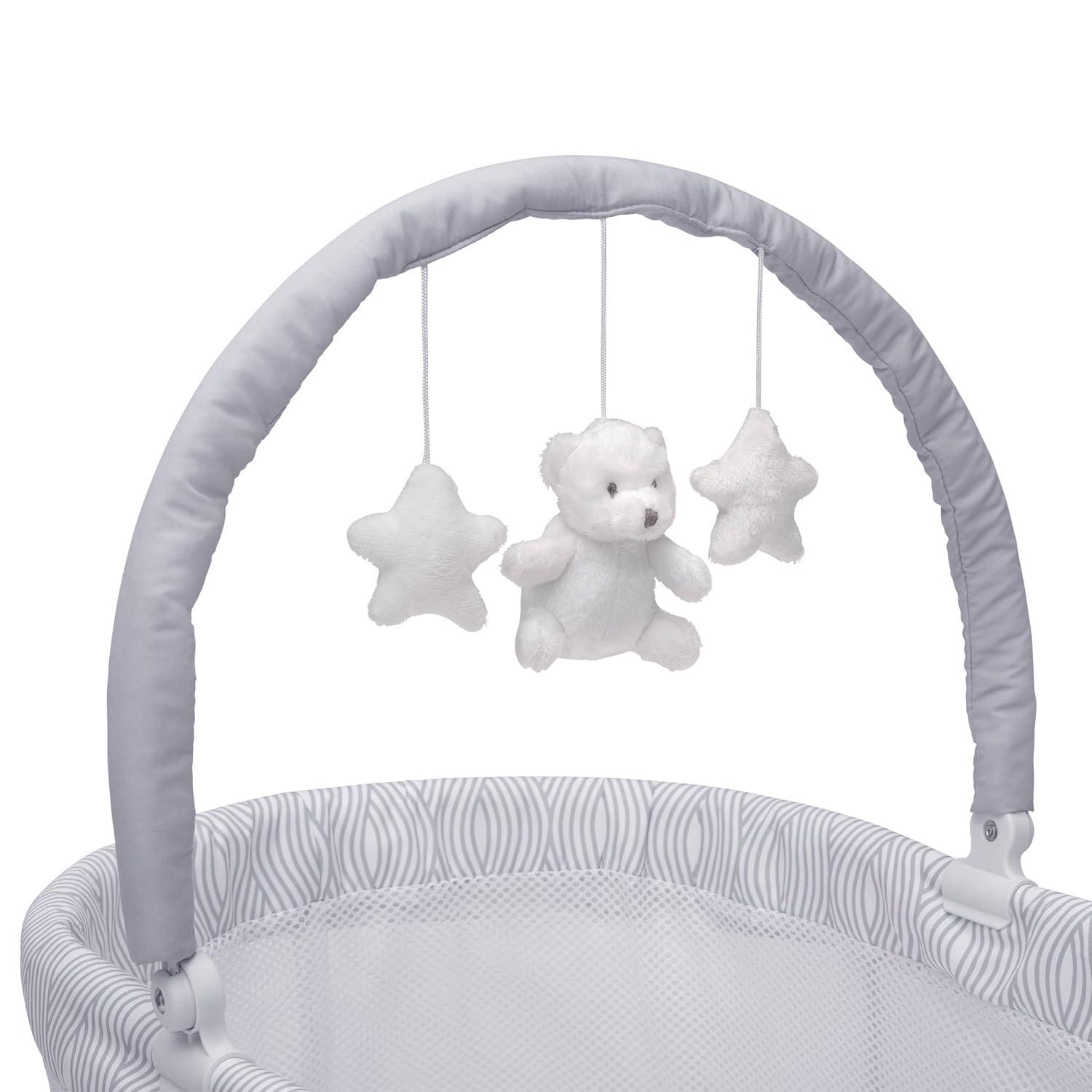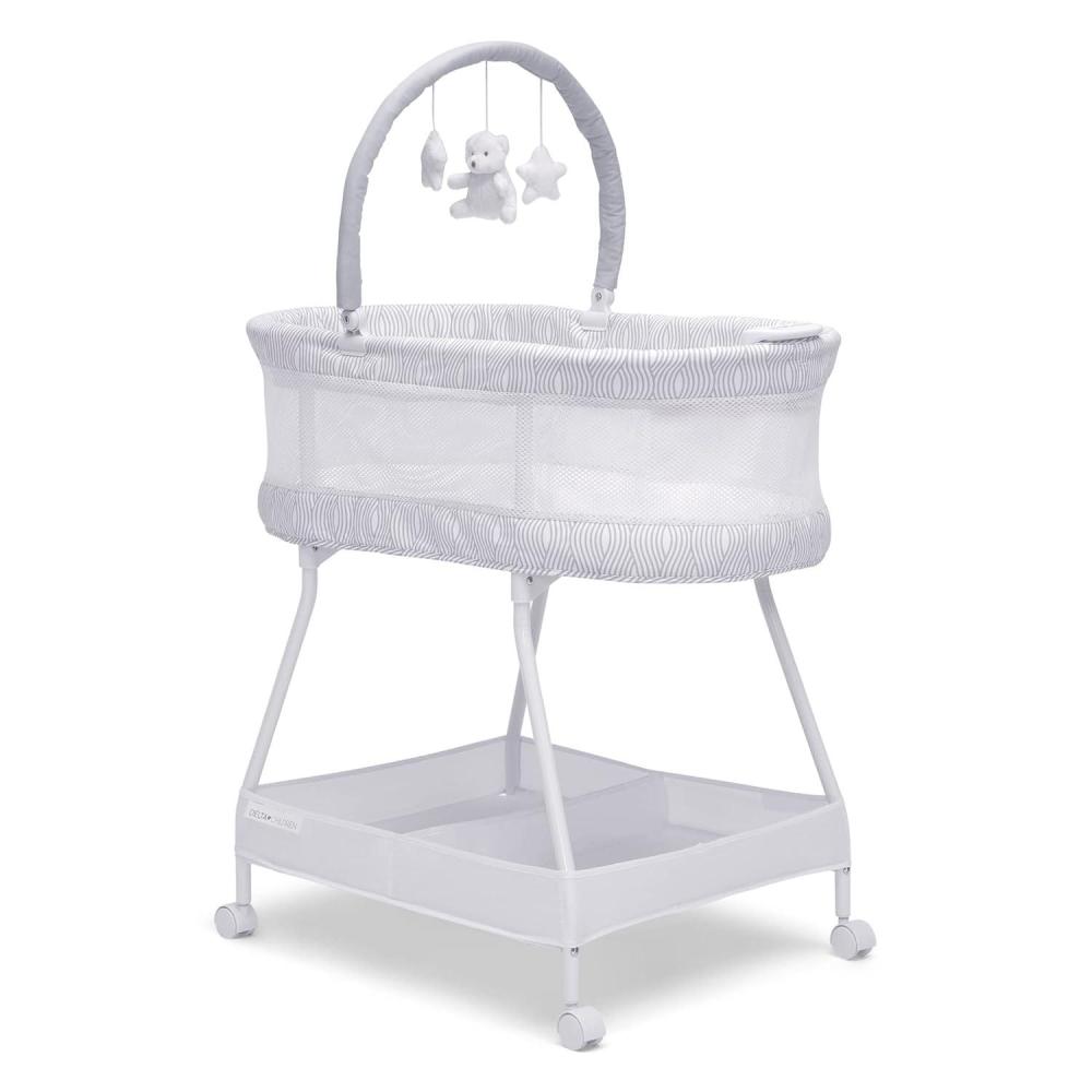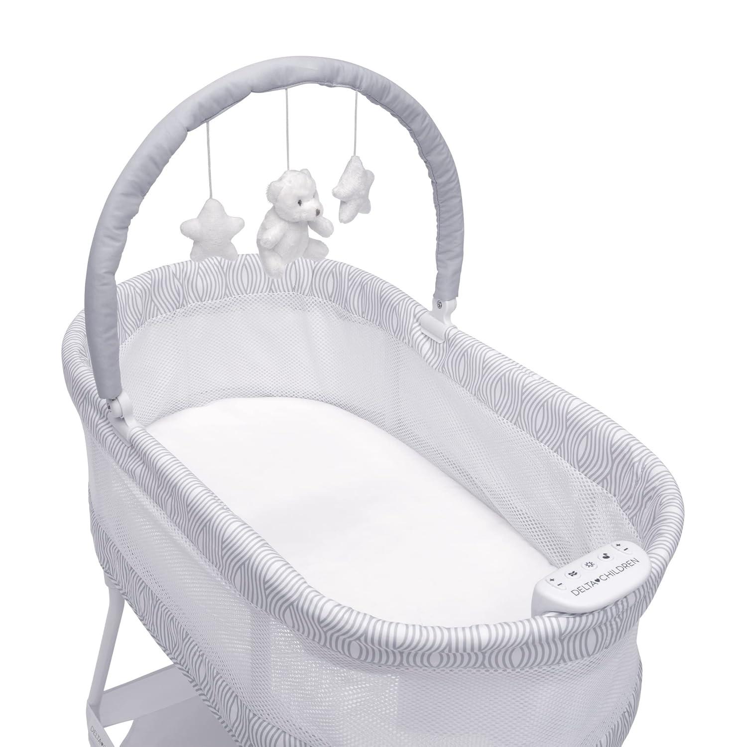 The Curve Bassinet by Delta Children is designed to help your little one fall asleep faster and stay asleep. This must-have bassinet features a control panel at the front with vibration, nightlight and soothing sounds to lull your newborn to sleep while mesh sides provide open airflow for breathability and a clear view of your baby. For your convenience, the adjustable toy bar provides entertainment if your baby wakes, lockable wheels make it easy to move around the house, and the easy-to-reach storage basket keeps changing essentials within reach. The Curve Bassinet by Delta Children is the easiest way stay safely connected and close to your baby during their first few months, and the modern wave print on the trim looks great in your master bedroom while room sharing or in your baby’s nursery. This bassinet is recommended for babies 0-5 months or up to 30lbs. Stop use at 5 months or once your infant begins to push up on their hands and knees, whichever comes first.