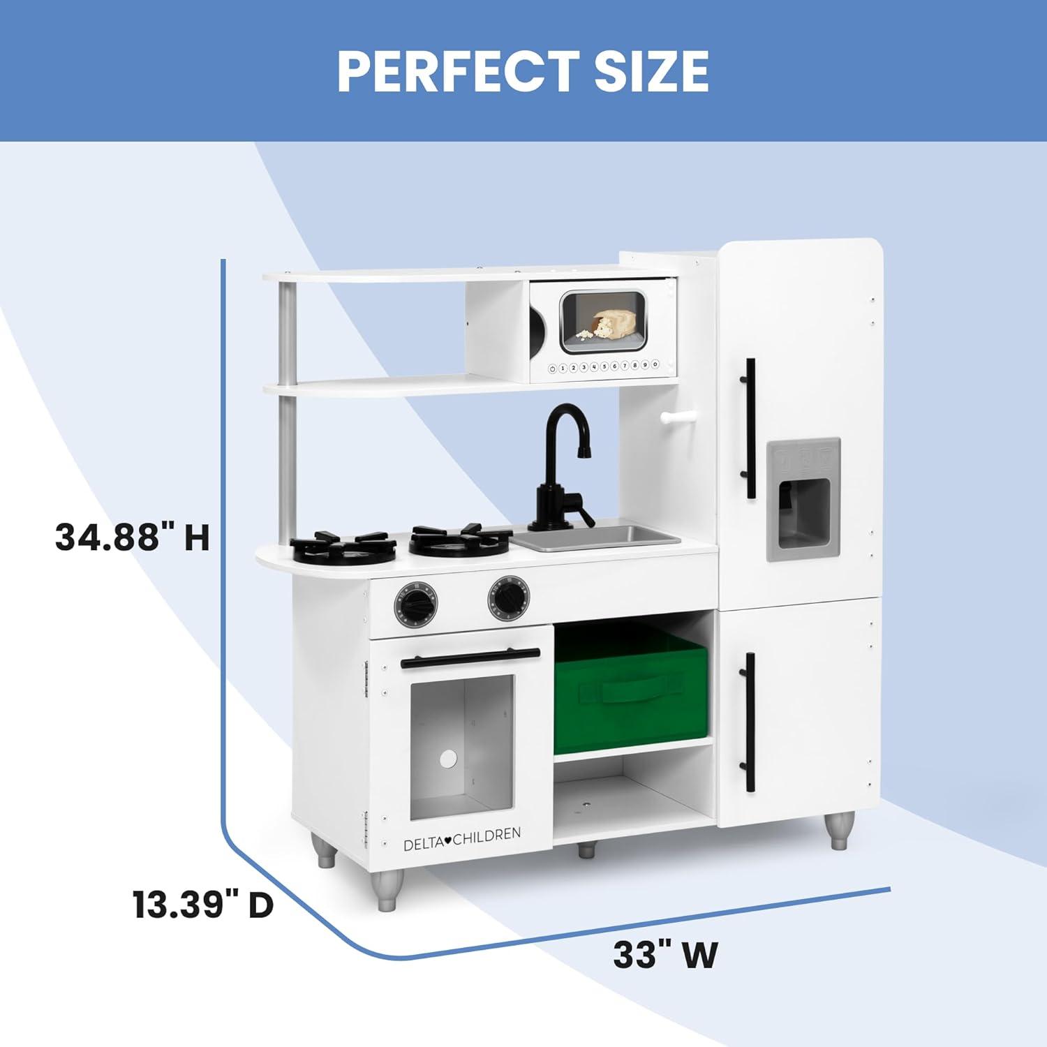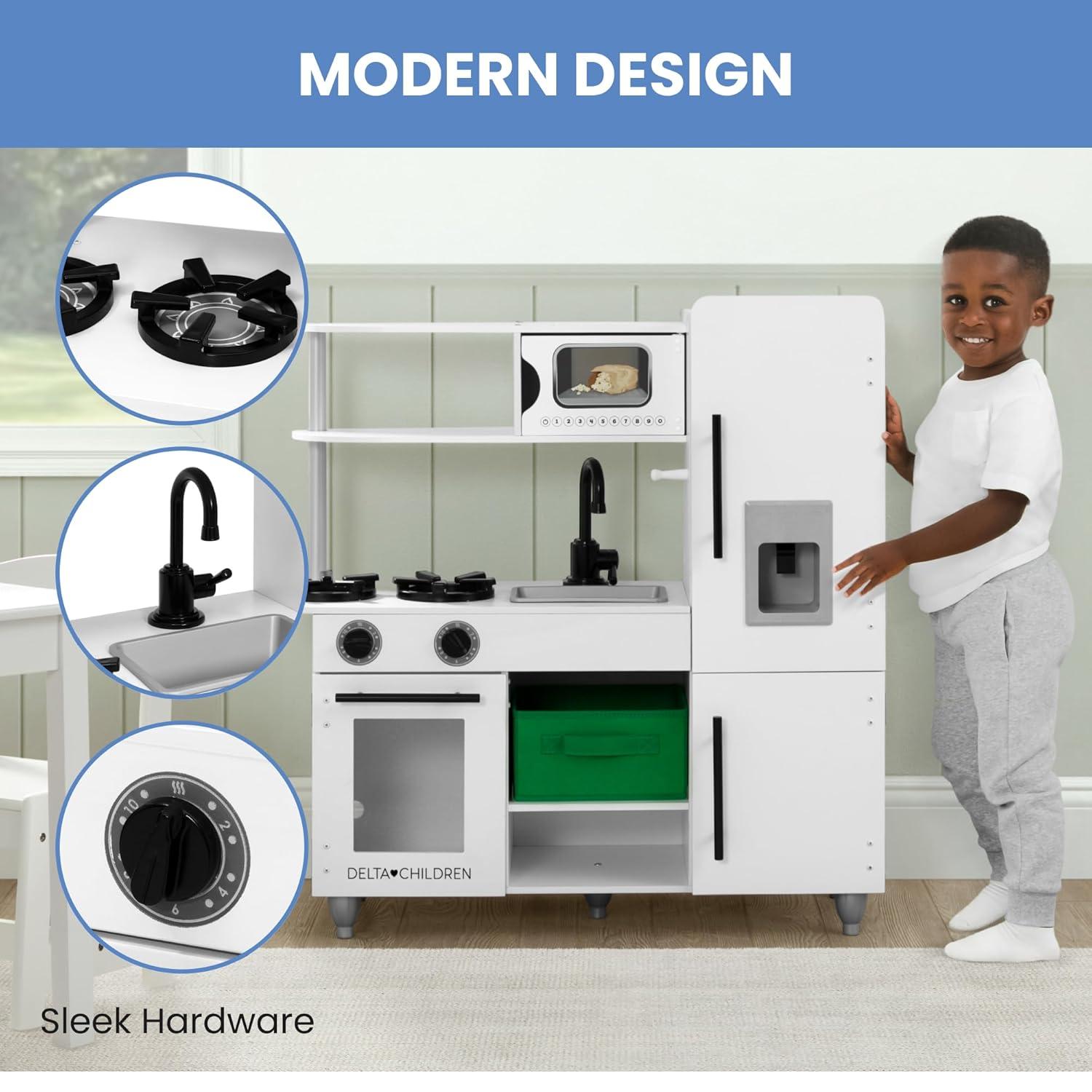 Delta Children Deluxe Modern Kitchen – Toy Kitchen Playset with Realistic Knobs That Turn/Click, Oven, Sink and Fridge/Freezer with Ice Maker, White