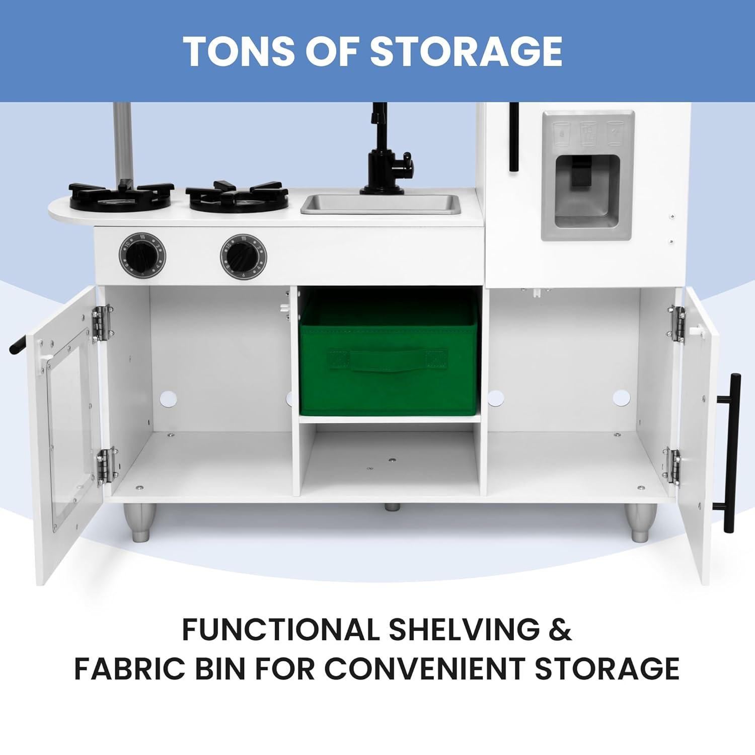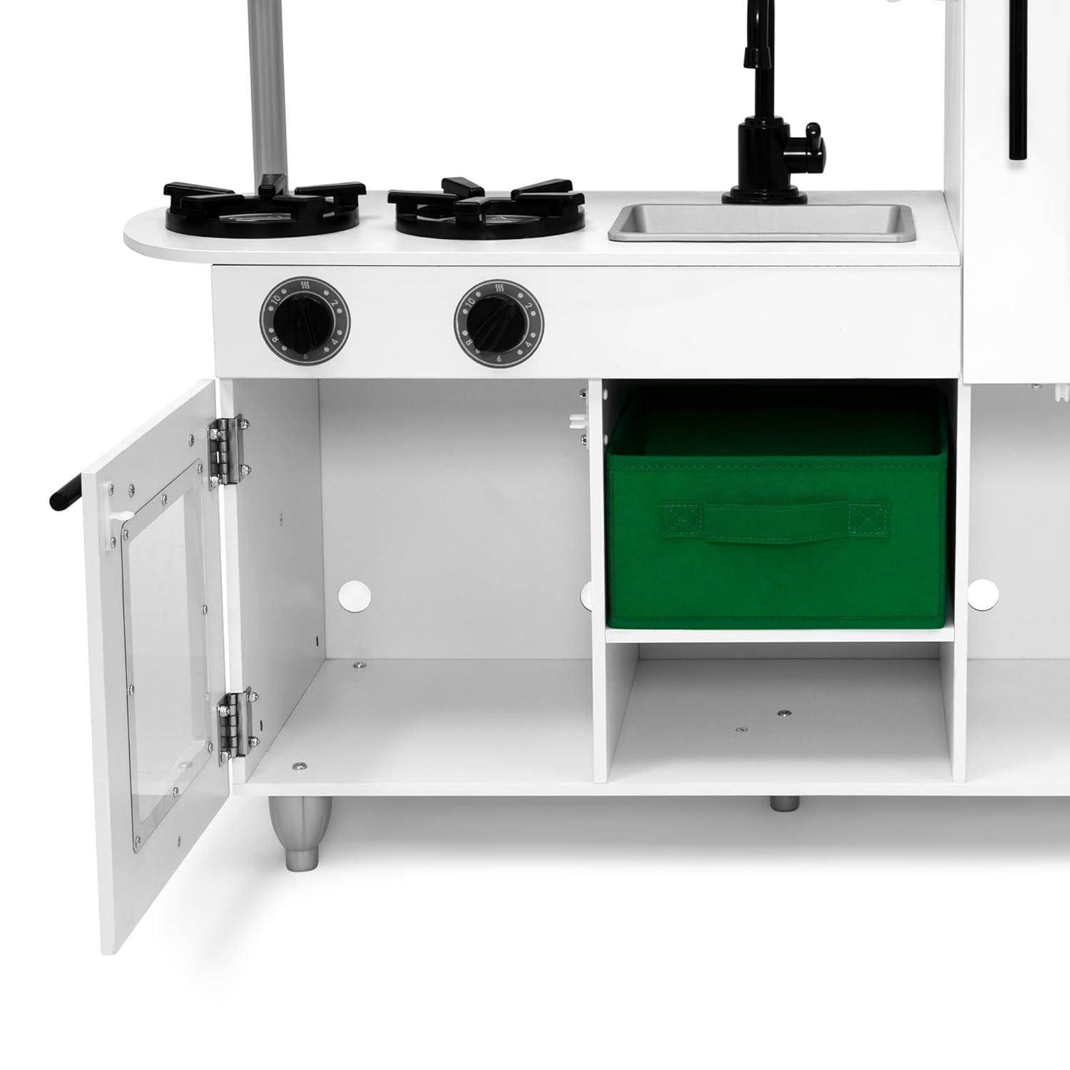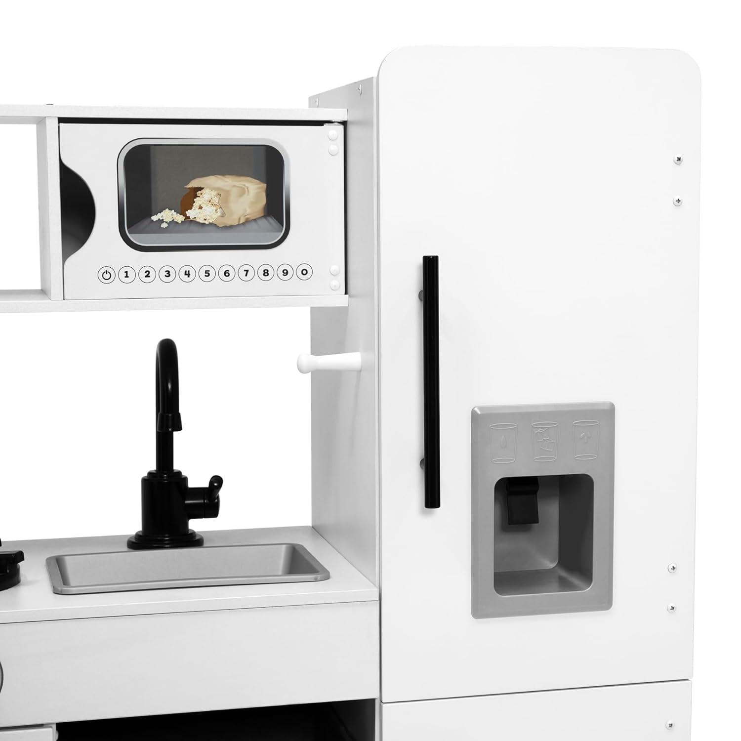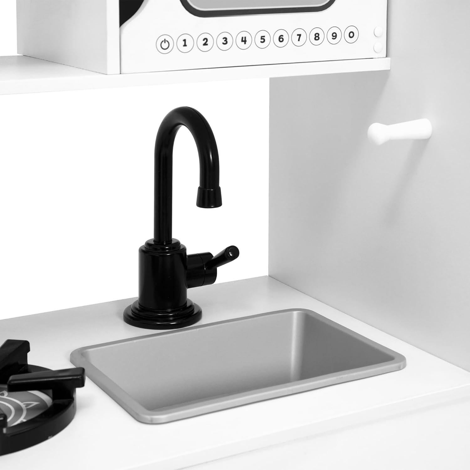 MODERN DESIGN: This play kitchen features a modern sink faucet and sleek black hardware | Large format provides room for multiple children to play | Crafted of premium and sustainable materials for a durable toy that can be passed down from kid to kid