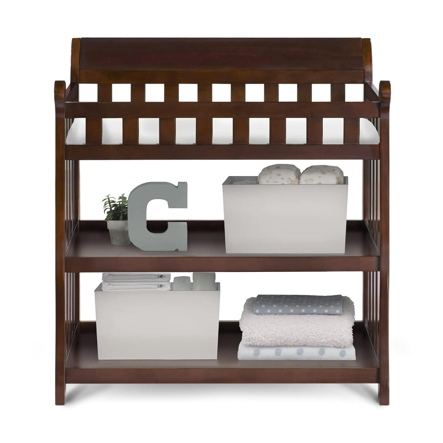 The Eclipse Changing Table combines function with style and craftsmanship. Its chic design, coupled with a gorgeous finish, makes it a must-have for your little one’s nursery. It features ample changing space with side rails to keep your baby safe. Comes with a waterproof mattress and safety strap. Two shelves provide easy to reach storage space for all things baby. Some assembly required. JPMA certified.
