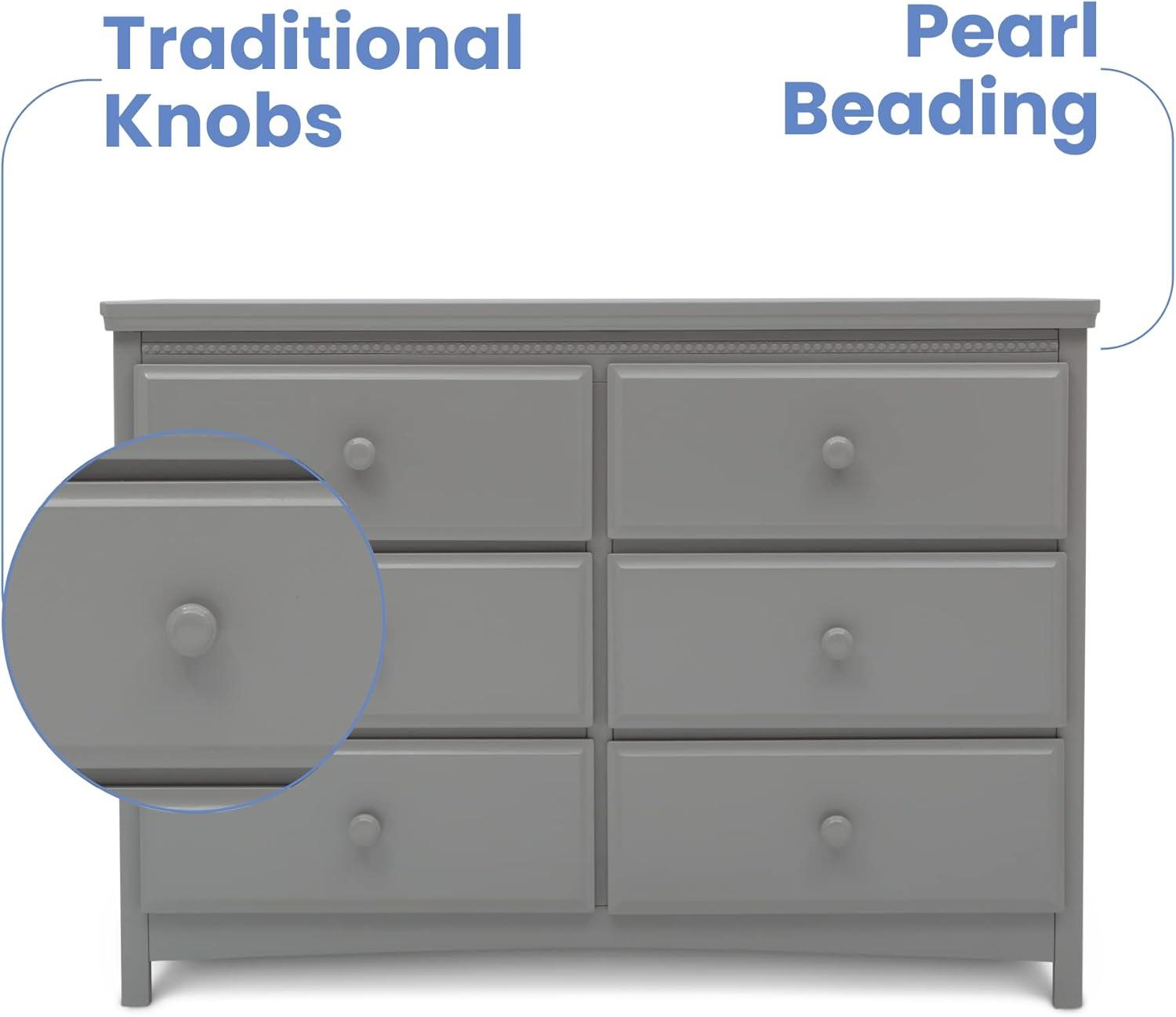 Classic styling and pearl detailing give the Emerson 6 Drawer Dresser by Delta Children A timeless quality. Equipped with six sliding drawers that feature safety stops to prevent the drawers from falling out, this dresser offers a wealth of storage space. Its beautiful finish will never go out of style, while its sturdy wood construction makes it as durable as it is attractive. Round drawer pulls provide a charming finishing touch. A great piece for the nursery, your kid's bedroom or your master bedroom, The Emerson is the smart choice for storage in any space. The Emerson 6 Drawer Dresser is part of the Emerson nursery collection. Pair with the Emerson 4-in-1 Convertible Crib for a coordinated look. Coordinating collection pieces each sold separately. All Delta Children dressers and chests meet the requirements of ASTM F2057, the voluntary industry tip over standard for dressers. For your children's safety, only purchase dressers that comply with this standard. For additional security, Delta strongly recommends that all dressers in your home be anchored; all Delta dressers include a wall anchor. To learn how to properly secure your dresser, please see the product assembly instructions or visit our website.