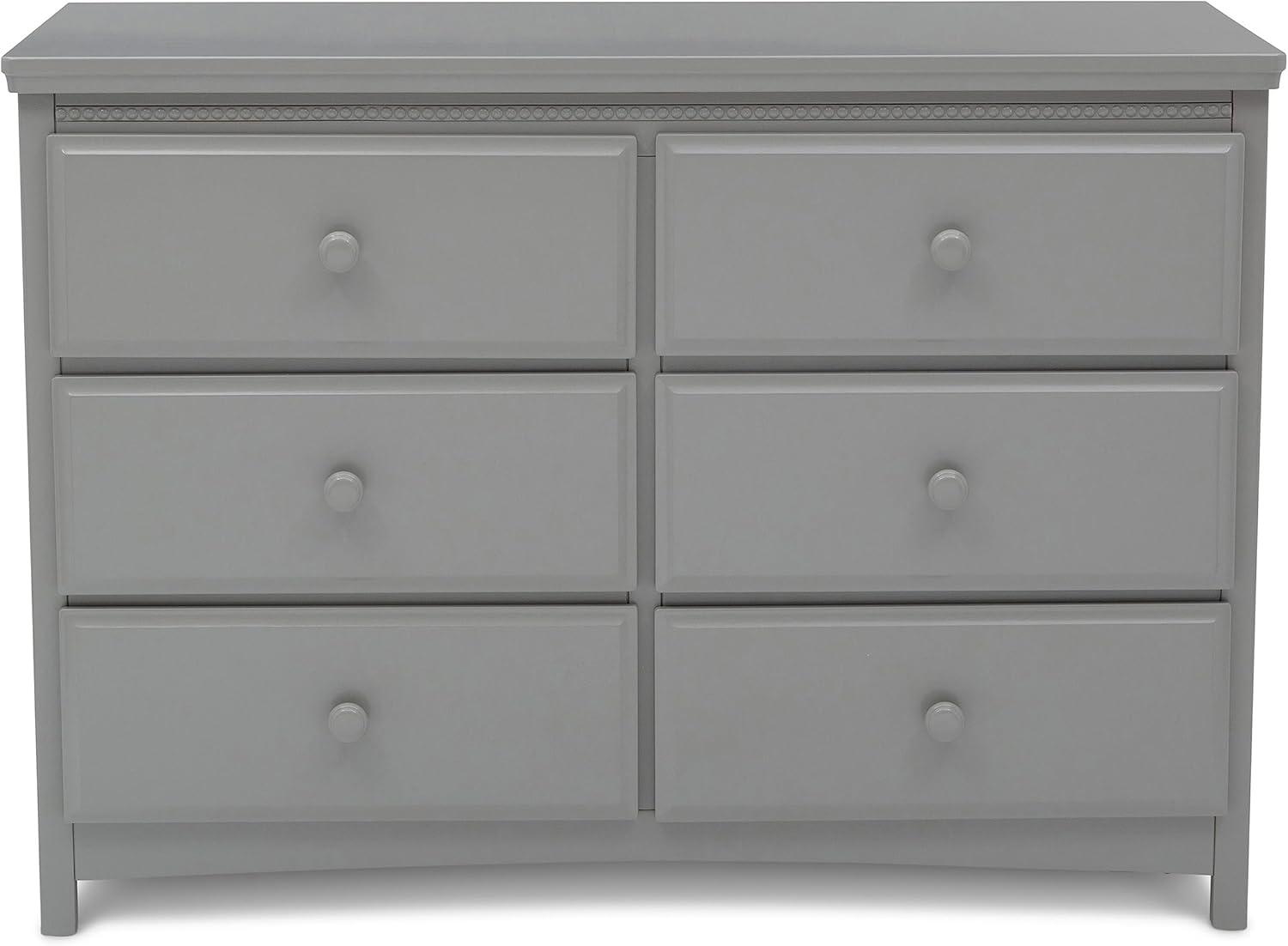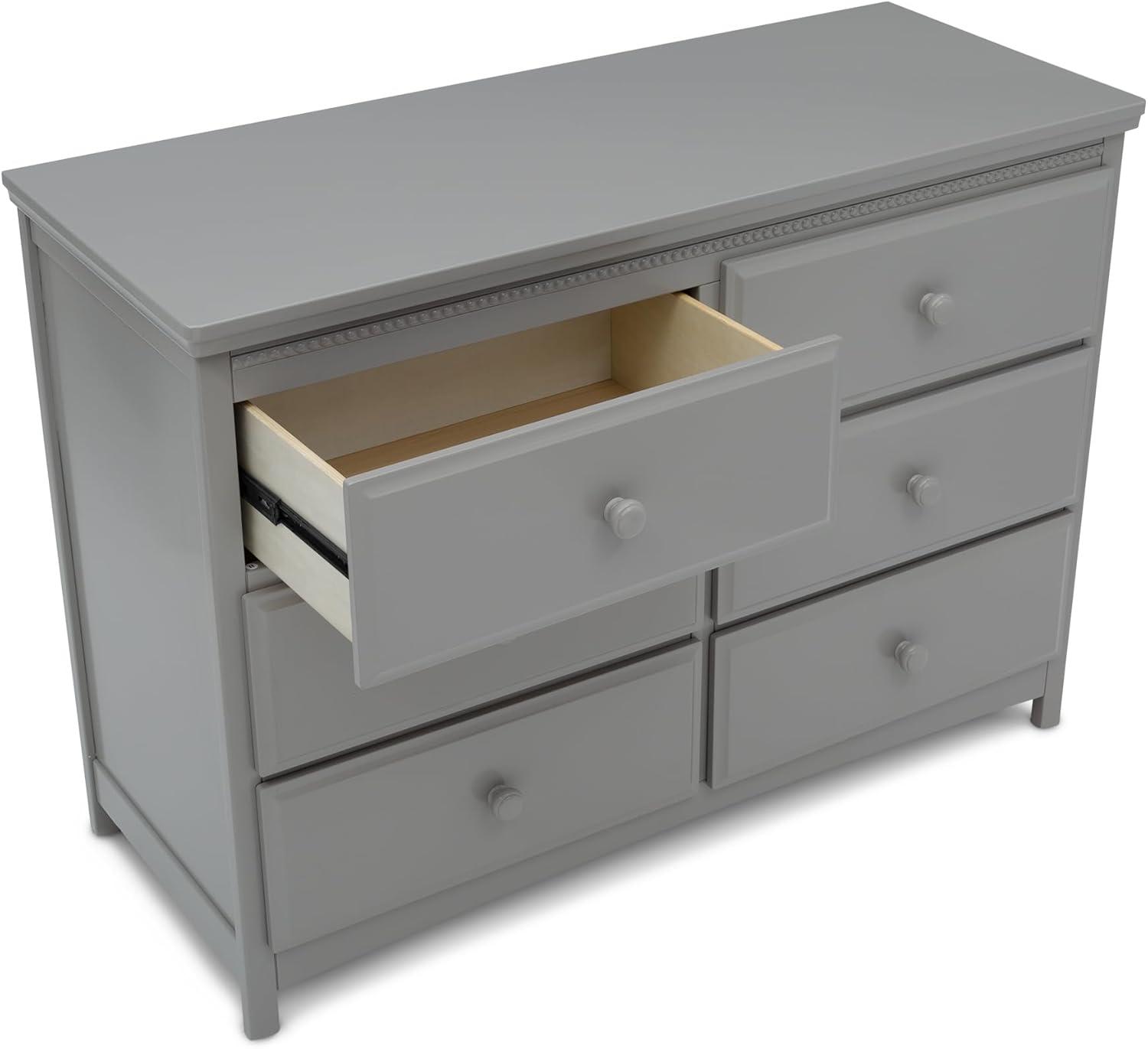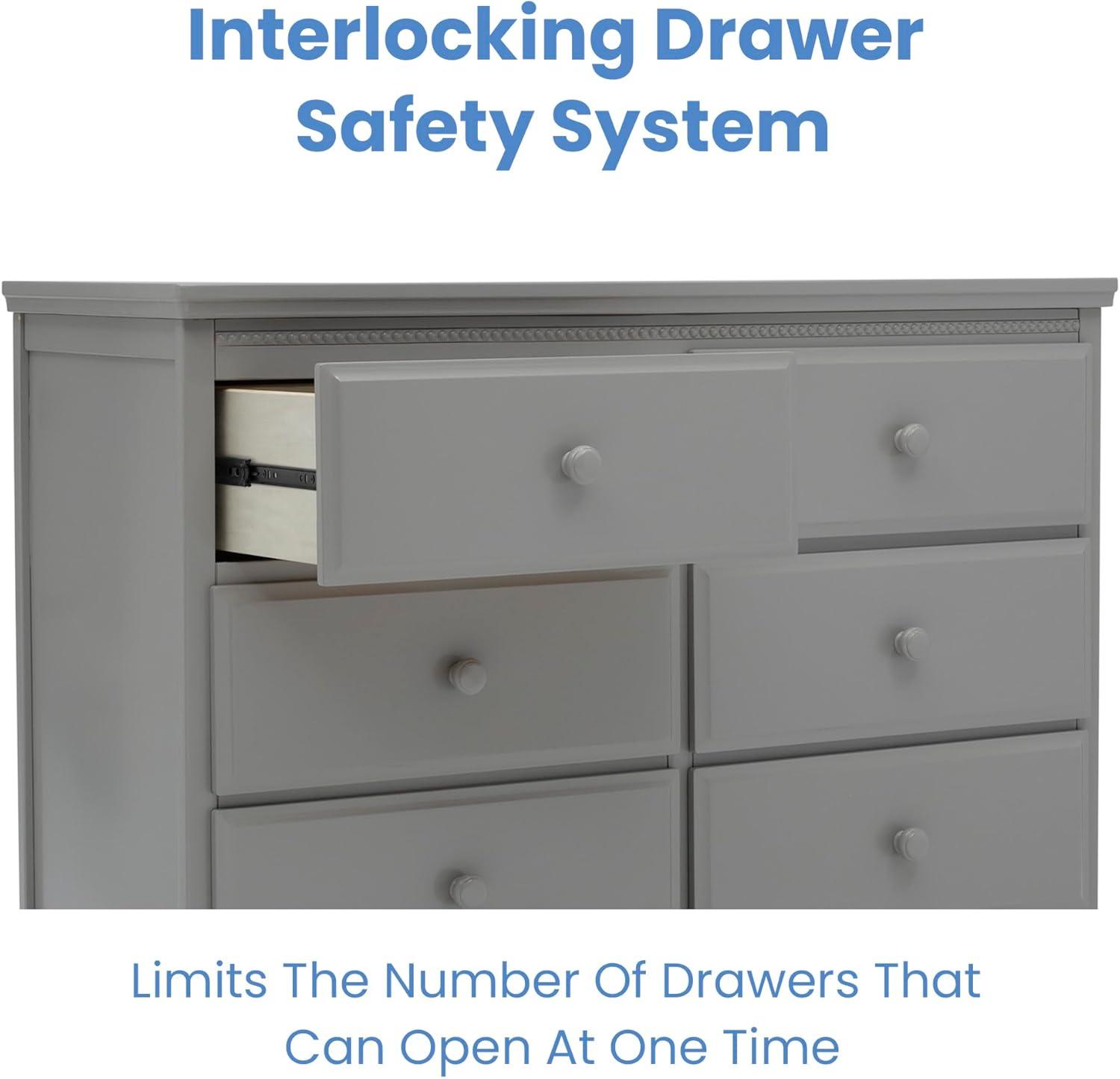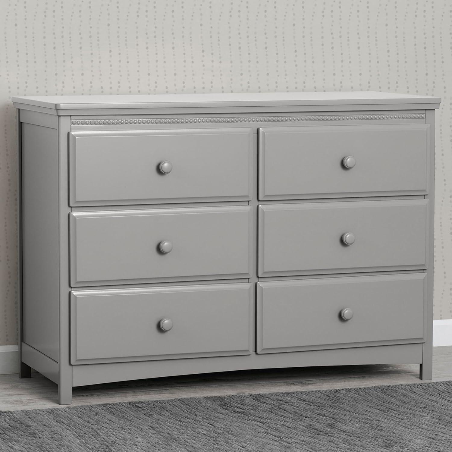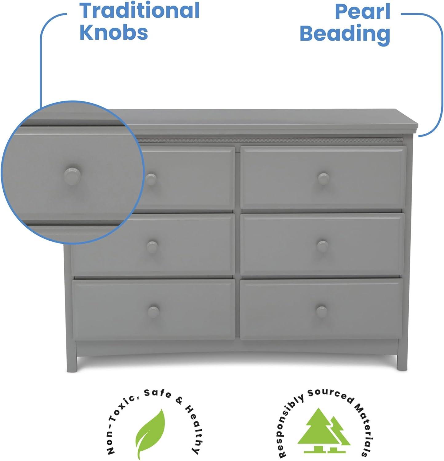 The Emerson 6 Drawer Dresser with Interlocking Drawers by Delta Children is an elegant addition for just about any nursery. Boasting a classic silhouette and pearl detailing, this piece features plenty of storage, making it as functional as it is fashionable. A smart choice for storage in any space, this dresser is outfitted with an interlocking drawer system that limits the number of drawers that can be opened at one time. Plus, it’s GREENGUARD Gold Certified, which means it’s built to contribute to cleaner air for a healthy home. The Emerson 6 Drawer Dresser is part of the Emerson Nursery Collection. Pair with the Emerson 4-in-1 Convertible Crib for a coordinated look (crib sold separately).