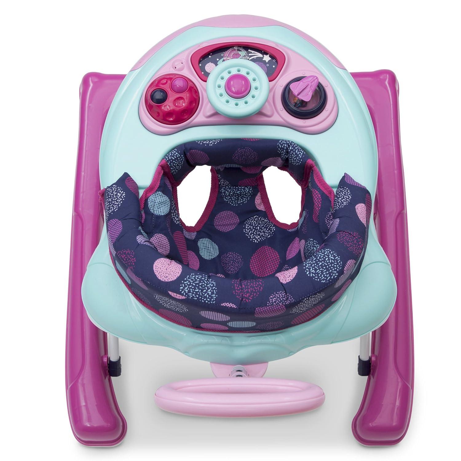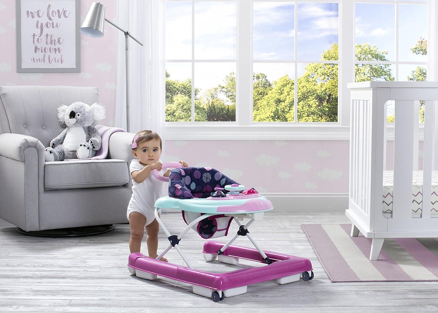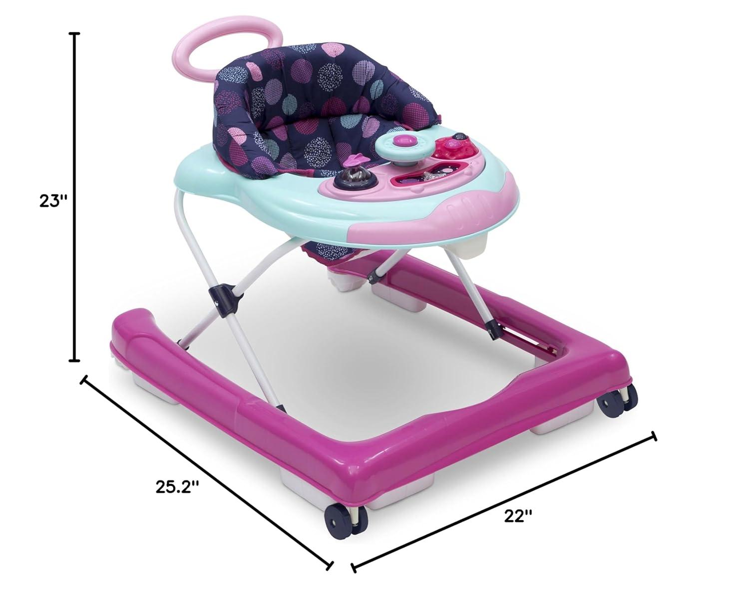 From baby steps to big steps, the First Exploration 2-in-1 Activity Walker from Delta Children is the perfect choice for your growing child. Two baby walkers in one, it transitions from an activity walker to a walk-behind walker. As an activity walker, the padded, high back chair offers plenty of comfort and support as your child begins exploring. The toy tray stimulates your baby's visual and auditory senses during playtime with music, lights and a steering wheel–it's easily removable so Baby can play with it anywhere. For meals or snack time, the toy tray easily pops off to reveal a spacious eating surface. Use this baby walker as a walk-behind when your child begins to take steps on their own, the comfy handle provides balance for beginning walkers. Plus, the ultra compact stow away position makes it easy to store this baby walker or take it on trips.