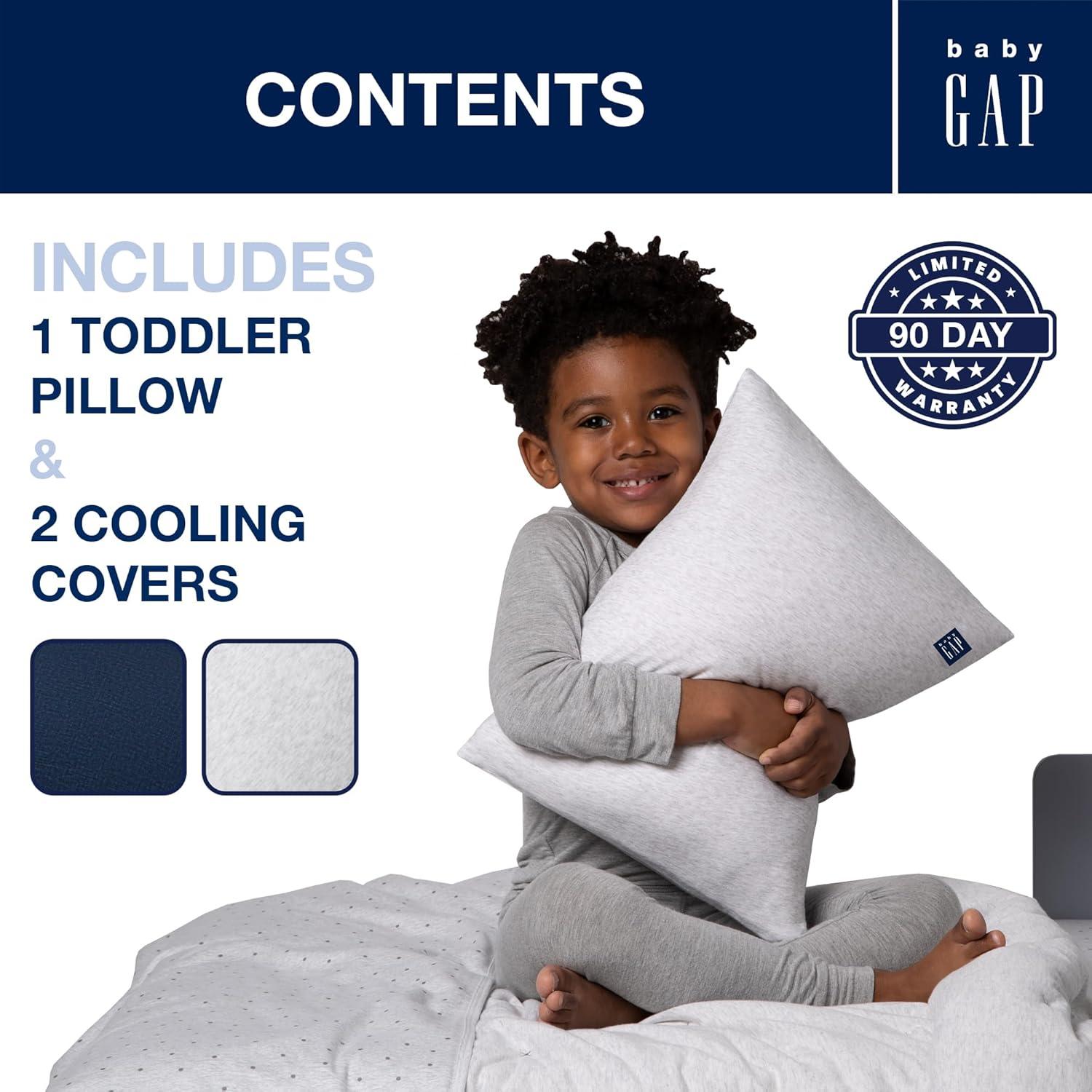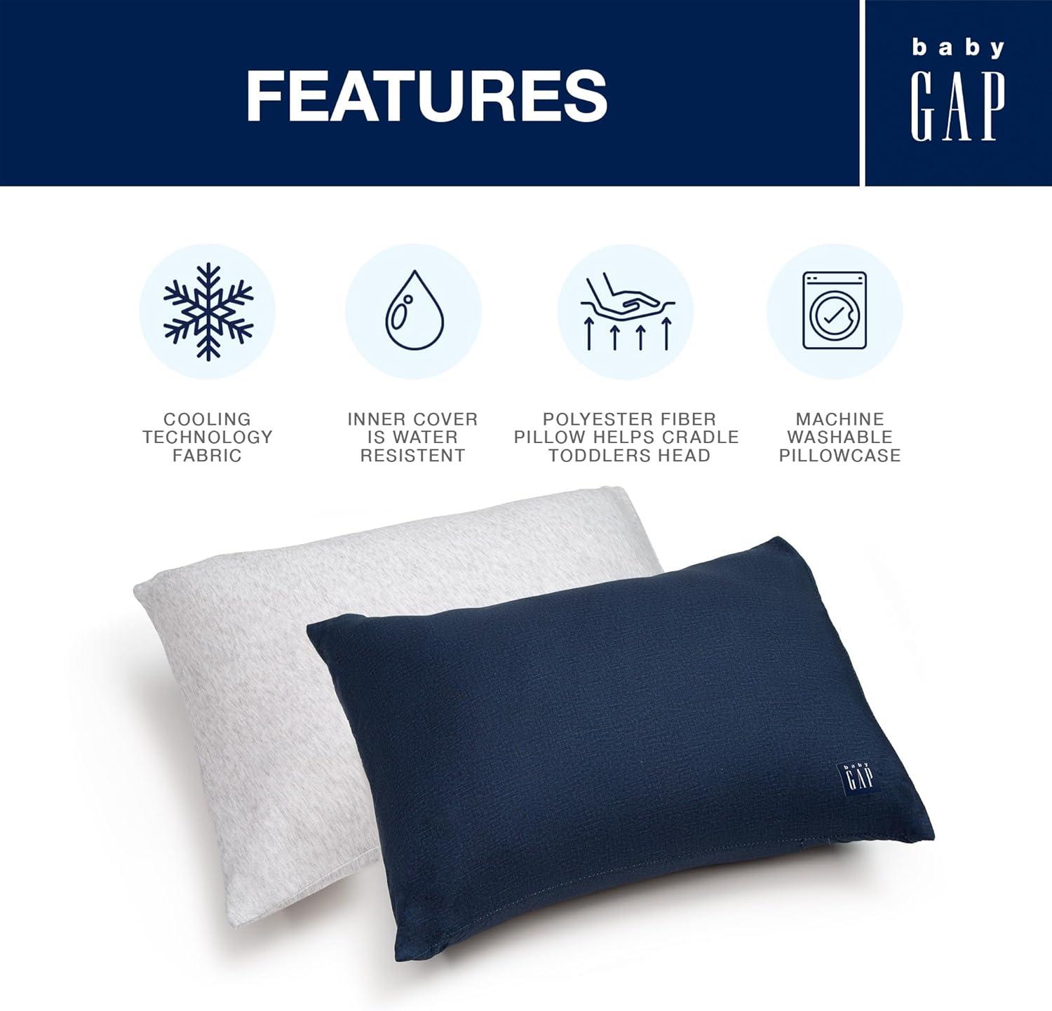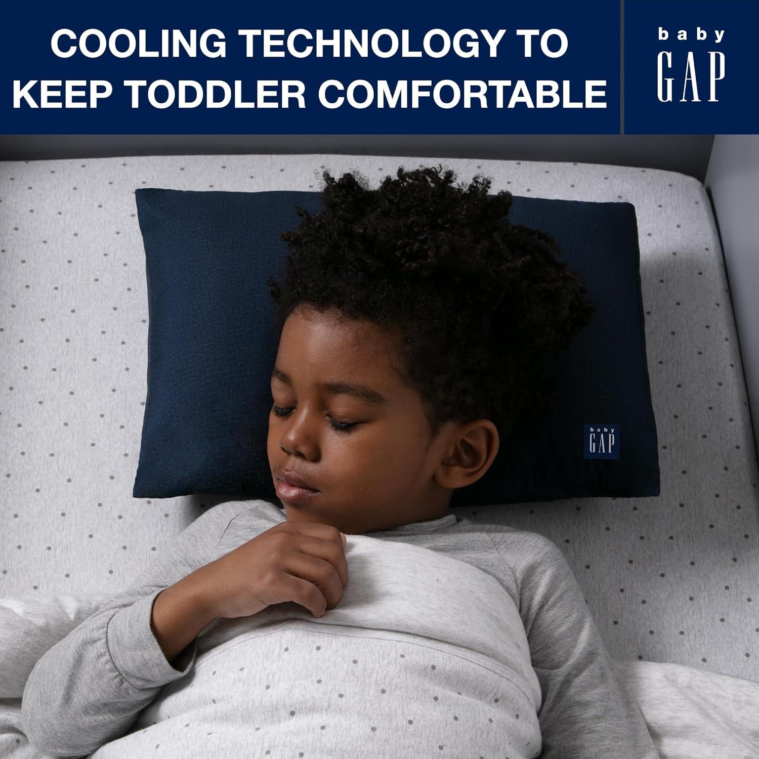 Sweet dreams are made of this babyGap by Delta Children Memory Foam Toddler Pillow with 2 Cooling Covers. Perfectly sized to cradle a toddler's head with its memory foam construction, this thoughtfully designed pillow features a water-resistant inner cover and two fully removable, machine-washable cooling pillowcases. The memory foam core helps target pressure point relief for a more restorative sleep while the included cooling covers help keep your child’s sleep environment cool, dry, and comfortable with their cooling fiber construction. Ensure your little one will wake up well rested each day with the babyGap by Delta Children Memory Foam Toddler Pillow with 2 Cooling Covers.