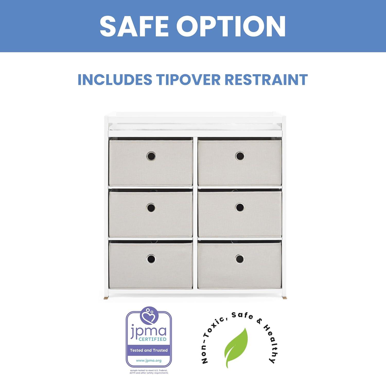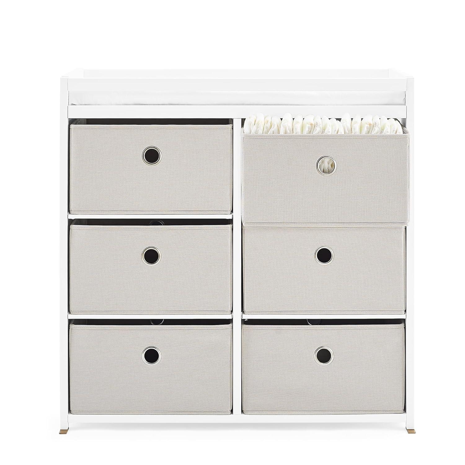 VERSATILE STORAGE: This changing table features 3 shelves with 6 fabric bins to keep baby changing needs close by | Bins have 2 metal grommets to pull out or carry around | Changing Pad sold separately | To ensure safety and the perfect fit, pair your changing table with a Serta, Beautyrest or Simmons Kids contour pad