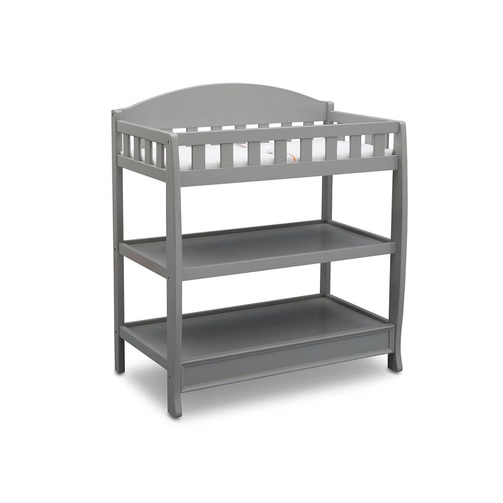 Simplistic in detail and ready for the job, this easy-to-coordinate changing table has a strong and sturdy wood construction, and comes in several popular finishes. It features clean lines and a fully enclosed dressing area for extra security. Two spacious open shelves are ideal for all the diapers, wipes, creams and toys you'll need to get through all those changes. A changing pad is included. Assembly is required. Imported from Asia