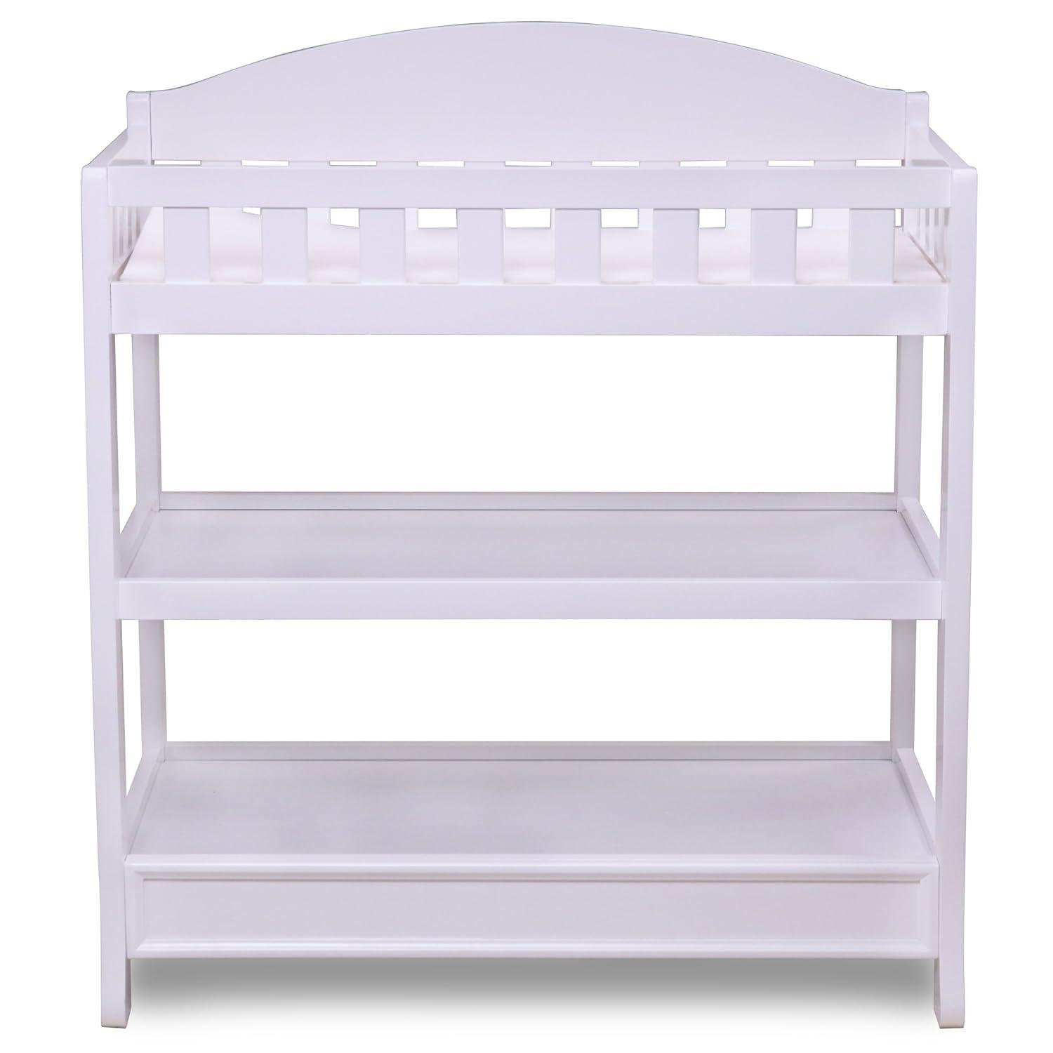 Simplistic in detail and ready for the job, this easy-to-coordinate changing table has a strong and sturdy wood construction, and comes in several popular finishes. It features clean lines and a fully enclosed dressing area for extra security. Two spacious open shelves are ideal for all the diapers, wipes, creams and toys you'll need to get through all those changes. A changing pad is included. Assembly is required. Imported from Asia