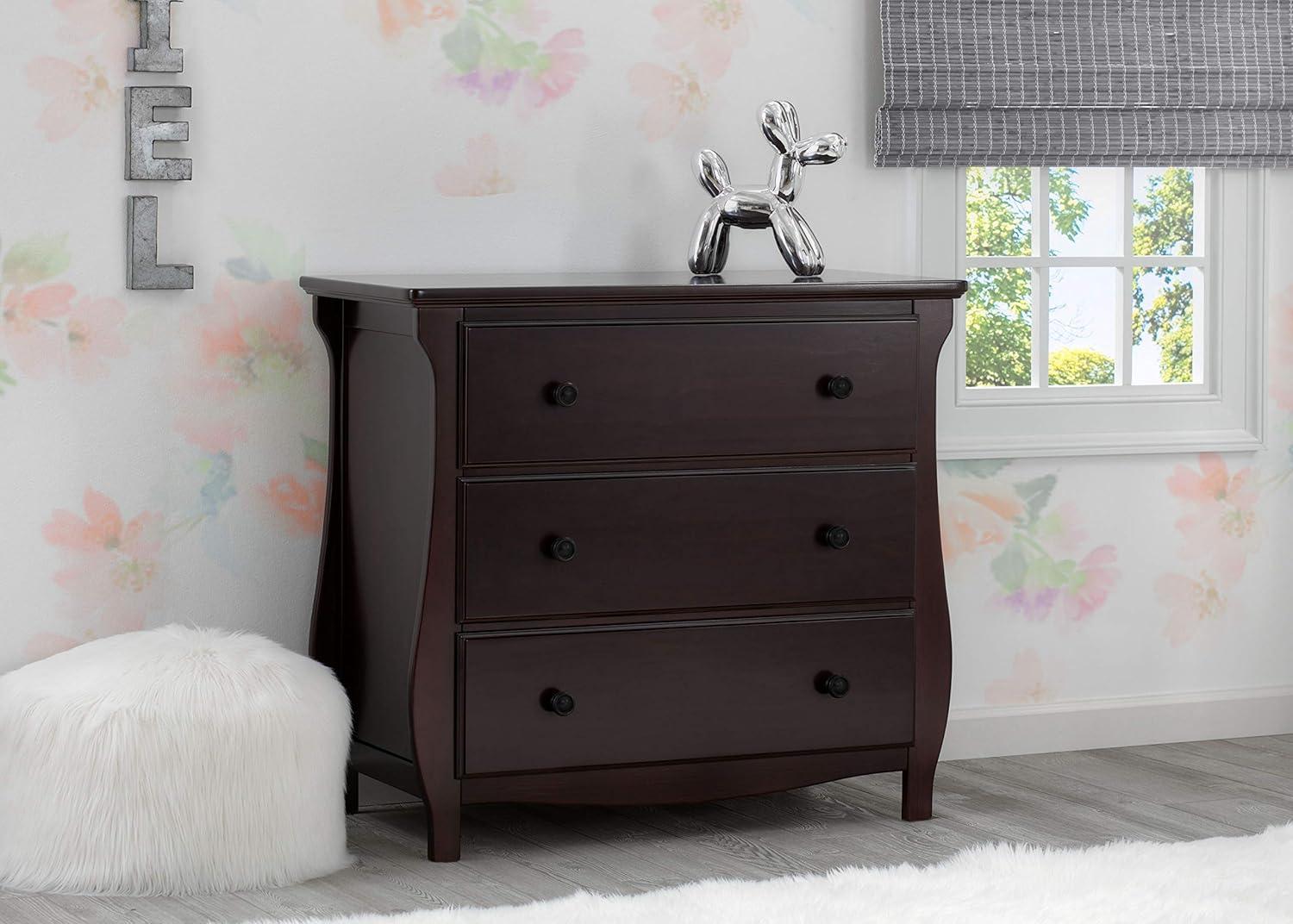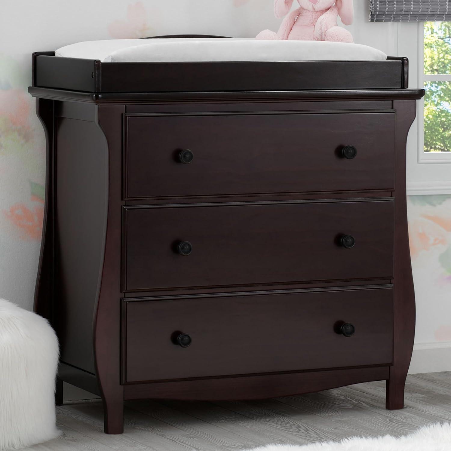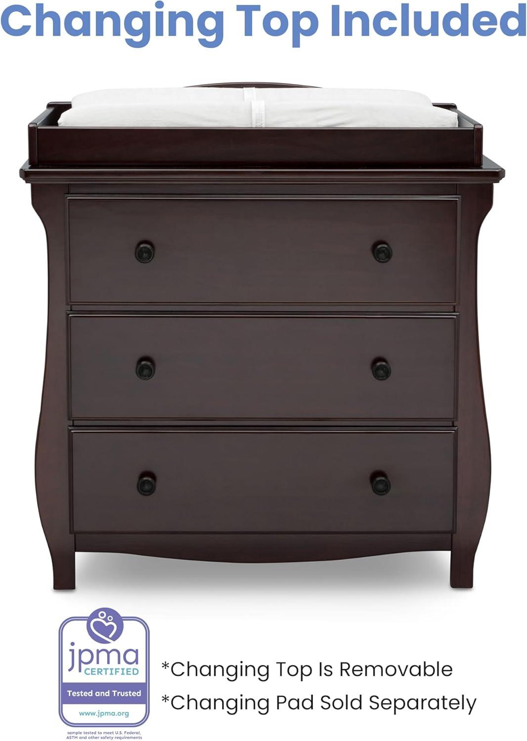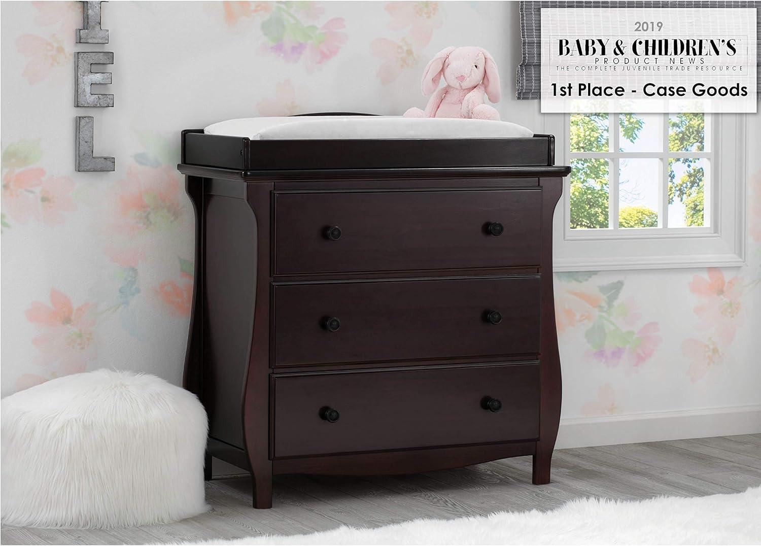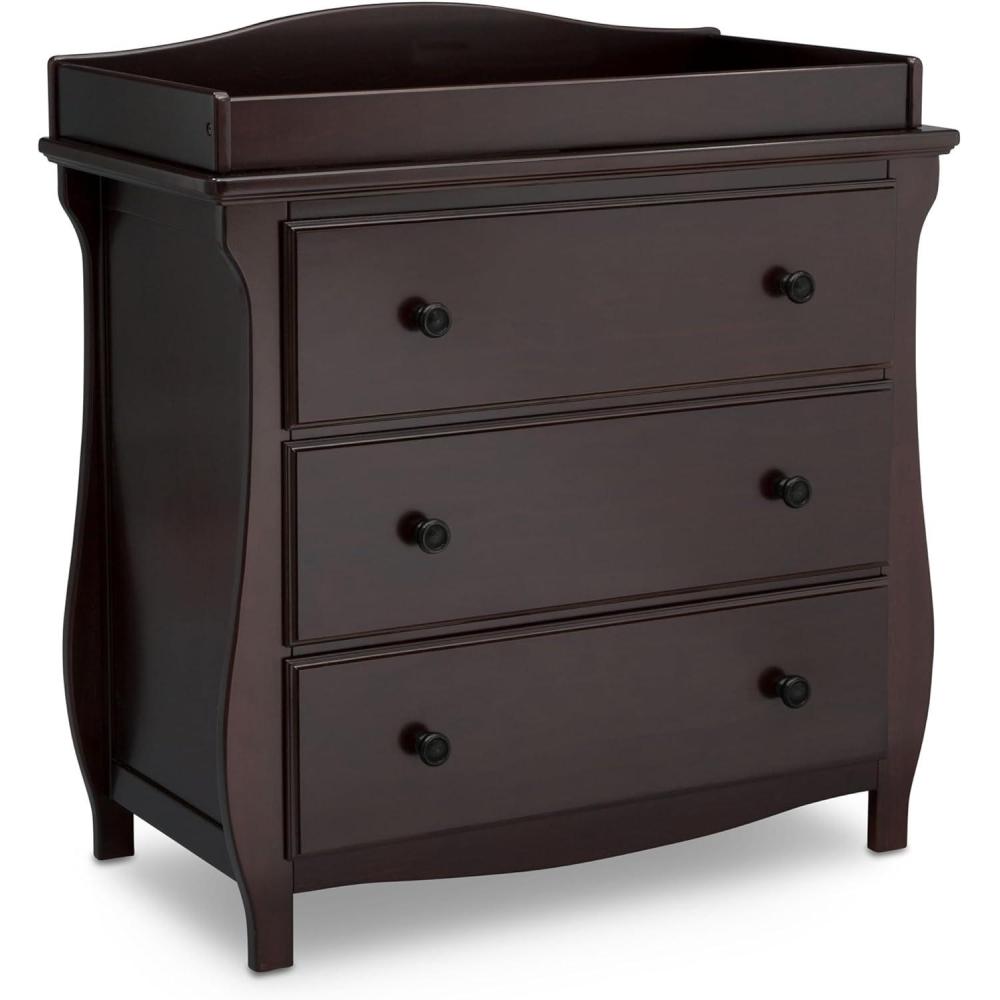Elegant silhouette, graceful accents, functional design: these elements come together to create the Lancaster 3 Drawer Dresser with Changing Top and Interlocking Drawers by Delta Children. Both polished and inviting, this versatile dresser will accommodate all your child's storage and changing needs. The removable changing topper makes it easy to use the dresser as a changing table, and when your child outgrows the need for a changer, simply remove the topper. The dresser's sleigh-style silhouette and swooping apron add charm. A smart choice for storage in any space, this dresser is outfitted with an interlocking drawer system that limits the number of drawers that can be opened at one time. Plus, it’s GREENGUARD Gold Certified, which means it’s built to contribute to cleaner air for a healthy home. Available in Grey, Bianca White and Dark Chocolate. Coordinates with other items in the Lancaster Collection from Delta Children.