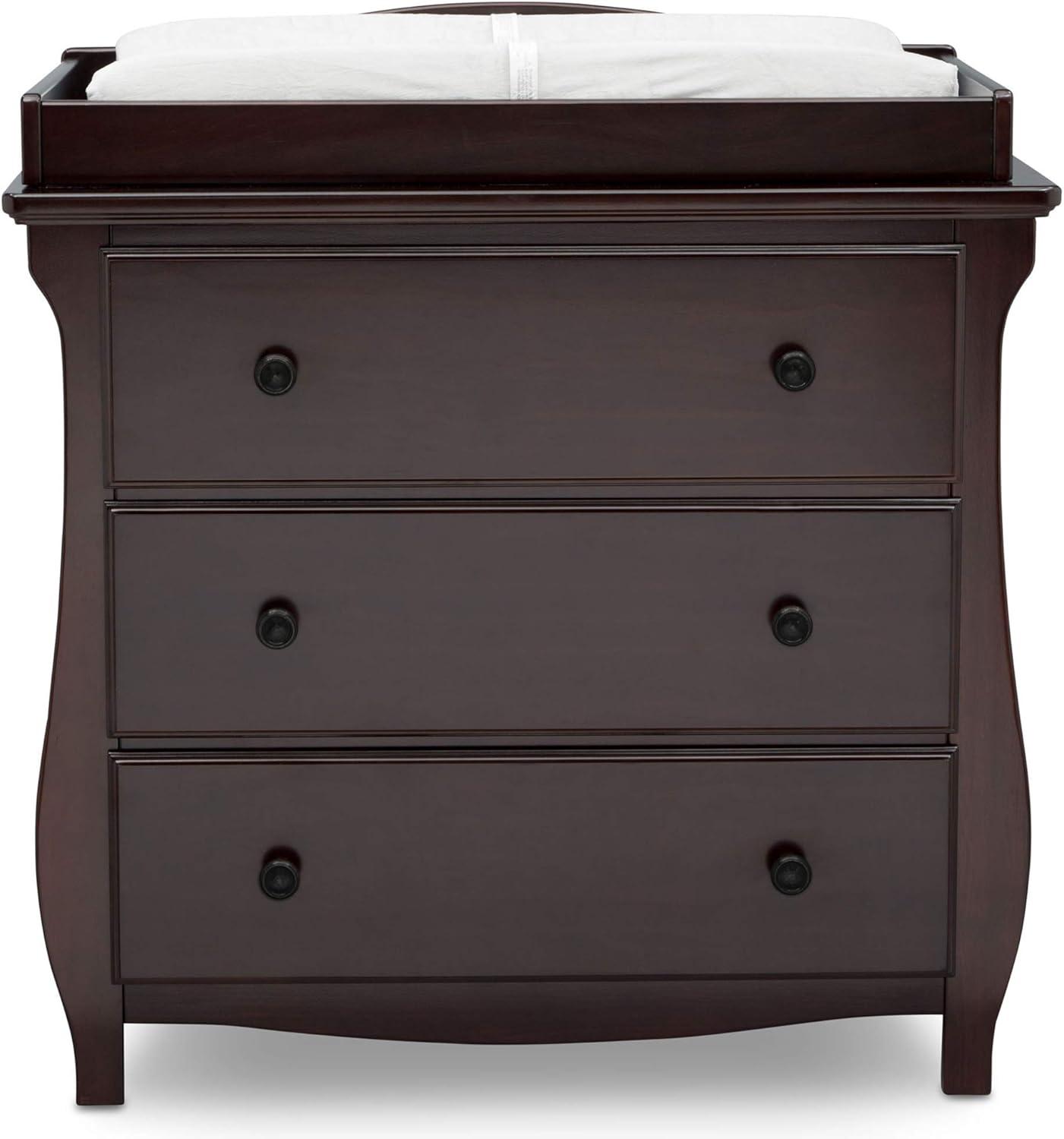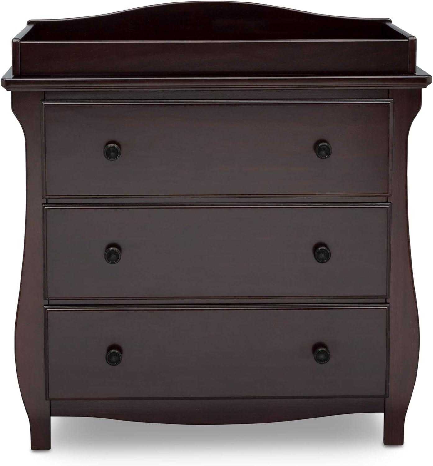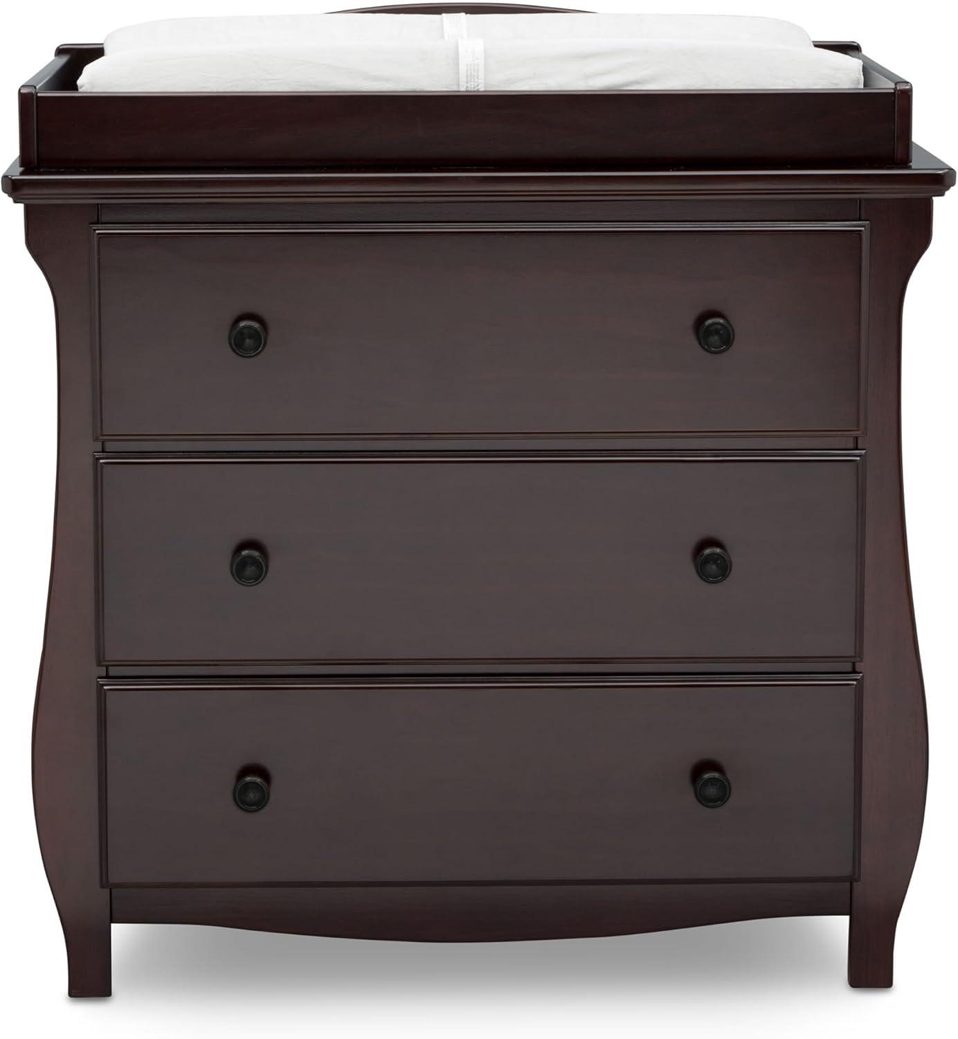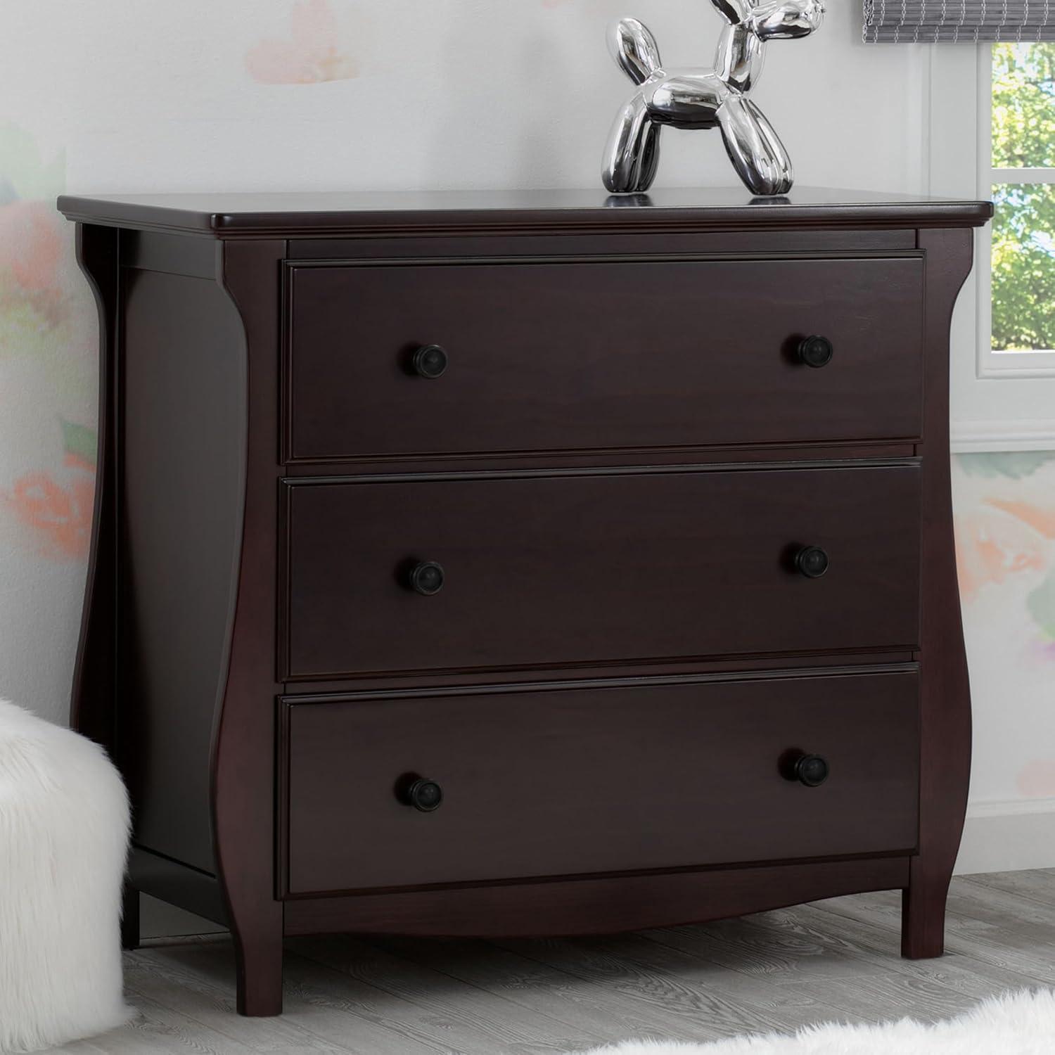 Elegant silhouette, graceful accents, functional design: these elements come together to create the Lancaster 3 Drawer Dresser with Changing Top and Interlocking Drawers by Delta Children. Both polished and inviting, this versatile dresser will accommodate all your child's storage and changing needs. The removable changing topper makes it easy to use the dresser as a changing table, and when your child outgrows the need for a changer, simply remove the topper. The dresser's sleigh-style silhouette and swooping apron add charm. A smart choice for storage in any space, this dresser is outfitted with an interlocking drawer system that limits the number of drawers that can be opened at one time. Plus, it’s GREENGUARD Gold Certified, which means it’s built to contribute to cleaner air for a healthy home. Available in Grey, Bianca White and Dark Chocolate. Coordinates with other items in the Lancaster Collection from Delta Children.