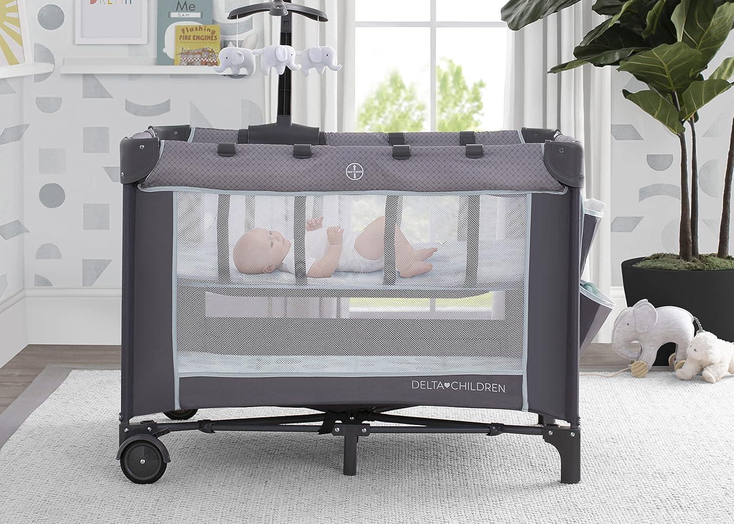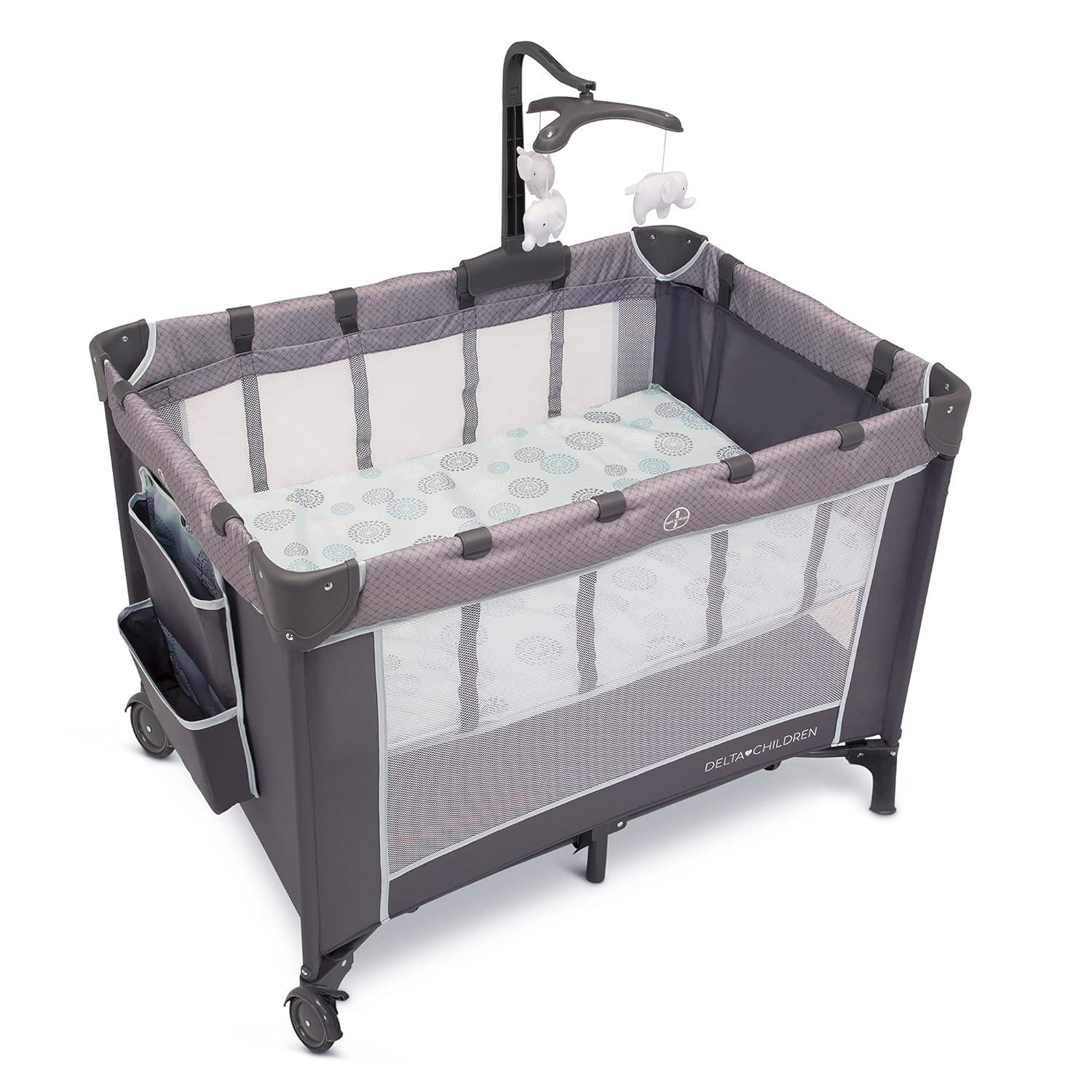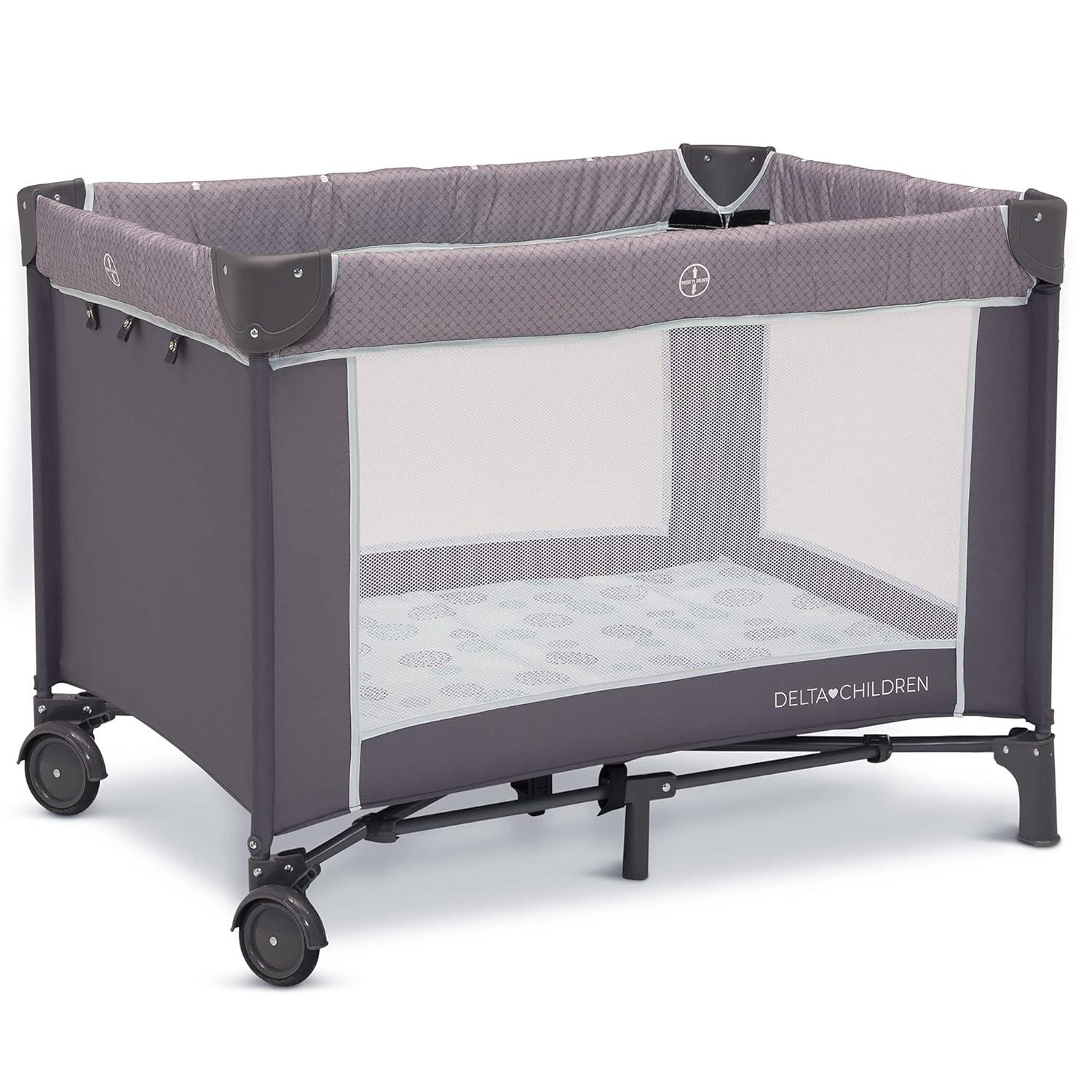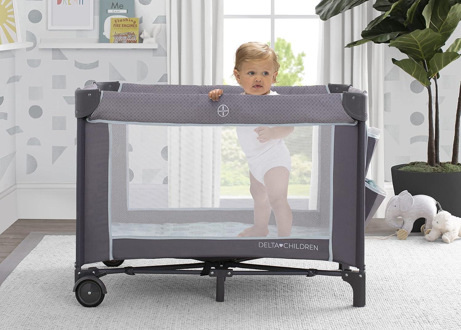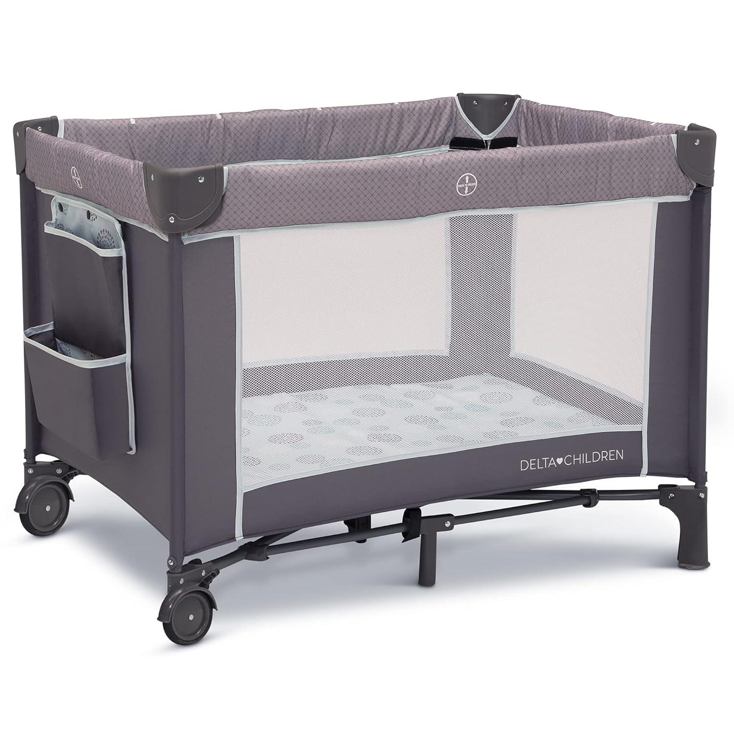 Keep your baby safe, close and comfy with the LX Deluxe Play Yard from Delta Children. You'll love all the convenient features-the removable bassinet provides the ideal spot for naptime or bedtime, and the removable changing table means you'll always have a sturdy place to change diapers or dress your baby. The detachable storage compartment keeps changing necessities nearby, so you never have to run to another room for diapers or wipes. When your baby outgrows the bassinet, the insert is removable and the LX Deluxe Play Yard functions like a full size playard. Large mesh sides provide optimal ventilation while also permitting a clear view. Designed to use at home or away, the play yard's wheels make it super-easy to move around the house, and the quick fold construction and included carry bag make for fuss-free travel. The LX Deluxe Play Yard from Delta Children features everything needed for a nursery in a portable design. Delta Children was founded around the idea of making safe, high-quality children's furniture affordable for all families. They know there's nothing more important than safety when it comes your child's space. That's why all Delta Children products are built with long-lasing materials to ensure they stand up to years of jumping and playing. Plus, they are rigorously tested to meet or exceed all industry safety standards.