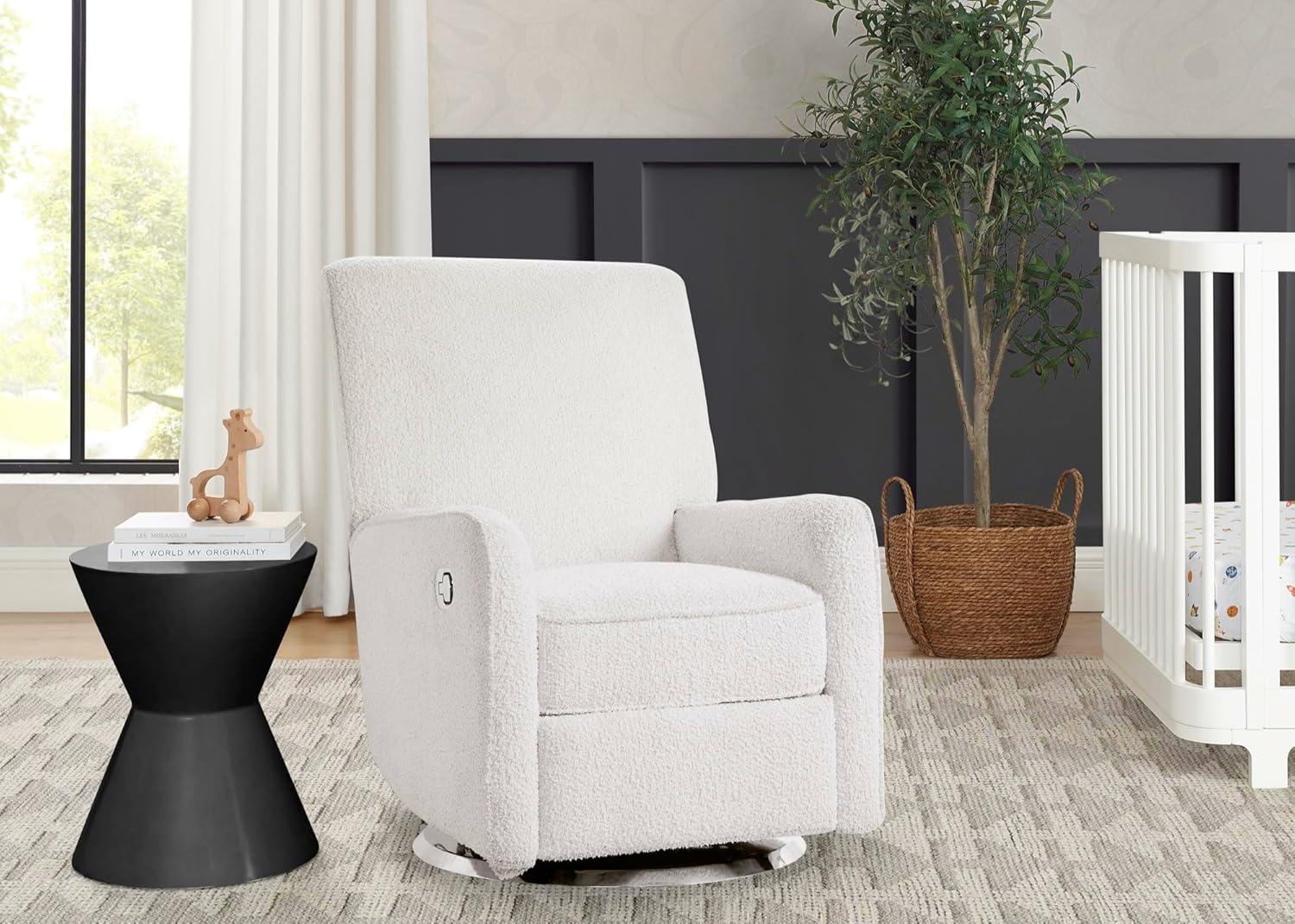 Rest and recline in ultimate comfort as you bond with your baby in the Nest Nursery Swivel Recliner by Delta Children. Expertly crafted with a durable wood frame for enduring quality, this cozy chair features two recline positions (footrest up only and footrest up with back reclined), plus a whisper quiet 360-degree swivel motion, so you won't disrupt your little one's sleep while you get comfortable. The chic design features metallic chrome base, matching pull tab and is upholstered in chenille yarn for blanket like softness. Plus, the fabric is GREENGUARD Gold Certified and OEKO-TEX STANDARD 100, which means it’s built to contribute to healthier indoor air.