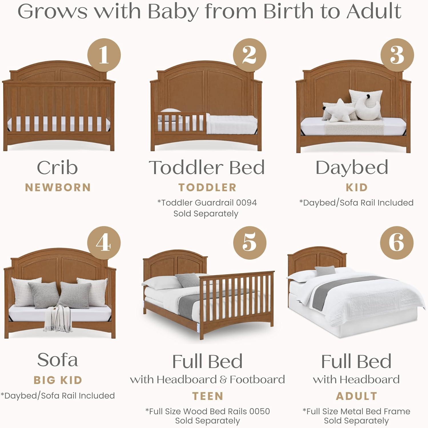 6-IN-1 CONVERTIBLE CRIB: Crib converts to a toddler bed, daybed, sofa, full size bed with headboard and footboard and a full size bed with headboard only (Daybed/Sofa Rail included; Toddler Guardrail #0094 and Full Size Rails #0050 sold separately)
