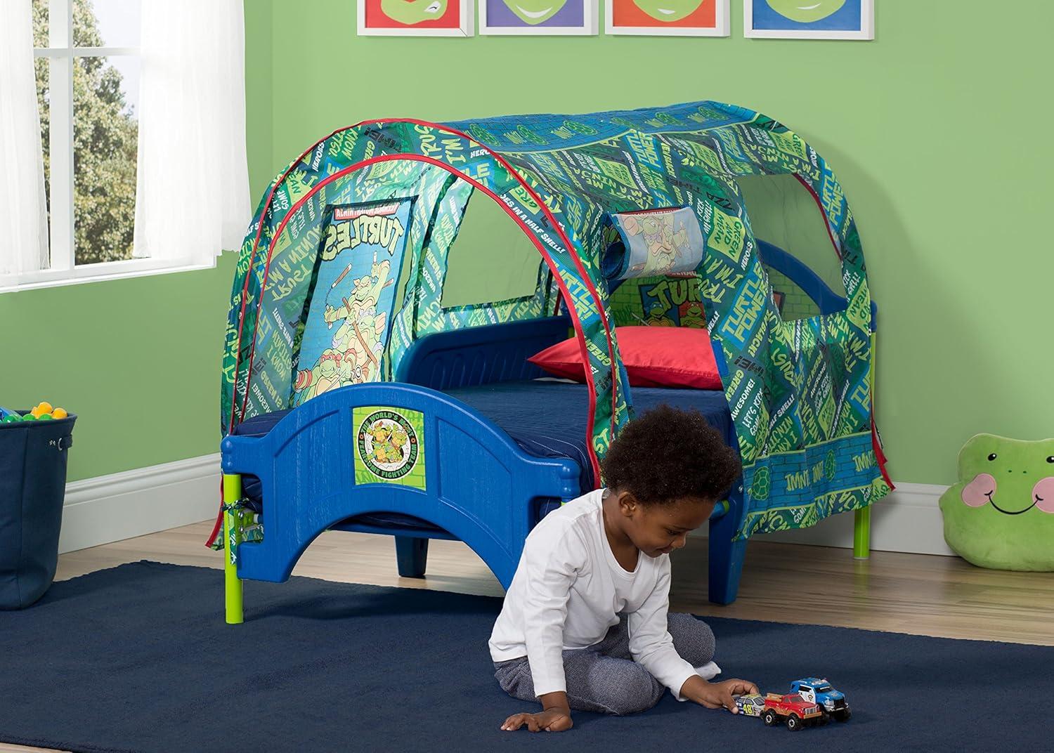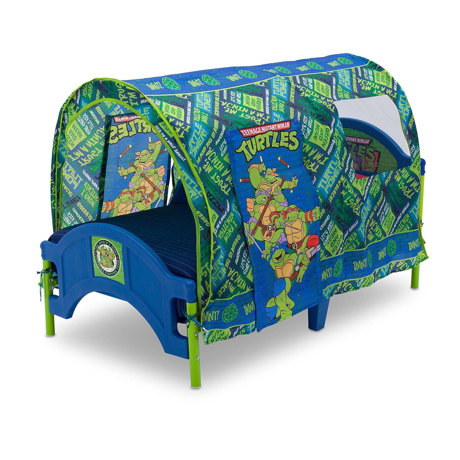 The perfect beginning to a heroic room, the Nickelodeon Teenage Mutant Ninja Turtles Toddler Tent Bed by Delta Children evokes the spirit and appeal of everyone's favorite turtles, Leonardo, Raphael, Donatello and Michelangelo. The tent sits above a sturdy toddler bed, with a mesh window and a roll up door on either side.