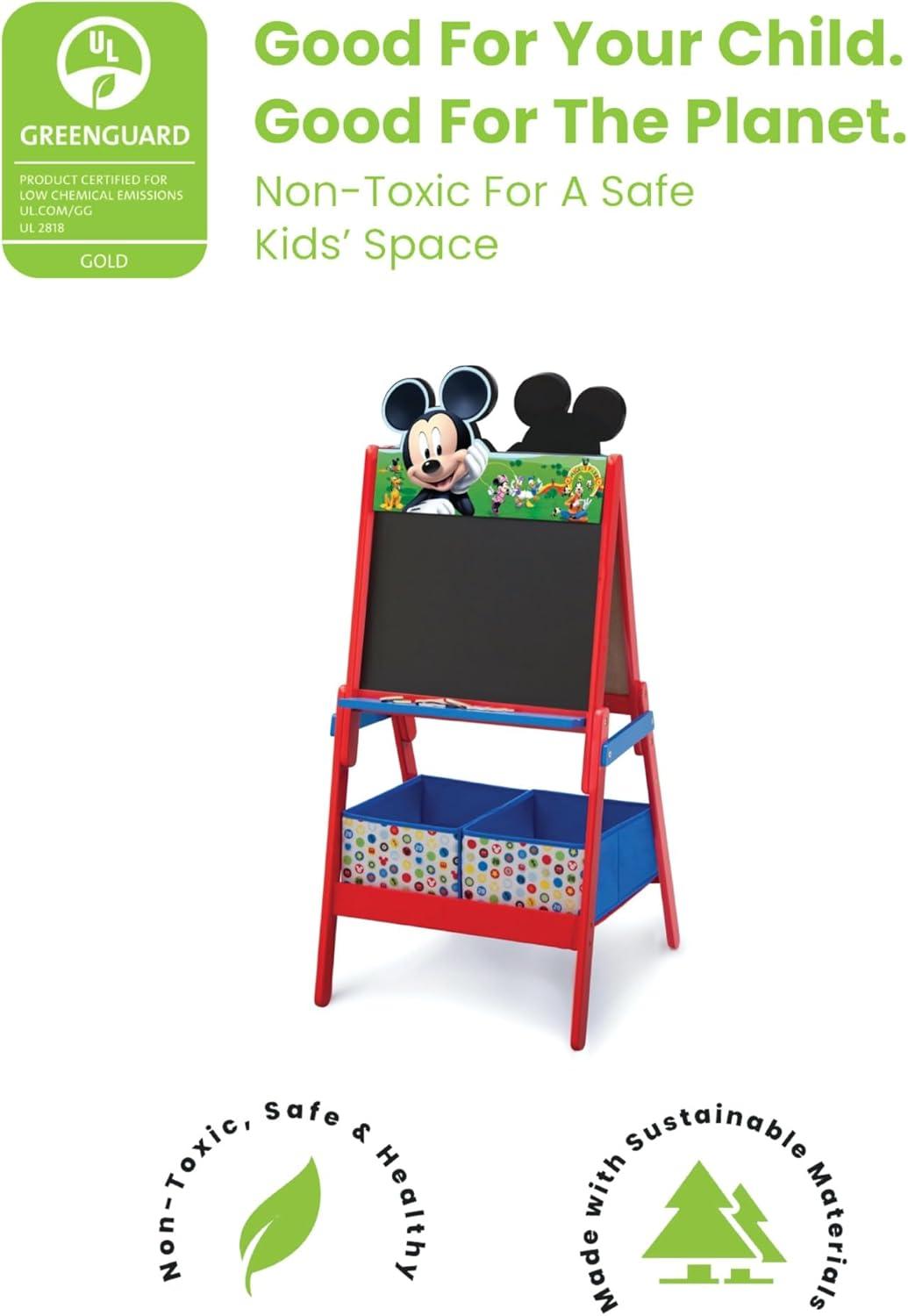 WHAT’S INCLUDED: This Mickey Mouse Easel for kids includes a chalkboard surface, magnetic dry-erase surface and two storage bins | 2-sided design is great for siblings or friends