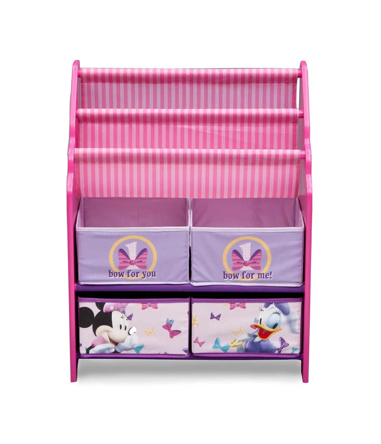 Bring a spot of color to your girl's bedroom or playroom with this Disney Minnie Mouse Book & Toy Organizer from Delta Children! Featuring four fabric bins and a two-tiered bookrack supported by a sturdy wood frame, it's finished with colorful illustrations of Minnie Mouse and her iconic polka dots.