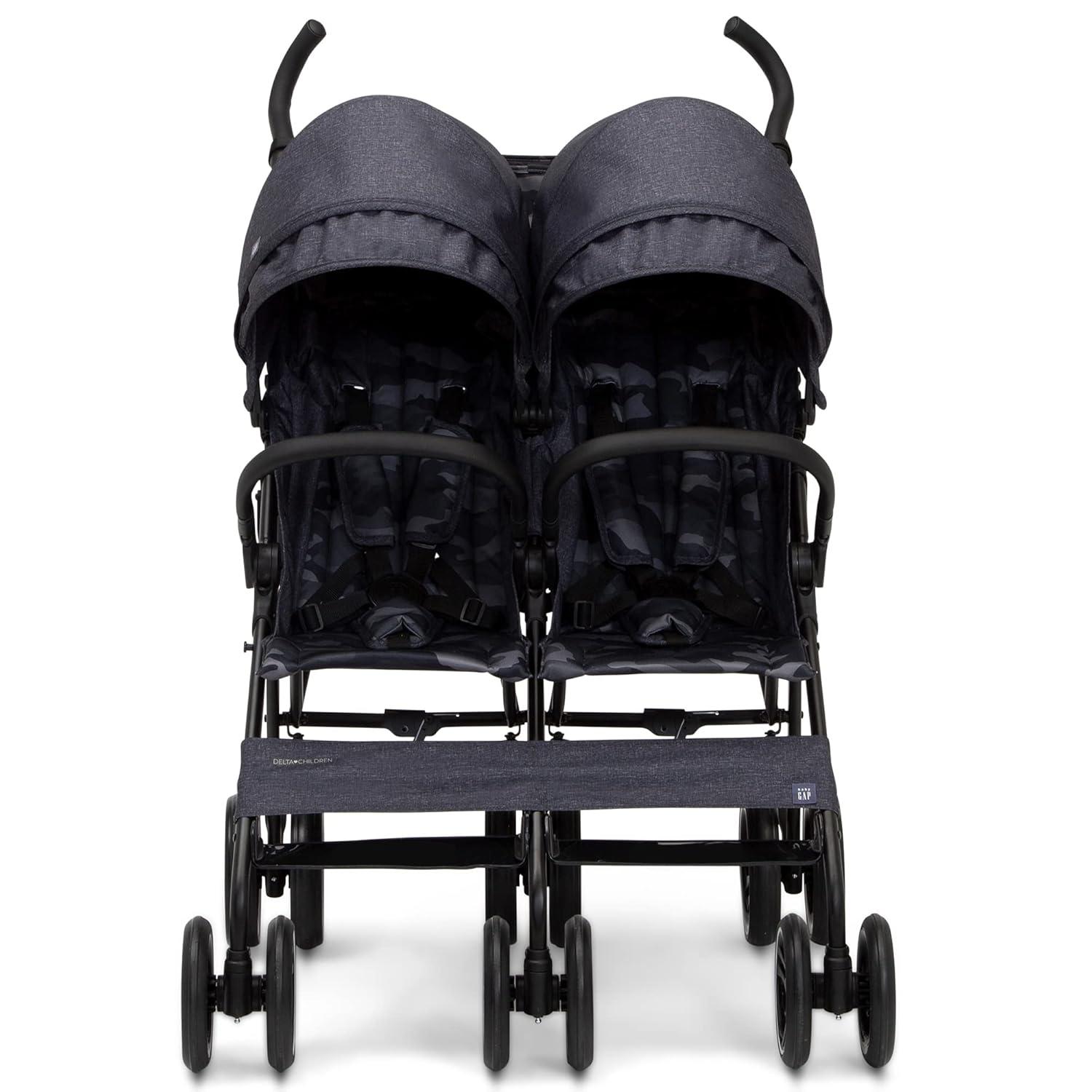 GAP babyGap Classic Side-by-Side Double Stroller - Lightweight Double Stroller with Recline, Extendable Sun Visors & Compact Fold - Made with Sustainable Materials, Grey Stripes(Black Camo)