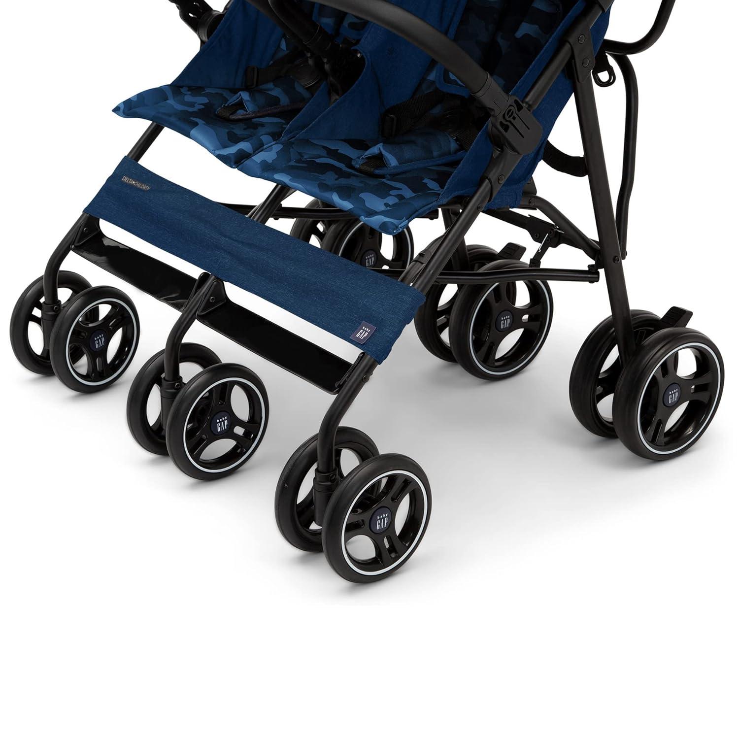 Introducing the babyGap Side-by-Side Double Stroller: The most responsibly made lightweight double stroller. Designed for the future in every possible way, all of the stroller’s soft fabric is made of recycled water bottles. Plastic drinking bottles are sorted, cleaned and shredded into flakes that become the yarn the seat fabric is made from. A great choice for your children and the planet, this everyday double stroller is outfitted with front wheels that features precision technology for outstanding control and effortless push, making it easier than ever to glide, turn and maneuver any surface. Incredibly cozy, the stroller has two extra-large extendable canopies, reclining seats and tons of storage. The extra-large storage pockets and removable parent organizer ensure there’s always enough room for your family’s on-the-go essentials. Ideal for travel or everyday use, the stroller’s durable steel frame only weighs 23 pounds and the compact fold, auto lock and carry handle make it easy to transport. Uniquely babyGap, the stroller has leatherette detailing on the handlebars and easily recognized babyGap logos and iconic Brannan Bear on the wheels, canopy, calf rest, parent organizer and safety harness for an elevated look. This double stroller is recommended for infants 9 months up to 35 pounds per seat (70 pounds total).