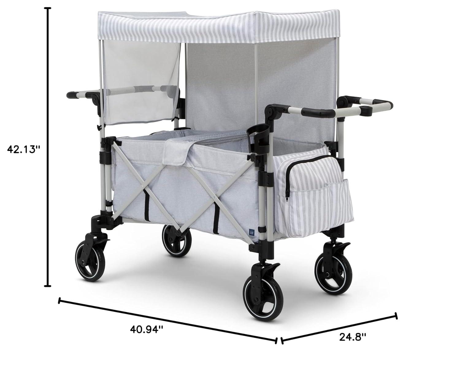 Introducing the babyGap Deluxe Explorer Wagon by Delta Children: The most responsibly made wagon. Designed for the future in every possible way, all the soft fabric is made from recycled water bottles. Plastic drinking bottles are sorted, cleaned and shredded into flakes that become the yarn the seat fabric is made from. A great choice for your child and the planet, this versatile wagon features two cushioned seats with three-point safety harnesses for security while the removable center console with two cup holders and storage pocket allows kids to share snacks, toys and drinks. Two additional cup holders for parents and side pockets ensure you can bring everything you need along for the adventure. The removable, UV blocking canopy and roll-down shades offer privacy and protection from the sun or rain. Easy to drive, it features swivel front wheels that allow you to effortlessly turn and pivot, as well as push and pull leatherette handles with adjustable heights. The wagon’s compact fold makes it easy to store or transport. And when your children outgrow the need for a wagon, use it to haul your own gear at the farmers market, while gardening or the grocery store. Holds up to 110 lbs. (55 lbs. per seat). Weighs 38 lbs. Recommended for ages 9 months up to 55 lbs.