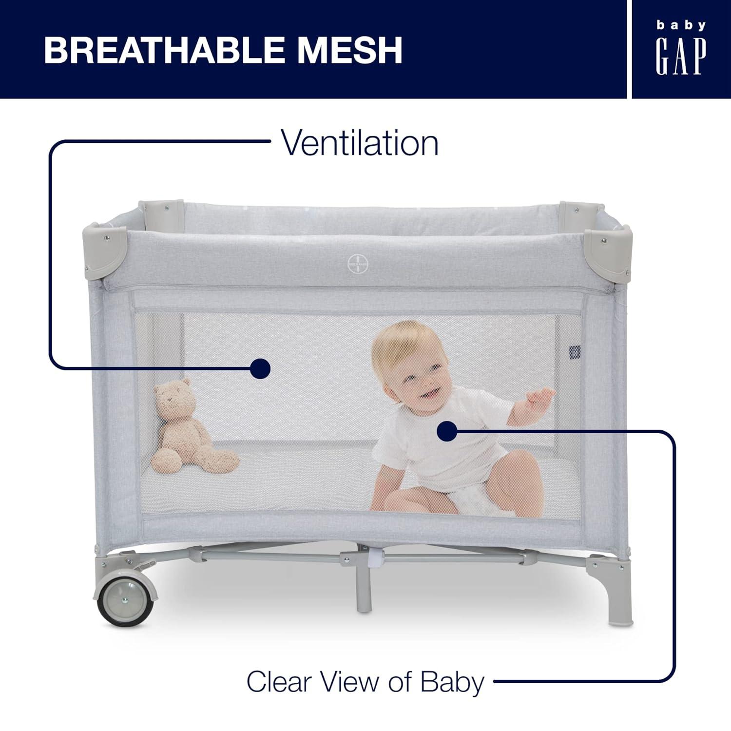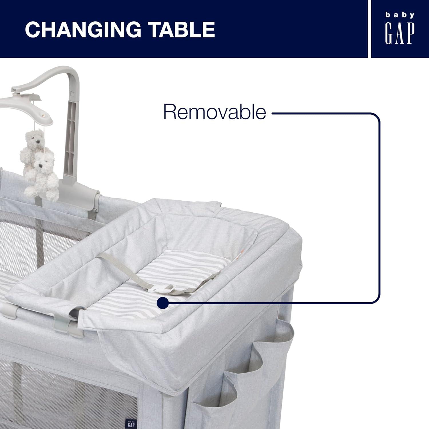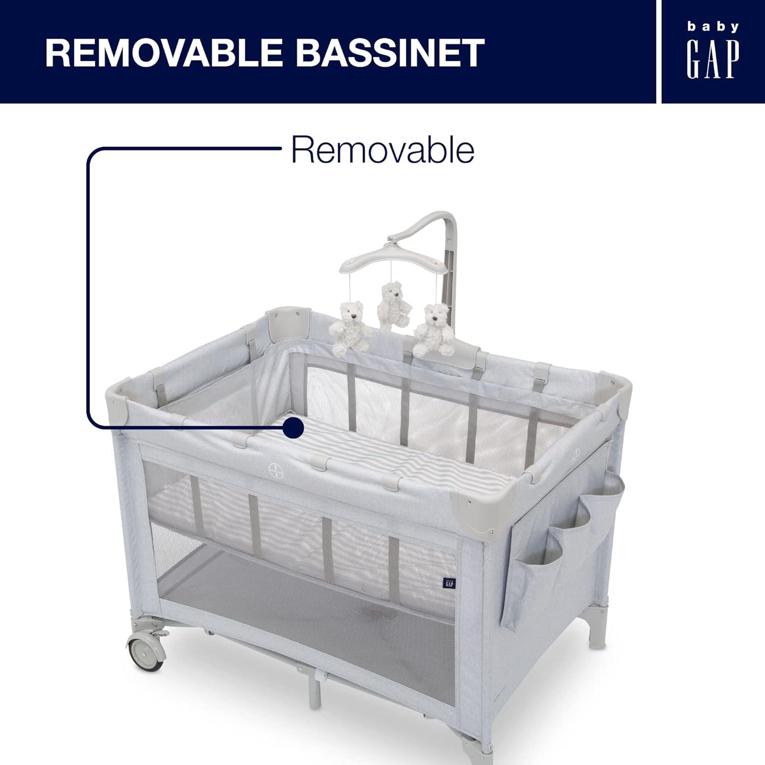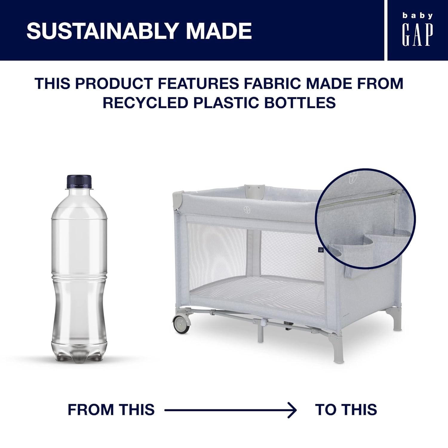 Introducing the babyGap Deluxe Play Yard by Delta Children: The most responsibly made play yard. Designed for the future in every possible way, all the fabric is made from recycled water bottles. Plastic drinking bottles are sorted, cleaned and shredded into flakes that become the yarn the seat fabric is made from. A great choice for your child and the planet, this play yard is the ideal spot for naptime or bedtime, and the removable changing table means you'll always have a sturdy place to change diapers or dress your baby. A removable toy arm with three plush Brannan Bear engages early visual development. The detachable storage compartment keeps changing necessities nearby, so you never have to run to another room for diapers or wipes. When your baby outgrows the bassinet, the insert is removable and the babyGap Deluxe Play Yard functions like a full-size play yard. Extra-large, breathable mesh sides provide optimal ventilation while also delivering a clear view of your little one. Designed to use at home or away, the play yard's wheels make it super-easy to move around the house, and the quick fold construction and included carry bag make for fuss-free travel. The babyGap Deluxe Play Yard features everything needed for a nursery in a portable design.