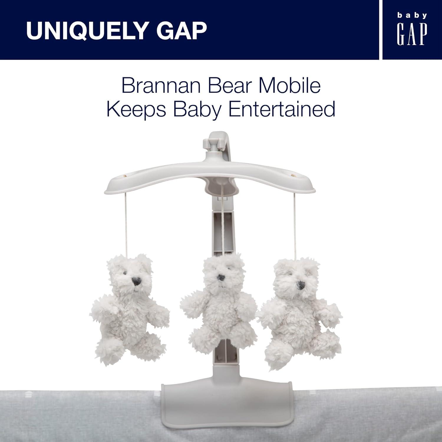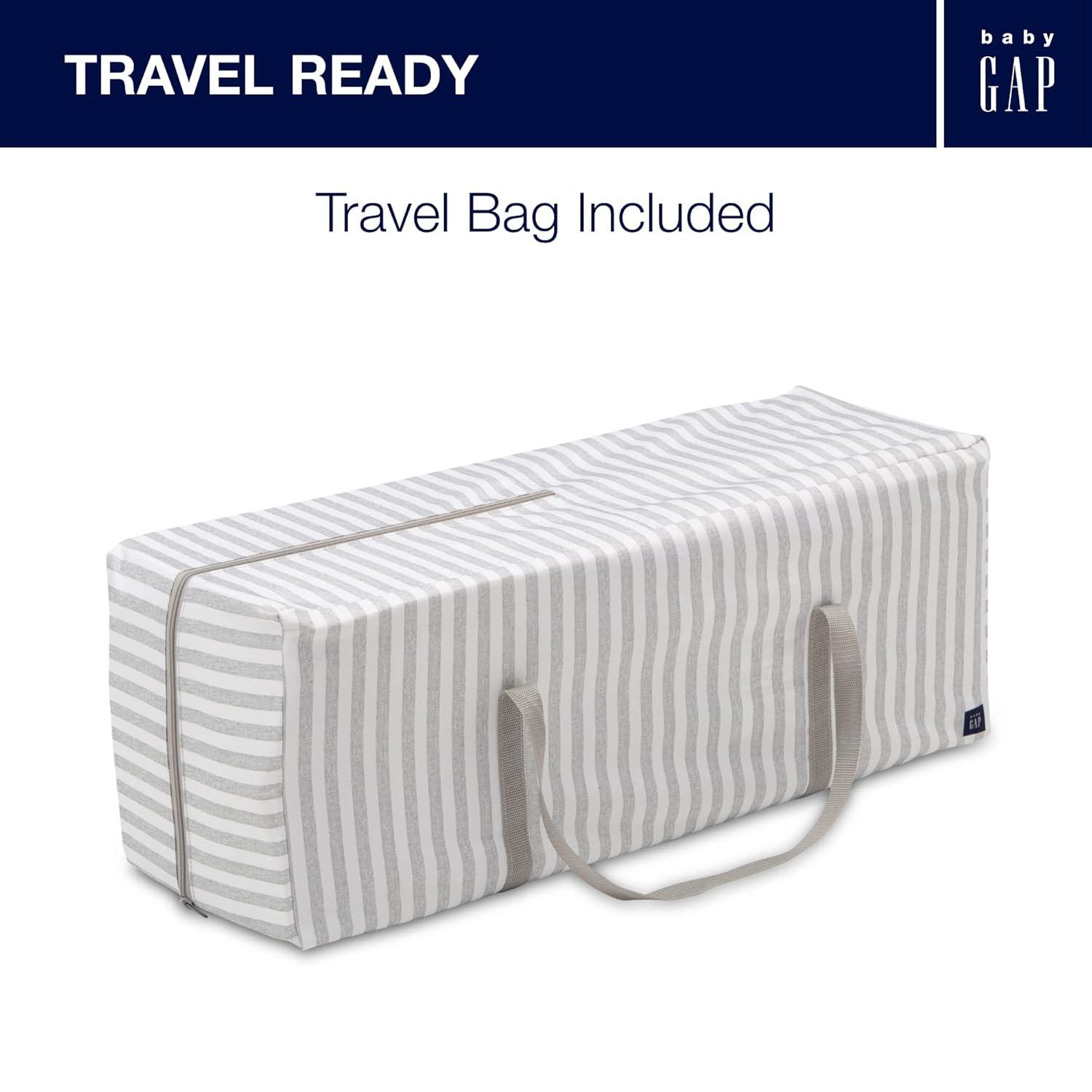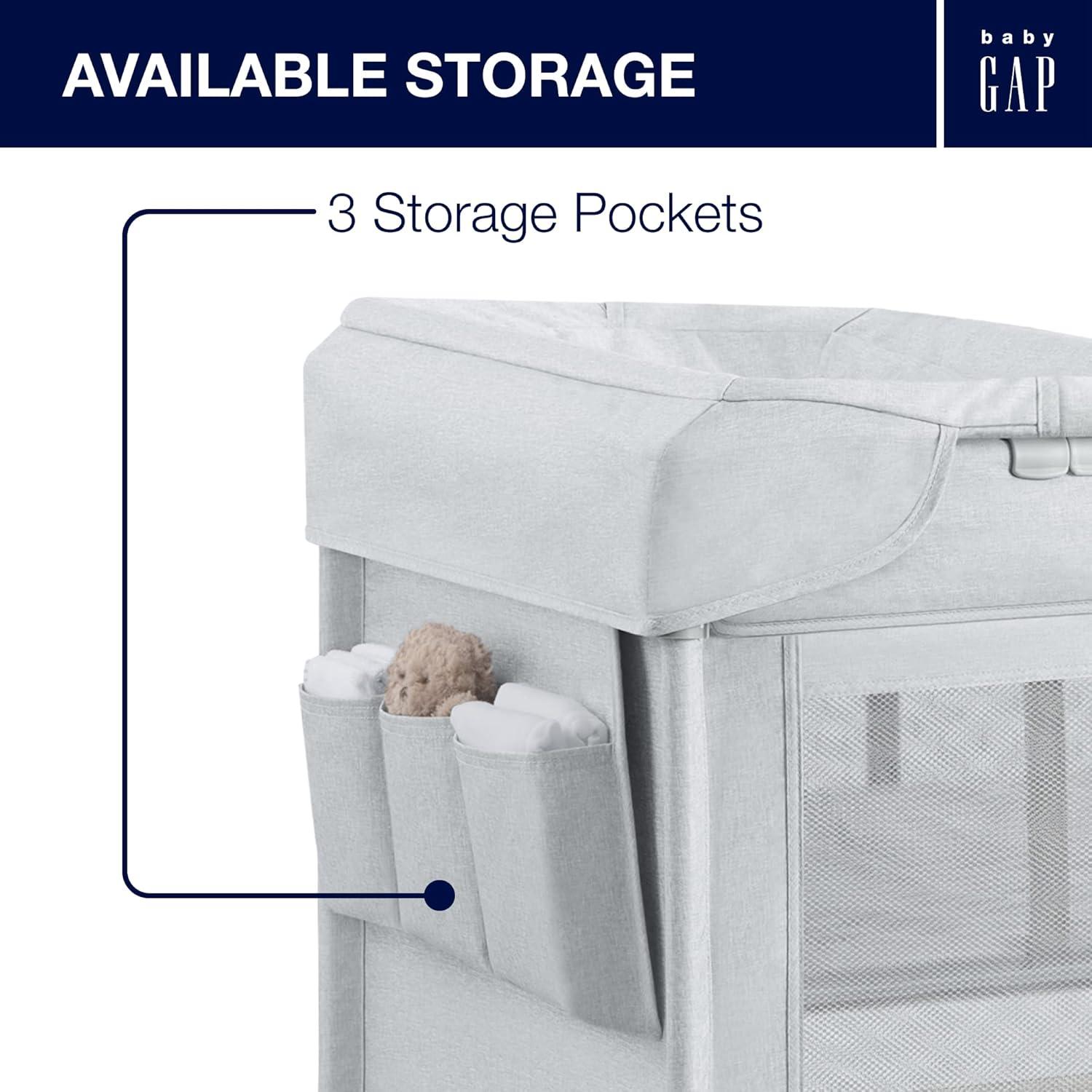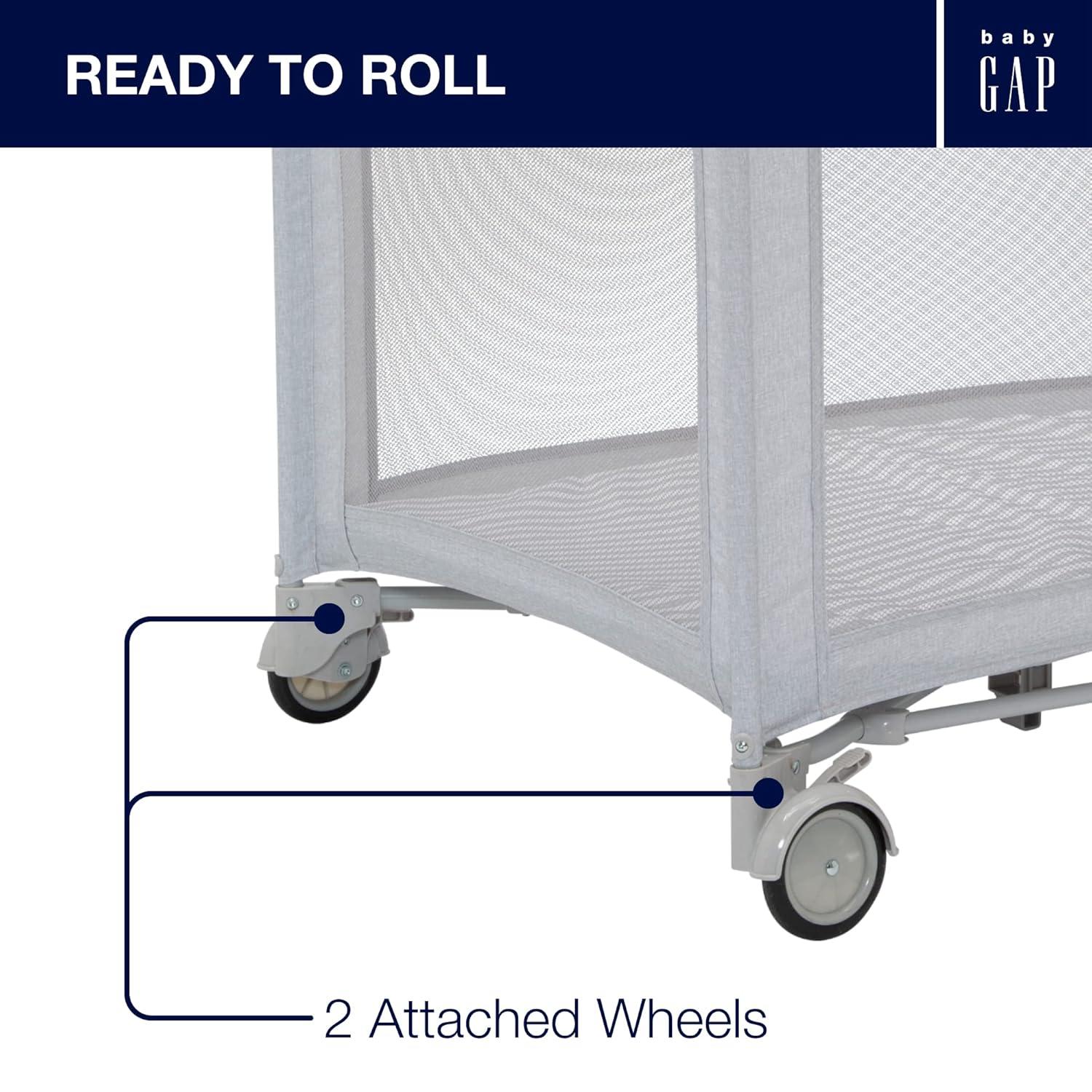 Introducing the babyGap Deluxe Play Yard by Delta Children: The most responsibly made play yard. Designed for the future in every possible way, all the fabric is made from recycled water bottles. Plastic drinking bottles are sorted, cleaned and shredded into flakes that become the yarn the seat fabric is made from. A great choice for your child and the planet, this play yard is the ideal spot for naptime or bedtime, and the removable changing table means you'll always have a sturdy place to change diapers or dress your baby. A removable toy arm with three plush Brannan Bear engages early visual development. The detachable storage compartment keeps changing necessities nearby, so you never have to run to another room for diapers or wipes. When your baby outgrows the bassinet, the insert is removable and the babyGap Deluxe Play Yard functions like a full-size play yard. Extra-large, breathable mesh sides provide optimal ventilation while also delivering a clear view of your little one. Designed to use at home or away, the play yard's wheels make it super-easy to move around the house, and the quick fold construction and included carry bag make for fuss-free travel. The babyGap Deluxe Play Yard features everything needed for a nursery in a portable design.