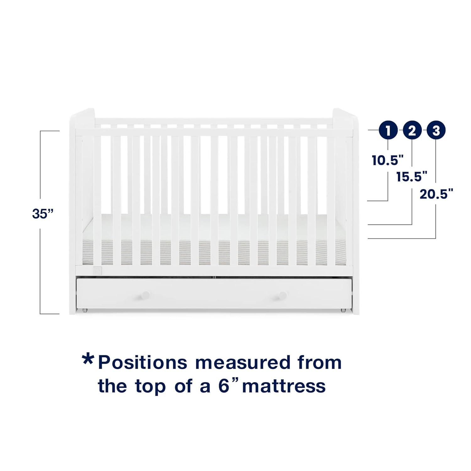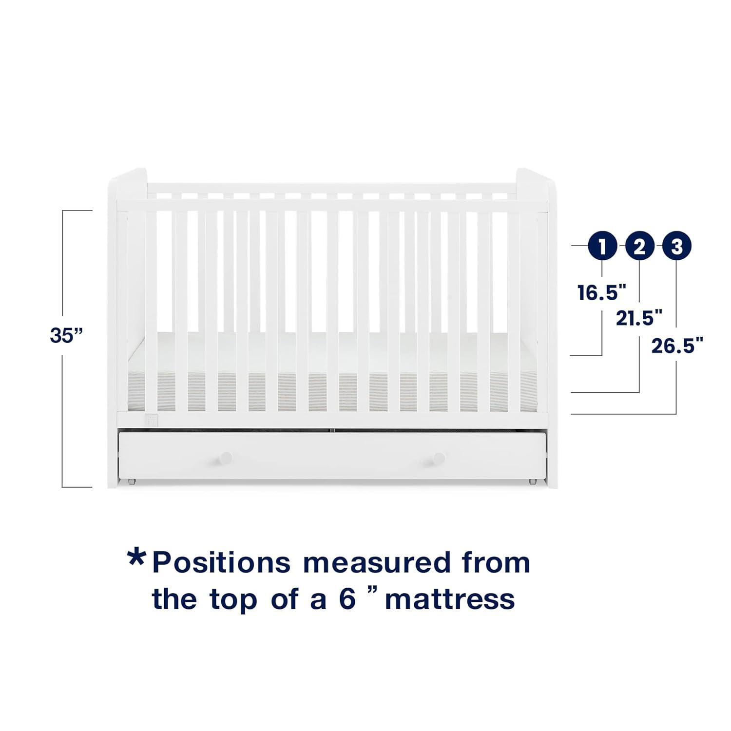 ADJUSTABLE HEIGHT: Adjustable height mattress support with 3 convenient positions to grow with your baby | ACCESS RAIL DIMENSIONS: From Floor: 35″; From Top Mattress Support Position: 16.50″; From Bottom Mattress Support Position: 26.50″