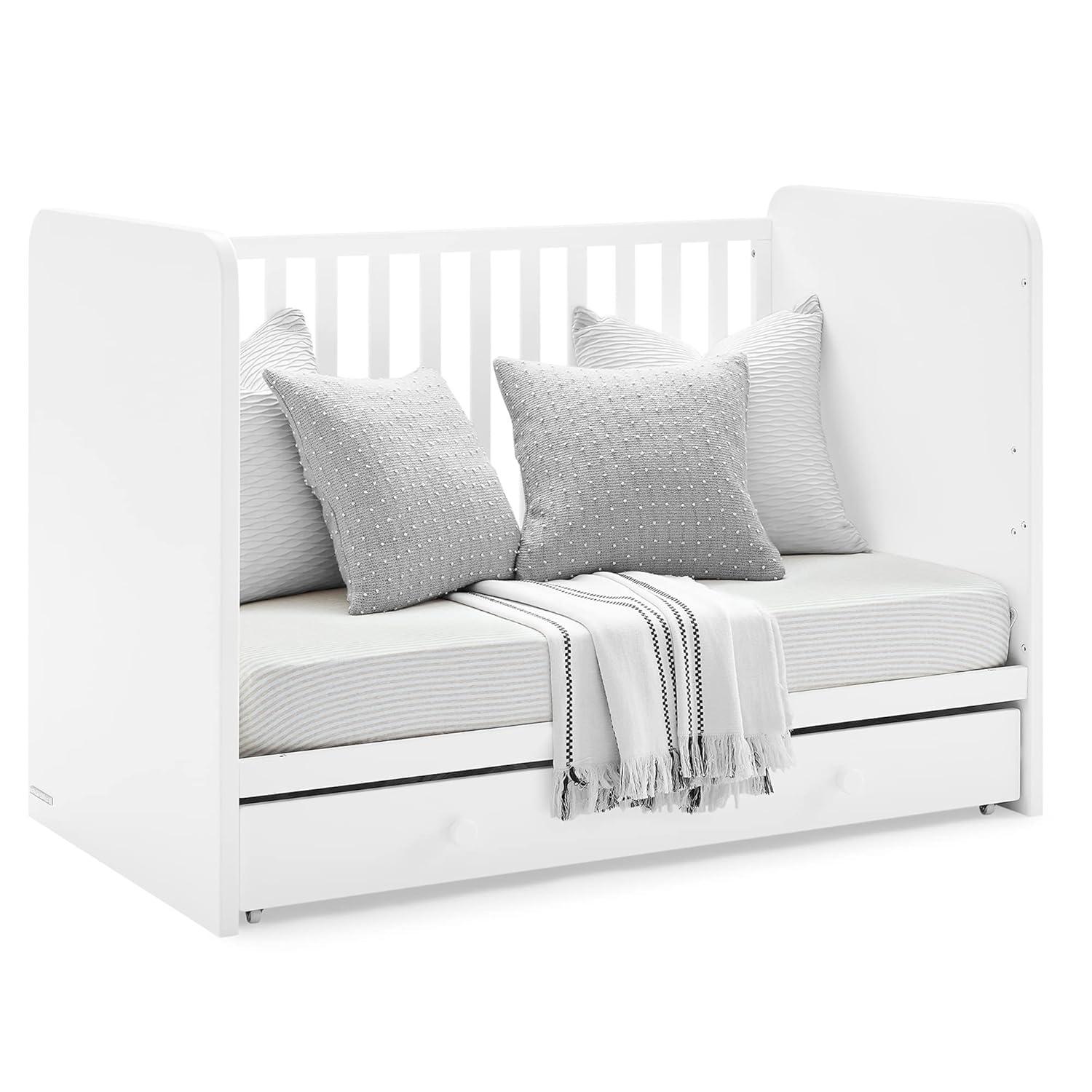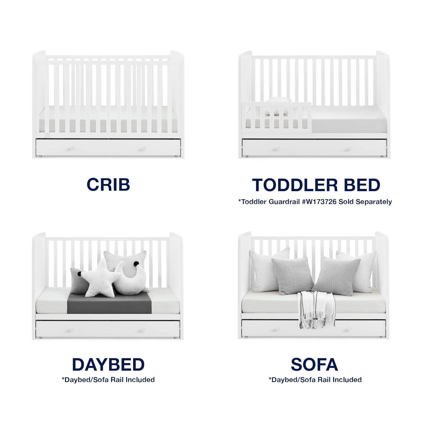 4-IN-1 CONVERTIBLE CRIB: Crib converts to a toddler bed, daybed and sofa (Toddler Guardrail #W173726 sold separately) | Available in Bianca White, Grey/Dark Grey Navy/Light Blue and Blush Pink/Dark Pink | Crib includes storage drawer | All colors feature a cool two-tone look with contrasting colored knobs (except the Bianca White color)