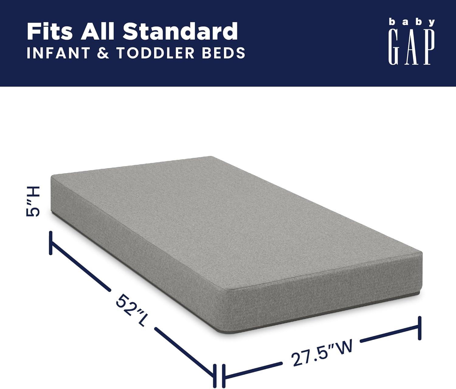 Unroll a good night’s sleep with this babyGap TrueSleep 2-Stage Deluxe Crib and Toddler Mattress! The advanced temperature regulating infused cover will helps your baby achieve their optimal temperature by pulling heat away from the body or releasing it back when needed, for a truly personalized sleep experience. The plant-based soy foam core delivers the firmness level babies need. Designed with two unique sleeping surfaces, the infant side is ideal for newborns while the toddler side features an extra layer of foam for additional comfort. Plus, it’s GREENGUARD Gold Certified, which means it’s built to contribute to cleaner air for a healthy home. This compressed baby mattress is shipped in a lightweight box that’s delivered safe and fast to your door—no need to go to the store! For optimal performance, open and unroll your mattress within 2 weeks of purchase. Once unpacked and fully expanded, zip the cover up. The cover is not intended to be removed and is not washable. Mattress may take up 48 hours to fully expand.