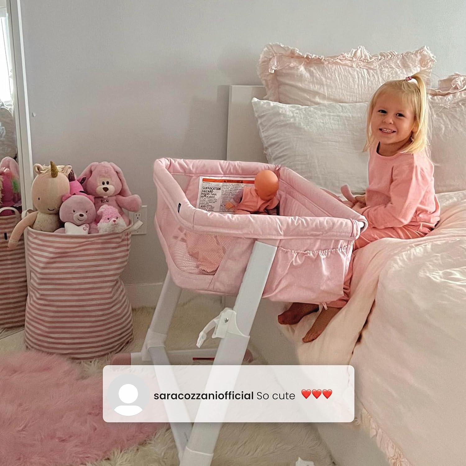 LIGHTWEIGHT + PORTABLE: Wheels for easy mobility | Weighs 22.5 lbs. | Size: 26.5”W x 30”D x 36”H; Bedside opening: 27”W | Includes waterproof mattress pad, fitted sheet and beside strap | Fitted sheet and bassinet cover are machine washable